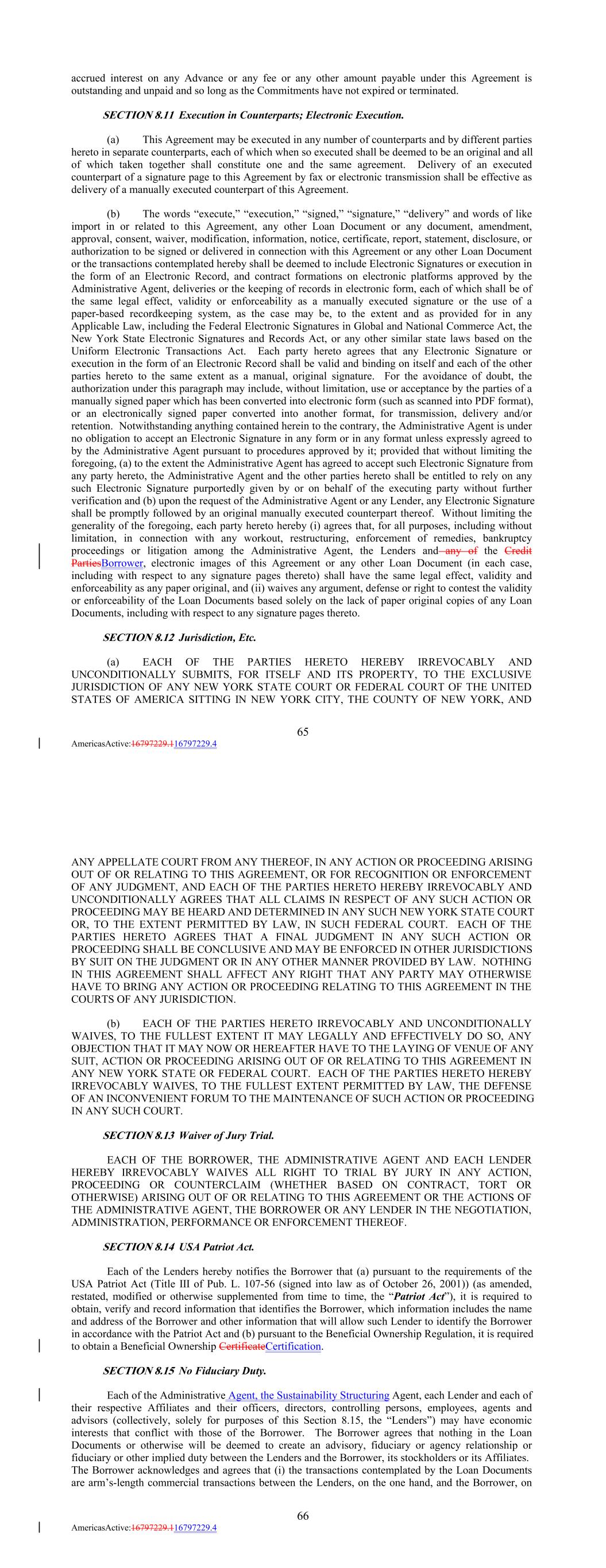 accrued interest on any Advance or any fee or any other amount payable under this Agreement is outstanding and unpaid and so long as the Commitments have not expired or terminated. SECTION 8.11 Execution in Counterparts; Electronic Execution. (a) This Agreement may be executed in any number of counterparts and by different parties hereto in separate counterparts, each of which when so executed shall be deemed to be an original and all of which taken together shall constitute one and the same agreement. Delivery of an executed counterpart of a signature page to this Agreement by fax or electronic transmission shall be effective as delivery of a manually executed counterpart of this Agreement. (b) The words “execute,” “execution,” “signed,” “signature,” “delivery” and words of like import in or related to this Agreement, any other Loan Document or any document, amendment, approval, consent, waiver, modification, information, notice, certificate, report, statement, disclosure, or authorization to be signed or delivered in connection with this Agreement or any other Loan Document or the transactions contemplated hereby shall be deemed to include Electronic Signatures or execution in the form of an Electronic Record, and contract formations on electronic platforms approved by the Administrative Agent, deliveries or the keeping of records in electronic form, each of which shall be of the same legal effect, validity or enforceability as a manually executed signature or the use of a paper-based recordkeeping system, as the case may be, to the extent and as provided for in any Applicable Law, including the Federal Electronic Signatures in Global and National Commerce Act, the New York State Electronic Signatures and Records Act, or any other similar state laws based on the Uniform Electronic Transactions Act. Each party hereto agrees that any Electronic Signature or execution in the form of an Electronic Record shall be valid and binding on itself and each of the other parties hereto to the same extent as a manual, original signature. For the avoidance of doubt, the authorization under this paragraph may include, without limitation, use or acceptance by the parties of a manually signed paper which has been converted into electronic form (such as scanned into PDF format), or an electronically signed paper converted into another format, for transmission, delivery and/or retention. Notwithstanding anything contained herein to the contrary, the Administrative Agent is under no obligation to accept an Electronic Signature in any form or in any format unless expressly agreed to by the Administrative Agent pursuant to procedures approved by it; provided that without limiting the foregoing, (a) to the extent the Administrative Agent has agreed to accept such Electronic Signature from any party hereto, the Administrative Agent and the other parties hereto shall be entitled to rely on any such Electronic Signature purportedly given by or on behalf of the executing party without further verification and (b) upon the request of the Administrative Agent or any Lender, any Electronic Signature shall be promptly followed by an original manually executed counterpart thereof. Without limiting the generality of the foregoing, each party hereto hereby (i) agrees that, for all purposes, including without limitation, in connection with any workout, restructuring, enforcement of remedies, bankruptcy proceedings or litigation among the Administrative Agent, the Lenders and any of the Credit PartiesBorrower, electronic images of this Agreement or any other Loan Document (in each case, including with respect to any signature pages thereto) shall have the same legal effect, validity and enforceability as any paper original, and (ii) waives any argument, defense or right to contest the validity or enforceability of the Loan Documents based solely on the lack of paper original copies of any Loan Documents, including with respect to any signature pages thereto. SECTION 8.12 Jurisdiction, Etc. (a) EACH OF THE PARTIES HERETO HEREBY IRREVOCABLY AND UNCONDITIONALLY SUBMITS, FOR ITSELF AND ITS PROPERTY, TO THE EXCLUSIVE JURISDICTION OF ANY NEW YORK STATE COURT OR FEDERAL COURT OF THE UNITED STATES OF AMERICA SITTING IN NEW YORK CITY, THE COUNTY OF NEW YORK, AND 65 AmericasActive:16797229.116797229.4 ANY APPELLATE COURT FROM ANY THEREOF, IN ANY ACTION OR PROCEEDING ARISING OUT OF OR RELATING TO THIS AGREEMENT, OR FOR RECOGNITION OR ENFORCEMENT OF ANY JUDGMENT, AND EACH OF THE PARTIES HERETO HEREBY IRREVOCABLY AND UNCONDITIONALLY AGREES THAT ALL CLAIMS IN RESPECT OF ANY SUCH ACTION OR PROCEEDING MAY BE HEARD AND DETERMINED IN ANY SUCH NEW YORK STATE COURT OR, TO THE EXTENT PERMITTED BY LAW, IN SUCH FEDERAL COURT. EACH OF THE PARTIES HERETO AGREES THAT A FINAL JUDGMENT IN ANY SUCH ACTION OR PROCEEDING SHALL BE CONCLUSIVE AND MAY BE ENFORCED IN OTHER JURISDICTIONS BY SUIT ON THE JUDGMENT OR IN ANY OTHER MANNER PROVIDED BY LAW. NOTHING IN THIS AGREEMENT SHALL AFFECT ANY RIGHT THAT ANY PARTY MAY OTHERWISE HAVE TO BRING ANY ACTION OR PROCEEDING RELATING TO THIS AGREEMENT IN THE COURTS OF ANY JURISDICTION. (b) EACH OF THE PARTIES HERETO IRREVOCABLY AND UNCONDITIONALLY WAIVES, TO THE FULLEST EXTENT IT MAY LEGALLY AND EFFECTIVELY DO SO, ANY OBJECTION THAT IT MAY NOW OR HEREAFTER HAVE TO THE LAYING OF VENUE OF ANY SUIT, ACTION OR PROCEEDING ARISING OUT OF OR RELATING TO THIS AGREEMENT IN ANY NEW YORK STATE OR FEDERAL COURT. EACH OF THE PARTIES HERETO HEREBY IRREVOCABLY WAIVES, TO THE FULLEST EXTENT PERMITTED BY LAW, THE DEFENSE OF AN INCONVENIENT FORUM TO THE MAINTENANCE OF SUCH ACTION OR PROCEEDING IN ANY SUCH COURT. SECTION 8.13 Waiver of Jury Trial. EACH OF THE BORROWER, THE ADMINISTRATIVE AGENT AND EACH LENDER HEREBY IRREVOCABLY WAIVES ALL RIGHT TO TRIAL BY JURY IN ANY ACTION, PROCEEDING OR COUNTERCLAIM (WHETHER BASED ON CONTRACT, TORT OR OTHERWISE) ARISING OUT OF OR RELATING TO THIS AGREEMENT OR THE ACTIONS OF THE A
