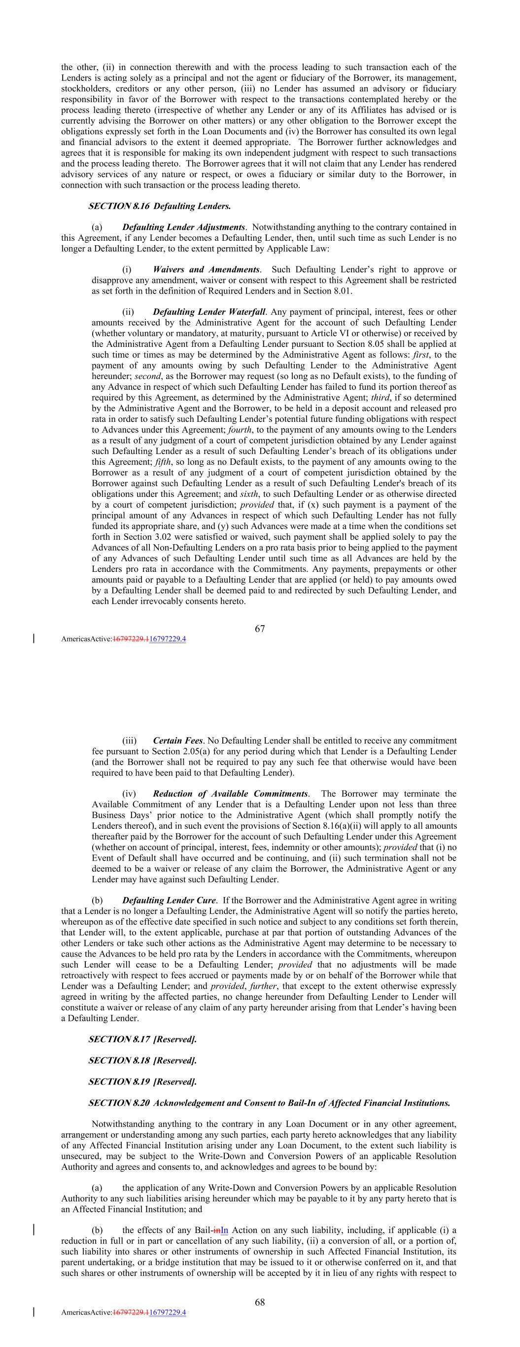 the other, (ii) in connection therewith and with the process leading to such transaction each of the Lenders is acting solely as a principal and not the agent or fiduciary of the Borrower, its management, stockholders, creditors or any other person, (iii) no Lender has assumed an advisory or fiduciary responsibility in favor of the Borrower with respect to the transactions contemplated hereby or the process leading thereto (irrespective of whether any Lender or any of its Affiliates has advised or is currently advising the Borrower on other matters) or any other obligation to the Borrower except the obligations expressly set forth in the Loan Documents and (iv) the Borrower has consulted its own legal and financial advisors to the extent it deemed appropriate. The Borrower further acknowledges and agrees that it is responsible for making its own independent judgment with respect to such transactions and the process leading thereto. The Borrower agrees that it will not claim that any Lender has rendered advisory services of any nature or respect, or owes a fiduciary or similar duty to the Borrower, in connection with such transaction or the process leading thereto. SECTION 8.16 Defaulting Lenders. (a) Defaulting Lender Adjustments. Notwithstanding anything to the contrary contained in this Agreement, if any Lender becomes a Defaulting Lender, then, until such time as such Lender is no longer a Defaulting Lender, to the extent permitted by Applicable Law: (i) Waivers and Amendments. Such Defaulting Lender’s right to approve or disapprove any amendment, waiver or consent with respect to this Agreement shall be restricted as set forth in the definition of Required Lenders and in Section 8.01. (ii) Defaulting Lender Waterfall. Any payment of principal, interest, fees or other amounts received by the Administrative Agent for the account of such Defaulting Lender (whether voluntary or mandatory, at maturity, pursuant to Article VI or otherwise) or received by the Administrative Agent from a Defaulting Lender pursuant to Section 8.05 shall be applied at such time or times as may be determined by the Administrative Agent as follows: first, to the payment of any amounts owing by such Defaulting Lender to the Administrative Agent hereunder; second, as the Borrower may request (so long as no Default exists), to the funding of any Advance in respect of which such Defaulting Lender has failed to fund its portion thereof as required by this Agreement, as determined by the Administrative Agent; third, if so determined by the Administrative Agent and the Borrower, to be held in a deposit account and released pro rata in order to satisfy such Defaulting Lender’s potential future funding obligations with respect to Advances under this Agreement; fourth, to the payment of any amounts owing to the Lenders as a result of any judgment of a court of competent jurisdiction obtained by any Lender against such Defaulting Lender as a result of such Defaulting Lender’s breach of its obligations under this Agreement; fifth, so long as no Default exists, to the payment of any amounts owing to the Borrower as a result of any judgment of a court of competent jurisdiction obtained by the Borrower against such Defaulting Lender as a result of such Defaulting Lender's breach of its obligations under this Agreement; and sixth, to such Defaulting Lender or as otherwise directed by a court of competent jurisdiction; provided that, if (x) such payment is a payment of the principal amount of any Advances in respect of which such Defaulting Lender has not fully funded its appropriate share, and (y) such Advances were made at a time when the conditions set forth in Section 3.02 were satisfied or waived, such payment shall be applied solely to pay the Advances of all Non-Defaulting Lenders on a pro rata basis prior to being applied to the payment of any Advances of such Defaulting Lender until such time as all Advances are held by the Lenders pro rata in accordance with the Commitments. Any payments, prepayments or other amounts paid or payable to a Defaulting Lender that are applied (or held) to pay amounts owed by a Defaulting Lender shall be deemed paid to and redirected by such Defaulting Lender, and each Lender irrevocably consents hereto. 67 AmericasActive:16797229.116797229.4 (iii) Certain Fees. No Defaulting Lender shall be entitled to receive any commitment fee pursuant to Section 2.05(a) for any period during which that Lender is a Defaulting Lender (and the Borrower shall not be required to pay any such fee that otherwise would have been required to have been paid to that Defaulting Lender). (iv) Reduction of Available Commitments. The Borrower may terminate the Available Commitment of any Lender that is a Defaulting Lender upon not less than three Business Days’ prior notice to the Administrative Agent (which shall promptly notify the Lenders thereof), and in such event the provisions of Section 8.16(a)(ii) will apply to all amounts thereafter paid by the Borrower for the account of such Defaulting Lender under this Agreement (whether on account of principal, interest, fees, indemnity or other amounts); provided that (i) no Event of Default shall have occurred and be continuing, and (ii) such termination shall not be deemed to be a waiver or release of any claim the Borrower, the Administrative Agent or any Lender may have against such Defaulting Lender. (b) Defaulting Lender Cure. If the Borrower and the Administrative Agent agree in writing that a Lender is no longer a Defaulting Lender, the Administrative Agent will so notify the parties hereto, whereupon as of the effective date specified in such notice and subject to any conditions set forth therein, that Lender will, to the extent applicable, purchase at par that portion of outstanding Advances of the other Lenders or take such other actions as the Administrative Agent may determine to be necessary to cause the Advances to be held pro rata by the Lenders 