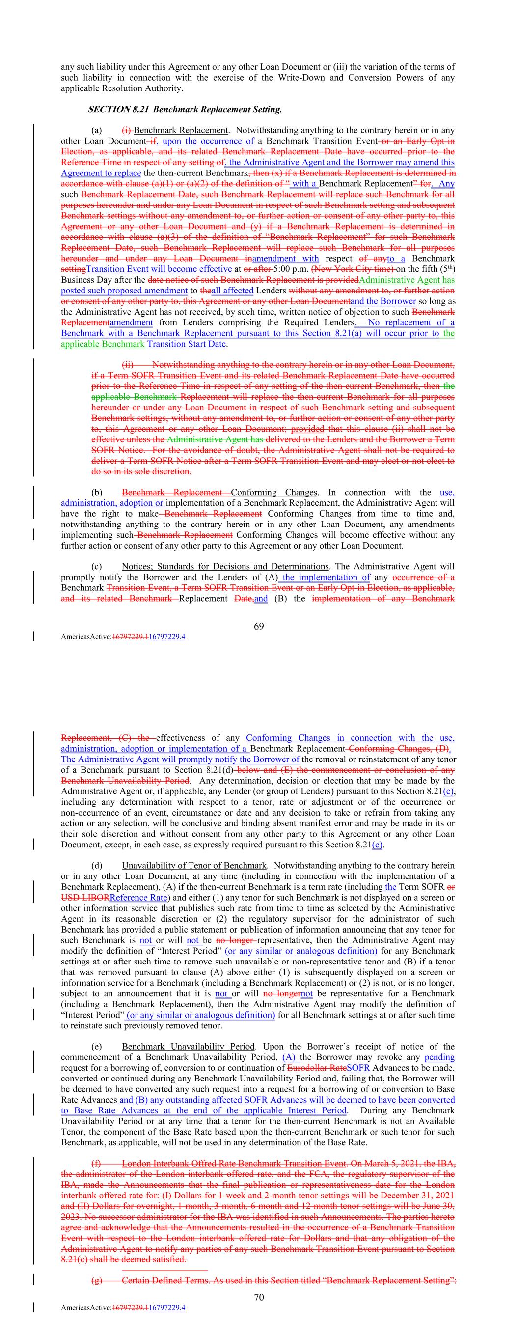 any such liability under this Agreement or any other Loan Document or (iii) the variation of the terms of such liability in connection with the exercise of the Write-Down and Conversion Powers of any applicable Resolution Authority. SECTION 8.21 Benchmark Replacement Setting. (a) (i) Benchmark Replacement. Notwithstanding anything to the contrary herein or in any other Loan Document if, upon the occurrence of a Benchmark Transition Event or an Early Opt-in Election, as applicable, and its related Benchmark Replacement Date have occurred prior to the Reference Time in respect of any setting of, the Administrative Agent and the Borrower may amend this Agreement to replace the then-current Benchmark, then (x) if a Benchmark Replacement is determined in accordance with clause (a)(1) or (a)(2) of the definition of “ with a Benchmark Replacement” for. Any such Benchmark Replacement Date, such Benchmark Replacement will replace such Benchmark for all purposes hereunder and under any Loan Document in respect of such Benchmark setting and subsequent Benchmark settings without any amendment to, or further action or consent of any other party to, this Agreement or any other Loan Document and (y) if a Benchmark Replacement is determined in accordance with clause (a)(3) of the definition of “Benchmark Replacement” for such Benchmark Replacement Date, such Benchmark Replacement will replace such Benchmark for all purposes hereunder and under any Loan Document inamendment with respect of anyto a Benchmark settingTransition Event will become effective at or after 5:00 p.m. (New York City time) on the fifth (5th) Business Day after the date notice of such Benchmark Replacement is providedAdministrative Agent has posted such proposed amendment to theall affected Lenders without any amendment to, or further action or consent of any other party to, this Agreement or any other Loan Documentand the Borrower so long as the Administrative Agent has not received, by such time, written notice of objection to such Benchmark Replacementamendment from Lenders comprising the Required Lenders. No replacement of a Benchmark with a Benchmark Replacement pursuant to this Section 8.21(a) will occur prior to the applicable Benchmark Transition Start Date. (ii) Notwithstanding anything to the contrary herein or in any other Loan Document, if a Term SOFR Transition Event and its related Benchmark Replacement Date have occurred prior to the Reference Time in respect of any setting of the then-current Benchmark, then the applicable Benchmark Replacement will replace the then-current Benchmark for all purposes hereunder or under any Loan Document in respect of such Benchmark setting and subsequent Benchmark settings, without any amendment to, or further action or consent of any other party to, this Agreement or any other Loan Document; provided that this clause (ii) shall not be effective unless the Administrative Agent has delivered to the Lenders and the Borrower a Term SOFR Notice. For the avoidance of doubt, the Administrative Agent shall not be required to deliver a Term SOFR Notice after a Term SOFR Transition Event and may elect or not elect to do so in its sole discretion. (b) Benchmark Replacement Conforming Changes. In connection with the use, administration, adoption or implementation of a Benchmark Replacement, the Administrative Agent will have the right to make Benchmark Replacement Conforming Changes from time to time and, notwithstanding anything to the contrary herein or in any other Loan Document, any amendments implementing such Benchmark Replacement Conforming Changes will become effective without any further action or consent of any other party to this Agreement or any other Loan Document. (c) Notices; Standards for Decisions and Determinations. The Administrative Agent will promptly notify the Borrower and the Lenders of (A) the implementation of any occurrence of a Benchmark Transition Event, a Term SOFR Transition Event or an Early Opt-in Election, as applicable, and its related Benchmark Replacement Date,and (B) the implementation of any Benchmark 69 AmericasActive:16797229.116797229.4 Replacement, (C) the effectiveness of any Conforming Changes in connection with the use, administration, adoption or implementation of a Benchmark Replacement Conforming Changes, (D). The Administrative Agent will promptly notify the Borrower of the removal or reinstatement of any tenor of a Benchmark pursuant to Section 8.21(d) below and (E) the commencement or conclusion of any Benchmark Unavailability Period. Any determination, decision or election that may be made by the Administrative Agent or, if applicable, any Lender (or group of Lenders) pursuant to this Section 8.21(c), including any determination with respect to a tenor, rate or adjustment or of the occurrence or non-occurrence of an event, circumstance or date and any decision to take or refrain from taking any action or any selection, will be conclusive and binding absent manifest error and may be made in its or their sole discretion and without consent from any other party to this Agreement or any other Loan Document, except, in each case, as expressly required pursuant to this Section 8.21(c). (d) Unavailability of Tenor of Benchmark. Notwithstanding anything to the contrary herein or in any other Loan Document, at any time (including in connection with the implementation of a Benchmark Replacement), (A) if the then-current Benchmark is a term rate (including the Term SOFR or USD LIBORReference Rate) and either (1) any tenor for such Benchmark is not displayed on a screen or other information service that publishes such rate from time to time as selected by the Administrative Agent in its reasonable discretion or (2) the regulatory supervisor for the administrator of such Benchmark has provided a public statement or publication of information announcing that any tenor for such Benchmark is not or will not be no longer representative, then the Admini