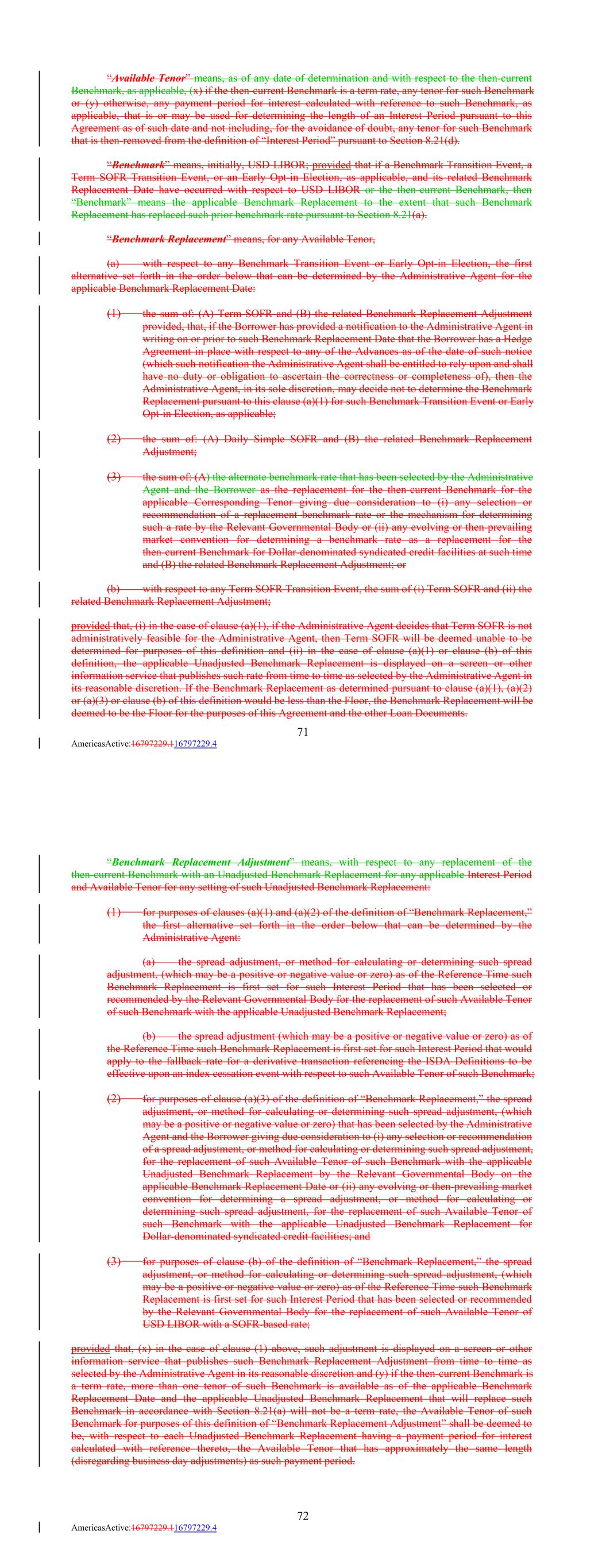 “Available Tenor” means, as of any date of determination and with respect to the then-current Benchmark, as applicable, (x) if the then-current Benchmark is a term rate, any tenor for such Benchmark or (y) otherwise, any payment period for interest calculated with reference to such Benchmark, as applicable, that is or may be used for determining the length of an Interest Period pursuant to this Agreement as of such date and not including, for the avoidance of doubt, any tenor for such Benchmark that is then-removed from the definition of “Interest Period” pursuant to Section 8.21(d). “Benchmark” means, initially, USD LIBOR; provided that if a Benchmark Transition Event, a Term SOFR Transition Event, or an Early Opt-in Election, as applicable, and its related Benchmark Replacement Date have occurred with respect to USD LIBOR or the then-current Benchmark, then “Benchmark” means the applicable Benchmark Replacement to the extent that such Benchmark Replacement has replaced such prior benchmark rate pursuant to Section 8.21(a). “Benchmark Replacement” means, for any Available Tenor, (a) with respect to any Benchmark Transition Event or Early Opt-in Election, the first alternative set forth in the order below that can be determined by the Administrative Agent for the applicable Benchmark Replacement Date: (1) the sum of: (A) Term SOFR and (B) the related Benchmark Replacement Adjustment provided, that, if the Borrower has provided a notification to the Administrative Agent in writing on or prior to such Benchmark Replacement Date that the Borrower has a Hedge Agreement in place with respect to any of the Advances as of the date of such notice (which such notification the Administrative Agent shall be entitled to rely upon and shall have no duty or obligation to ascertain the correctness or completeness of), then the Administrative Agent, in its sole discretion, may decide not to determine the Benchmark Replacement pursuant to this clause (a)(1) for such Benchmark Transition Event or Early Opt-in Election, as applicable; (2) the sum of: (A) Daily Simple SOFR and (B) the related Benchmark Replacement Adjustment; (3) the sum of: (A) the alternate benchmark rate that has been selected by the Administrative Agent and the Borrower as the replacement for the then-current Benchmark for the applicable Corresponding Tenor giving due consideration to (i) any selection or recommendation of a replacement benchmark rate or the mechanism for determining such a rate by the Relevant Governmental Body or (ii) any evolving or then-prevailing market convention for determining a benchmark rate as a replacement for the then-current Benchmark for Dollar-denominated syndicated credit facilities at such time and (B) the related Benchmark Replacement Adjustment; or (b) with respect to any Term SOFR Transition Event, the sum of (i) Term SOFR and (ii) the related Benchmark Replacement Adjustment; provided that, (i) in the case of clause (a)(1), if the Administrative Agent decides that Term SOFR is not administratively feasible for the Administrative Agent, then Term SOFR will be deemed unable to be determined for purposes of this definition and (ii) in the case of clause (a)(1) or clause (b) of this definition, the applicable Unadjusted Benchmark Replacement is displayed on a screen or other information service that publishes such rate from time to time as selected by the Administrative Agent in its reasonable discretion. If the Benchmark Replacement as determined pursuant to clause (a)(1), (a)(2) or (a)(3) or clause (b) of this definition would be less than the Floor, the Benchmark Replacement will be deemed to be the Floor for the purposes of this Agreement and the other Loan Documents. 71 AmericasActive:16797229.116797229.4 “Benchmark Replacement Adjustment” means, with respect to any replacement of the then-current Benchmark with an Unadjusted Benchmark Replacement for any applicable Interest Period and Available Tenor for any setting of such Unadjusted Benchmark Replacement: (1) for purposes of clauses (a)(1) and (a)(2) of the definition of “Benchmark Replacement,” the first alternative set forth in the order below that can be determined by the Administrative Agent: (a) the spread adjustment, or method for calculating or determining such spread adjustment, (which may be a positive or negative value or zero) as of the Reference Time such Benchmark Replacement is first set for such Interest Period that has been selected or recommended by the Relevant Governmental Body for the replacement of such Available Tenor of such Benchmark with the applicable Unadjusted Benchmark Replacement; (b) the spread adjustment (which may be a positive or negative value or zero) as of the Reference Time such Benchmark Replacement is first set for such Interest Period that would apply to the fallback rate for a derivative transaction referencing the ISDA Definitions to be effective upon an index cessation event with respect to such Available Tenor of such Benchmark; (2) for purposes of clause (a)(3) of the definition of “Benchmark Replacement,” the spread adjustment, or method for calculating or determining such spread adjustment, (which may be a positive or negative value or zero) that has been selected by the Administrative Agent and the Borrower giving due consideration to (i) any selection or recommendation of a spread adjustment, or method for calculating or determining such spread adjustment, for the replacement of such Available Tenor of such Benchmark with the applicable Unadjusted Benchmark Replacement by the Relevant Governmental Body on the applicable Benchmark Replacement Date or (ii) any evolving or then-prevailing market convention for determining a spread adjustment, or method for calculating or determining such spread adjustment, for the replacement of such Available Tenor of such Benchmark with the applicable Unadjusted Benchmark Replacement for Dollar-denominated syndicated credit facilit
