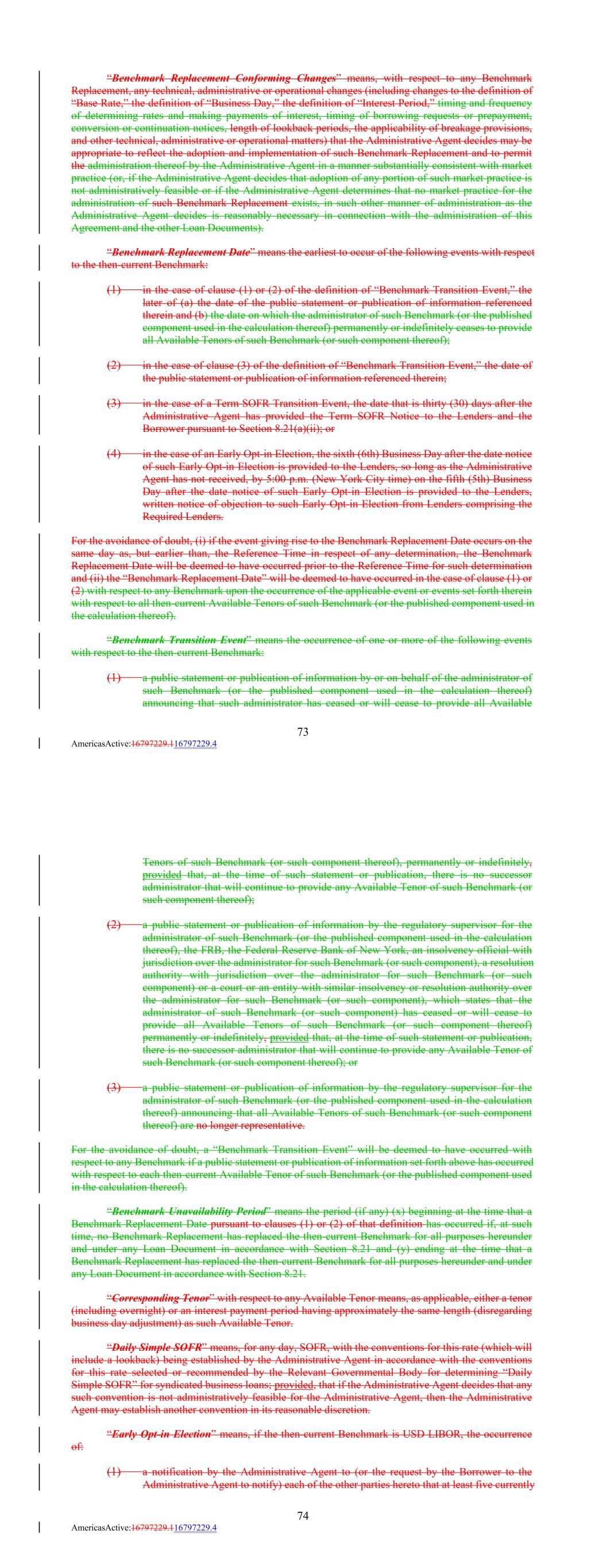 “Benchmark Replacement Conforming Changes” means, with respect to any Benchmark Replacement, any technical, administrative or operational changes (including changes to the definition of “Base Rate,” the definition of “Business Day,” the definition of “Interest Period,” timing and frequency of determining rates and making payments of interest, timing of borrowing requests or prepayment, conversion or continuation notices, length of lookback periods, the applicability of breakage provisions, and other technical, administrative or operational matters) that the Administrative Agent decides may be appropriate to reflect the adoption and implementation of such Benchmark Replacement and to permit the administration thereof by the Administrative Agent in a manner substantially consistent with market practice (or, if the Administrative Agent decides that adoption of any portion of such market practice is not administratively feasible or if the Administrative Agent determines that no market practice for the administration of such Benchmark Replacement exists, in such other manner of administration as the Administrative Agent decides is reasonably necessary in connection with the administration of this Agreement and the other Loan Documents). “Benchmark Replacement Date” means the earliest to occur of the following events with respect to the then-current Benchmark: (1) in the case of clause (1) or (2) of the definition of “Benchmark Transition Event,” the later of (a) the date of the public statement or publication of information referenced therein and (b) the date on which the administrator of such Benchmark (or the published component used in the calculation thereof) permanently or indefinitely ceases to provide all Available Tenors of such Benchmark (or such component thereof); (2) in the case of clause (3) of the definition of “Benchmark Transition Event,” the date of the public statement or publication of information referenced therein; (3) in the case of a Term SOFR Transition Event, the date that is thirty (30) days after the Administrative Agent has provided the Term SOFR Notice to the Lenders and the Borrower pursuant to Section 8.21(a)(ii); or (4) in the case of an Early Opt-in Election, the sixth (6th) Business Day after the date notice of such Early Opt-in Election is provided to the Lenders, so long as the Administrative Agent has not received, by 5:00 p.m. (New York City time) on the fifth (5th) Business Day after the date notice of such Early Opt-in Election is provided to the Lenders, written notice of objection to such Early Opt-in Election from Lenders comprising the Required Lenders. For the avoidance of doubt, (i) if the event giving rise to the Benchmark Replacement Date occurs on the same day as, but earlier than, the Reference Time in respect of any determination, the Benchmark Replacement Date will be deemed to have occurred prior to the Reference Time for such determination and (ii) the “Benchmark Replacement Date” will be deemed to have occurred in the case of clause (1) or (2) with respect to any Benchmark upon the occurrence of the applicable event or events set forth therein with respect to all then-current Available Tenors of such Benchmark (or the published component used in the calculation thereof). “Benchmark Transition Event” means the occurrence of one or more of the following events with respect to the then-current Benchmark: (1) a public statement or publication of information by or on behalf of the administrator of such Benchmark (or the published component used in the calculation thereof) announcing that such administrator has ceased or will cease to provide all Available 73 AmericasActive:16797229.116797229.4 Tenors of such Benchmark (or such component thereof), permanently or indefinitely, provided that, at the time of such statement or publication, there is no successor administrator that will continue to provide any Available Tenor of such Benchmark (or such component thereof); (2) a public statement or publication of information by the regulatory supervisor for the administrator of such Benchmark (or the published component used in the calculation thereof), the FRB, the Federal Reserve Bank of New York, an insolvency official with jurisdiction over the administrator for such Benchmark (or such component), a resolution authority with jurisdiction over the administrator for such Benchmark (or such component) or a court or an entity with similar insolvency or resolution authority over the administrator for such Benchmark (or such component), which states that the administrator of such Benchmark (or such component) has ceased or will cease to provide all Available Tenors of such Benchmark (or such component thereof) permanently or indefinitely, provided that, at the time of such statement or publication, there is no successor administrator that will continue to provide any Available Tenor of such Benchmark (or such component thereof); or (3) a public statement or publication of information by the regulatory supervisor for the administrator of such Benchmark (or the published component used in the calculation thereof) announcing that all Available Tenors of such Benchmark (or such component thereof) are no longer representative. For the avoidance of doubt, a “Benchmark Transition Event” will be deemed to have occurred with respect to any Benchmark if a public statement or publication of information set forth above has occurred with respect to each then-current Available Tenor of such Benchmark (or the published component used in the calculation thereof). “Benchmark Unavailability Period” means the period (if any) (x) beginning at the time that a Benchmark Replacement Date pursuant to clauses (1) or (2) of that definition has occurred if, at such time, no Benchmark Replacement has replaced the then-current Benchmark for all purposes hereunder and under any Loan Document in accordance with Section 8.21 and (y) ending a