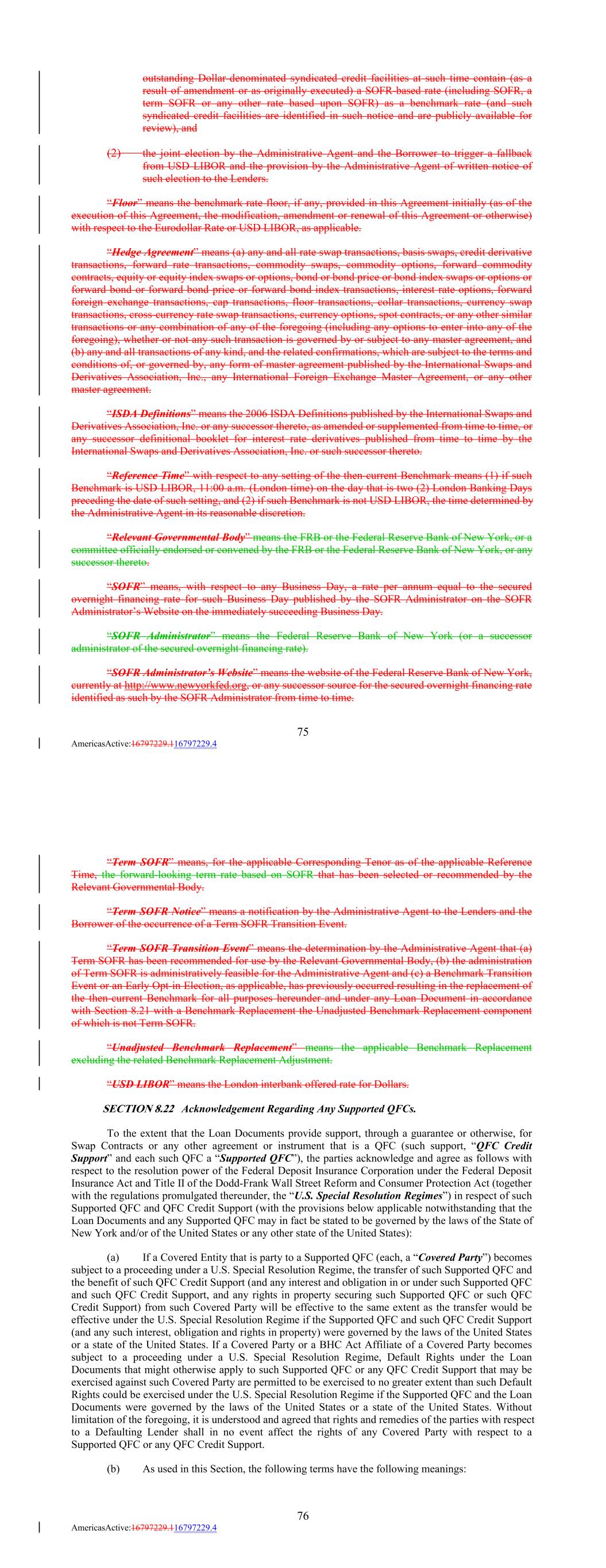 outstanding Dollar-denominated syndicated credit facilities at such time contain (as a result of amendment or as originally executed) a SOFR-based rate (including SOFR, a term SOFR or any other rate based upon SOFR) as a benchmark rate (and such syndicated credit facilities are identified in such notice and are publicly available for review), and (2) the joint election by the Administrative Agent and the Borrower to trigger a fallback from USD LIBOR and the provision by the Administrative Agent of written notice of such election to the Lenders. “Floor” means the benchmark rate floor, if any, provided in this Agreement initially (as of the execution of this Agreement, the modification, amendment or renewal of this Agreement or otherwise) with respect to the Eurodollar Rate or USD LIBOR, as applicable. “Hedge Agreement” means (a) any and all rate swap transactions, basis swaps, credit derivative transactions, forward rate transactions, commodity swaps, commodity options, forward commodity contracts, equity or equity index swaps or options, bond or bond price or bond index swaps or options or forward bond or forward bond price or forward bond index transactions, interest rate options, forward foreign exchange transactions, cap transactions, floor transactions, collar transactions, currency swap transactions, cross-currency rate swap transactions, currency options, spot contracts, or any other similar transactions or any combination of any of the foregoing (including any options to enter into any of the foregoing), whether or not any such transaction is governed by or subject to any master agreement, and (b) any and all transactions of any kind, and the related confirmations, which are subject to the terms and conditions of, or governed by, any form of master agreement published by the International Swaps and Derivatives Association, Inc., any International Foreign Exchange Master Agreement, or any other master agreement. “ISDA Definitions” means the 2006 ISDA Definitions published by the International Swaps and Derivatives Association, Inc. or any successor thereto, as amended or supplemented from time to time, or any successor definitional booklet for interest rate derivatives published from time to time by the International Swaps and Derivatives Association, Inc. or such successor thereto. “Reference Time” with respect to any setting of the then-current Benchmark means (1) if such Benchmark is USD LIBOR, 11:00 a.m. (London time) on the day that is two (2) London Banking Days preceding the date of such setting, and (2) if such Benchmark is not USD LIBOR, the time determined by the Administrative Agent in its reasonable discretion. “Relevant Governmental Body” means the FRB or the Federal Reserve Bank of New York, or a committee officially endorsed or convened by the FRB or the Federal Reserve Bank of New York, or any successor thereto. “SOFR” means, with respect to any Business Day, a rate per annum equal to the secured overnight financing rate for such Business Day published by the SOFR Administrator on the SOFR Administrator’s Website on the immediately succeeding Business Day. “SOFR Administrator” means the Federal Reserve Bank of New York (or a successor administrator of the secured overnight financing rate). “SOFR Administrator’s Website” means the website of the Federal Reserve Bank of New York, currently at http://www.newyorkfed.org, or any successor source for the secured overnight financing rate identified as such by the SOFR Administrator from time to time. 75 AmericasActive:16797229.116797229.4 “Term SOFR” means, for the applicable Corresponding Tenor as of the applicable Reference Time, the forward-looking term rate based on SOFR that has been selected or recommended by the Relevant Governmental Body. “Term SOFR Notice” means a notification by the Administrative Agent to the Lenders and the Borrower of the occurrence of a Term SOFR Transition Event. “Term SOFR Transition Event” means the determination by the Administrative Agent that (a) Term SOFR has been recommended for use by the Relevant Governmental Body, (b) the administration of Term SOFR is administratively feasible for the Administrative Agent and (c) a Benchmark Transition Event or an Early Opt-in Election, as applicable, has previously occurred resulting in the replacement of the then-current Benchmark for all purposes hereunder and under any Loan Document in accordance with Section 8.21 with a Benchmark Replacement the Unadjusted Benchmark Replacement component of which is not Term SOFR. “Unadjusted Benchmark Replacement” means the applicable Benchmark Replacement excluding the related Benchmark Replacement Adjustment. “USD LIBOR” means the London interbank offered rate for Dollars. SECTION 8.22 Acknowledgement Regarding Any Supported QFCs. To the extent that the Loan Documents provide support, through a guarantee or otherwise, for Swap Contracts or any other agreement or instrument that is a QFC (such support, “QFC Credit Support” and each such QFC a “Supported QFC”), the parties acknowledge and agree as follows with respect to the resolution power of the Federal Deposit Insurance Corporation under the Federal Deposit Insurance Act and Title II of the Dodd-Frank Wall Street Reform and Consumer Protection Act (together with the regulations promulgated thereunder, the “U.S. Special Resolution Regimes”) in respect of such Supported QFC and QFC Credit Support (with the provisions below applicable notwithstanding that the Loan Documents and any Supported QFC may in fact be stated to be governed by the laws of the State of New York and/or of the United States or any other state of the United States): (a) If a Covered Entity that is party to a Supported QFC (each, a “Covered Party”) becomes subject to a proceeding under a U.S. Special Resolution Regime, the transfer of such Supported QFC and the benefit of such QFC Credit Support (and any interest and