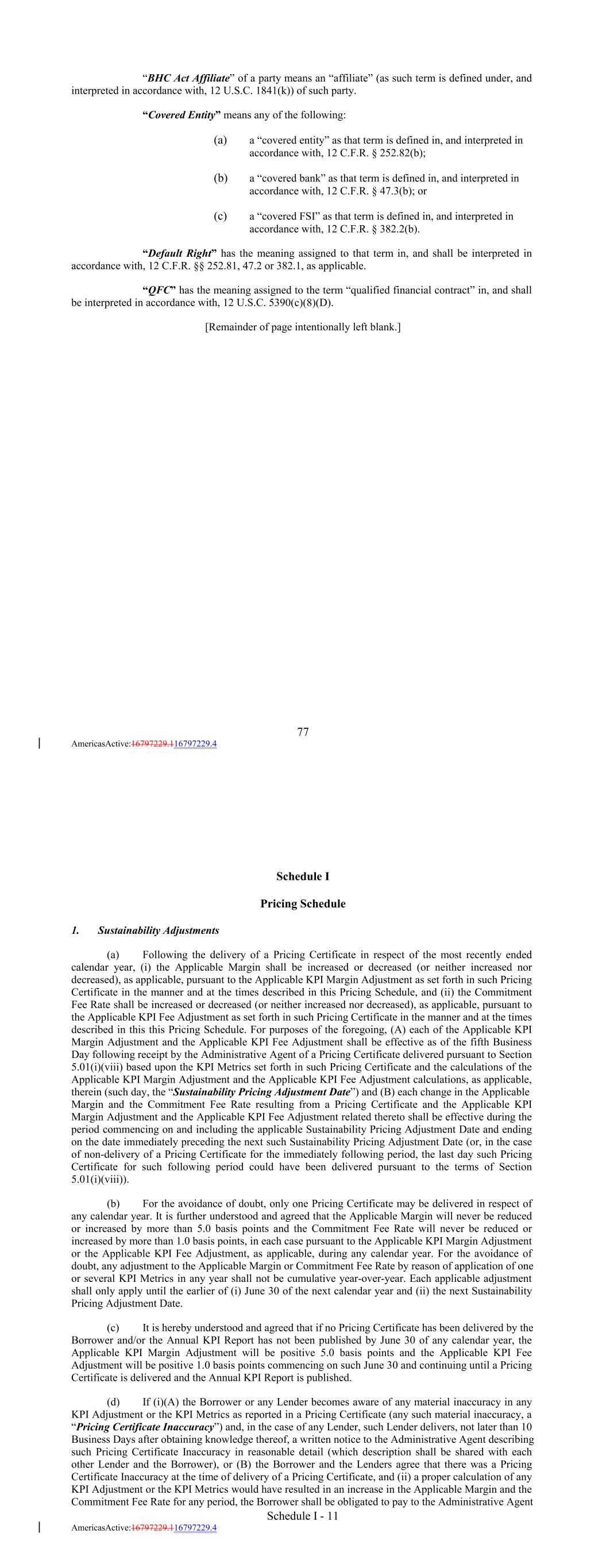 “BHC Act Affiliate” of a party means an “affiliate” (as such term is defined under, and interpreted in accordance with, 12 U.S.C. 1841(k)) of such party. “Covered Entity” means any of the following: (a) a “covered entity” as that term is defined in, and interpreted in accordance with, 12 C.F.R. § 252.82(b); (b) a “covered bank” as that term is defined in, and interpreted in accordance with, 12 C.F.R. § 47.3(b); or (c) a “covered FSI” as that term is defined in, and interpreted in accordance with, 12 C.F.R. § 382.2(b). “Default Right” has the meaning assigned to that term in, and shall be interpreted in accordance with, 12 C.F.R. §§ 252.81, 47.2 or 382.1, as applicable. “QFC” has the meaning assigned to the term “qualified financial contract” in, and shall be interpreted in accordance with, 12 U.S.C. 5390(c)(8)(D). [Remainder of page intentionally left blank.] 77 AmericasActive:16797229.116797229.4 Schedule I Pricing Schedule 1. Sustainability Adjustments (a) Following the delivery of a Pricing Certificate in respect of the most recently ended calendar year, (i) the Applicable Margin shall be increased or decreased (or neither increased nor decreased), as applicable, pursuant to the Applicable KPI Margin Adjustment as set forth in such Pricing Certificate in the manner and at the times described in this Pricing Schedule, and (ii) the Commitment Fee Rate shall be increased or decreased (or neither increased nor decreased), as applicable, pursuant to the Applicable KPI Fee Adjustment as set forth in such Pricing Certificate in the manner and at the times described in this this Pricing Schedule. For purposes of the foregoing, (A) each of the Applicable KPI Margin Adjustment and the Applicable KPI Fee Adjustment shall be effective as of the fifth Business Day following receipt by the Administrative Agent of a Pricing Certificate delivered pursuant to Section 5.01(i)(viii) based upon the KPI Metrics set forth in such Pricing Certificate and the calculations of the Applicable KPI Margin Adjustment and the Applicable KPI Fee Adjustment calculations, as applicable, therein (such day, the “Sustainability Pricing Adjustment Date”) and (B) each change in the Applicable Margin and the Commitment Fee Rate resulting from a Pricing Certificate and the Applicable KPI Margin Adjustment and the Applicable KPI Fee Adjustment related thereto shall be effective during the period commencing on and including the applicable Sustainability Pricing Adjustment Date and ending on the date immediately preceding the next such Sustainability Pricing Adjustment Date (or, in the case of non-delivery of a Pricing Certificate for the immediately following period, the last day such Pricing Certificate for such following period could have been delivered pursuant to the terms of Section 5.01(i)(viii)). (b) For the avoidance of doubt, only one Pricing Certificate may be delivered in respect of any calendar year. It is further understood and agreed that the Applicable Margin will never be reduced or increased by more than 5.0 basis points and the Commitment Fee Rate will never be reduced or increased by more than 1.0 basis points, in each case pursuant to the Applicable KPI Margin Adjustment or the Applicable KPI Fee Adjustment, as applicable, during any calendar year. For the avoidance of doubt, any adjustment to the Applicable Margin or Commitment Fee Rate by reason of application of one or several KPI Metrics in any year shall not be cumulative year-over-year. Each applicable adjustment shall only apply until the earlier of (i) June 30 of the next calendar year and (ii) the next Sustainability Pricing Adjustment Date. (c) It is hereby understood and agreed that if no Pricing Certificate has been delivered by the Borrower and/or the Annual KPI Report has not been published by June 30 of any calendar year, the Applicable KPI Margin Adjustment will be positive 5.0 basis points and the Applicable KPI Fee Adjustment will be positive 1.0 basis points commencing on such June 30 and continuing until a Pricing Certificate is delivered and the Annual KPI Report is published. (d) If (i)(A) the Borrower or any Lender becomes aware of any material inaccuracy in any KPI Adjustment or the KPI Metrics as reported in a Pricing Certificate (any such material inaccuracy, a “Pricing Certificate Inaccuracy”) and, in the case of any Lender, such Lender delivers, not later than 10 Business Days after obtaining knowledge thereof, a written notice to the Administrative Agent describing such Pricing Certificate Inaccuracy in reasonable detail (which description shall be shared with each other Lender and the Borrower), or (B) the Borrower and the Lenders agree that there was a Pricing Certificate Inaccuracy at the time of delivery of a Pricing Certificate, and (ii) a proper calculation of any KPI Adjustment or the KPI Metrics would have resulted in an increase in the Applicable Margin and the Commitment Fee Rate for any period, the Borrower shall be obligated to pay to the Administrative Agent Schedule I - 11 AmericasActive:16797229.116797229.4