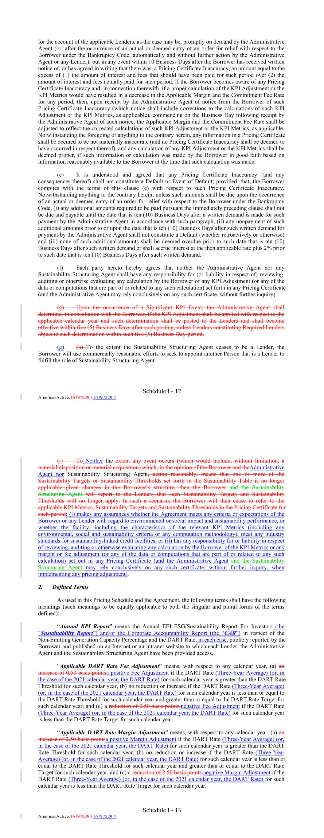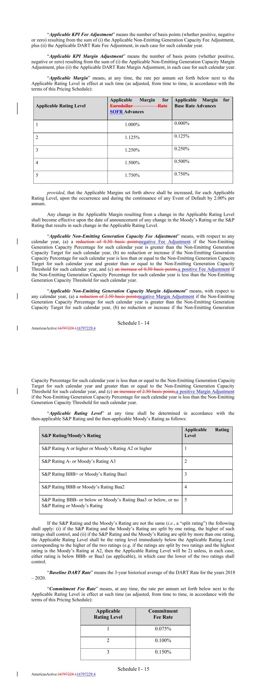 Schedule I - 14 AmericasActive:16797229.116797229.4 0.125% 3 1 1.250% Applicable Rating Level 0.250% 1.000% 4 0.000% 1.500% Applicable Margin for Eurodollar Rate SOFR Advances 0.500% “Applicable KPI Fee Adjustment” means the number of basis points (whether positive, negative or zero) resulting from the sum of (i) the Applicable Non-Emitting Generation Capacity Fee Adjustment, plus (ii) the Applicable DART Rate Fee Adjustment, in each case for such calendar year. “Applicable KPI Margin Adjustment” means the number of basis points (whether positive, negative or zero) resulting from the sum of (i) the Applicable Non-Emitting Generation Capacity Margin Adjustment, plus (ii) the Applicable DART Rate Margin Adjustment, in each case for such calendar year. “Applicable Margin” means, at any time, the rate per annum set forth below next to the Applicable Rating Level in effect at such time (as adjusted, from time to time, in accordance with the terms of this Pricing Schedule): 5 2 1.750% Applicable Margin for Base Rate Advances 0.750% 1.125% provided, that the Applicable Margins set forth above shall be increased, for each Applicable Rating Level, upon the occurrence and during the continuance of any Event of Default by 2.00% per annum. Any change in the Applicable Margin resulting from a change in the Applicable Rating Level shall become effective upon the date of announcement of any change in the Moody’s Rating or the S&P Rating that results in such change in the Applicable Rating Level. “Applicable Non-Emitting Generation Capacity Fee Adjustment” means, with respect to any calendar year, (a) a reduction of 0.50 basis pointsnegative Fee Adjustment if the Non-Emitting Generation Capacity Percentage for such calendar year is greater than the Non-Emitting Generation Capacity Target for such calendar year, (b) no reduction or increase if the Non-Emitting Generation Capacity Percentage for such calendar year is less than or equal to the Non-Emitting Generation Capacity Target for such calendar year and greater than or equal to the Non-Emitting Generation Capacity Threshold for such calendar year, and (c) an increase of 0.50 basis points,a positive Fee Adjustment if the Non-Emitting Generation Capacity Percentage for such calendar year is less than the Non-Emitting Generation Capacity Threshold for such calendar year. “Applicable Non-Emitting Generation Capacity Margin Adjustment” means, with respect to any calendar year, (a) a reduction of 2.50 basis pointsnegative Margin Adjustment if the Non-Emitting Generation Capacity Percentage for such calendar year is greater than the Non-Emitting Generation Capacity Target for such calendar year, (b) no reduction or increase if the Non-Emitting Generation Schedule I - 15 AmericasActive:16797229.116797229.4 4 S&P Rating/Moody’s Rating S&P Rating BBB- or below or Moody’s Rating Baa3 or below, or no S&P Rating or Moody’s Rating 5 S&P Rating A- or Moody’s Rating A3 If the S&P Rating and the Moody’s Rating are not the same (i.e., a “split rating”) the following shall apply: (i) if the S&P Rating and the Moody’s Rating are split by one rating, the higher of such ratings shall control, and (ii) if the S&P Rating and the Moody’s Rating are split by more than one rating, the Applicable Rating Level shall be the rating level immediately below the Applicable Rating Level corresponding to the higher of the two ratings (e.g. if the ratings are split by two ratings and the highest rating is the Moody’s Rating at A2, then the Applicable Rating Level will be 2) unless, in each case, either rating is below BBB- or Baa3 (as applicable), in which case the lower of the two ratings shall control. “Baseline DART Rate” means the 3-year historical average of the DART Rate for the years 2018 – 2020. “Commitment Fee Rate” means, at any time, the rate per annum set forth below next to the Applicable Rating Level in effect at such time (as adjusted, from time to time, in accordance with the terms of this Pricing Schedule): Applicable Rating Level Applicable Rating Level 2 Commitment Fee Rate Capacity Percentage for such calendar year is less than or equal to the Non-Emitting Generation Capacity Target for such calendar year and greater than or equal to the Non-Emitting Generation Capacity Threshold for such calendar year, and (c) an increase of 2.50 basis points,a positive Margin Adjustment if the Non-Emitting Generation Capacity Percentage for such calendar year is less than the Non-Emitting Generation Capacity Threshold for such calendar year. “Applicable Rating Level” at any time shall be determined in accordance with the then-applicable S&P Rating and the then-applicable Moody’s Rating as follows: 1 0.075% S&P Rating BBB+ or Moody’s Rating Baa1 2 3 0.100% S&P Rating A or higher or Moody’s Rating A2 or higher 3 0.150% S&P Rating BBB or Moody’s Rating Baa2 1