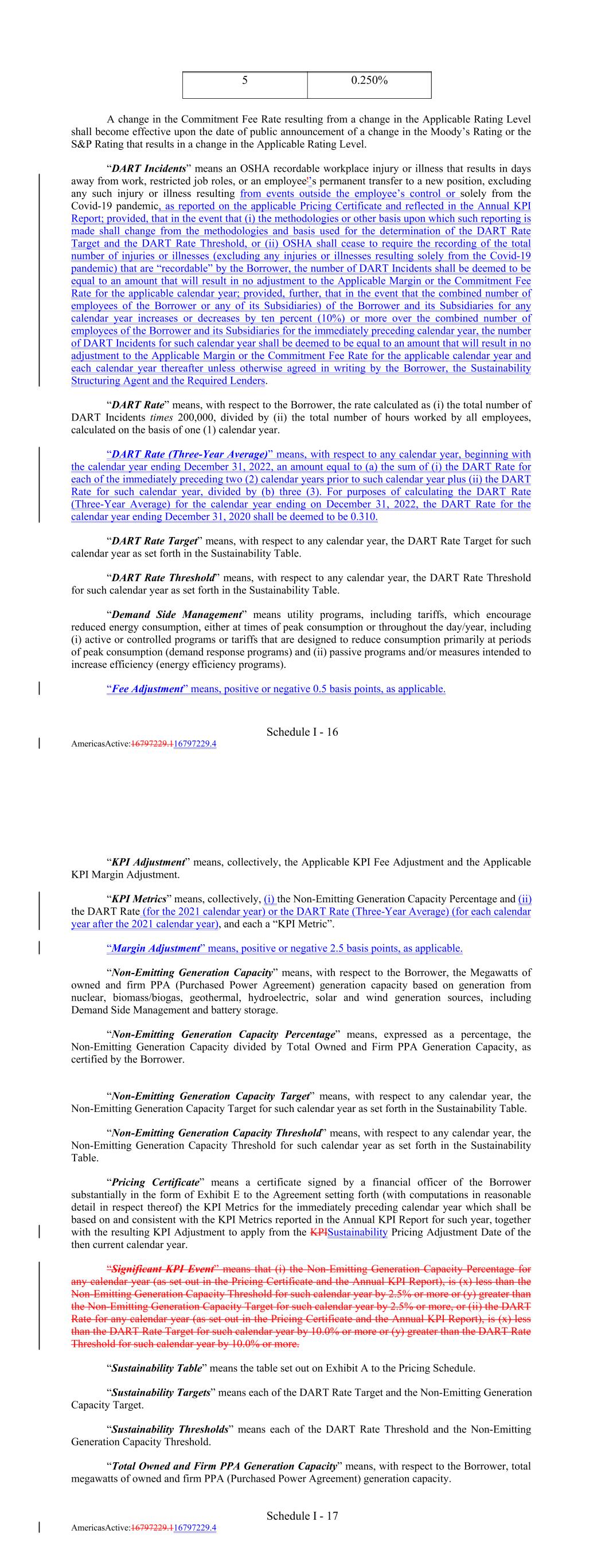 Schedule I - 16 AmericasActive:16797229.116797229.4 54 0.250% A change in the Commitment Fee Rate resulting from a change in the Applicable Rating Level shall become effective upon the date of public announcement of a change in the Moody’s Rating or the S&P Rating that results in a change in the Applicable Rating Level. “DART Incidents” means an OSHA recordable workplace injury or illness that results in days away from work, restricted job roles, or an employee'’s permanent transfer to a new position, excluding any such injury or illness resulting from events outside the employee’s control or solely from the Covid-19 pandemic, as reported on the applicable Pricing Certificate and reflected in the Annual KPI Report; provided, that in the event that (i) the methodologies or other basis upon which such reporting is made shall change from the methodologies and basis used for the determination of the DART Rate Target and the DART Rate Threshold, or (ii) OSHA shall cease to require the recording of the total number of injuries or illnesses (excluding any injuries or illnesses resulting solely from the Covid-19 pandemic) that are “recordable” by the Borrower, the number of DART Incidents shall be deemed to be equal to an amount that will result in no adjustment to the Applicable Margin or the Commitment Fee Rate for the applicable calendar year; provided, further, that in the event that the combined number of employees of the Borrower or any of its Subsidiaries) of the Borrower and its Subsidiaries for any calendar year increases or decreases by ten percent (10%) or more over the combined number of employees of the Borrower and its Subsidiaries for the immediately preceding calendar year, the number of DART Incidents for such calendar year shall be deemed to be equal to an amount that will result in no adjustment to the Applicable Margin or the Commitment Fee Rate for the applicable calendar year and each calendar year thereafter unless otherwise agreed in writing by the Borrower, the Sustainability Structuring Agent and the Required Lenders. “DART Rate” means, with respect to the Borrower, the rate calculated as (i) the total number of DART Incidents times 200,000, divided by (ii) the total number of hours worked by all employees, calculated on the basis of one (1) calendar year. “DART Rate (Three-Year Average)” means, with respect to any calendar year, beginning with the calendar year ending December 31, 2022, an amount equal to (a) the sum of (i) the DART Rate for each of the immediately preceding two (2) calendar years prior to such calendar year plus (ii) the DART Rate for such calendar year, divided by (b) three (3). For purposes of calculating the DART Rate (Three-Year Average) for the calendar year ending on December 31, 2022, the DART Rate for the calendar year ending December 31, 2020 shall be deemed to be 0.310. “DART Rate Target” means, with respect to any calendar year, the DART Rate Target for such calendar year as set forth in the Sustainability Table. “DART Rate Threshold” means, with respect to any calendar year, the DART Rate Threshold for such calendar year as set forth in the Sustainability Table. “Demand Side Management” means utility programs, including tariffs, which encourage reduced energy consumption, either at times of peak consumption or throughout the day/year, including (i) active or controlled programs or tariffs that are designed to reduce consumption primarily at periods of peak consumption (demand response programs) and (ii) passive programs and/or measures intended to increase efficiency (energy efficiency programs). “Fee Adjustment” means, positive or negative 0.5 basis points, as applicable. 0 “KPI Adjustment” means, collectively, the Applicable KPI Fee Adjustment and the Applicable KPI Margin Adjustment. “KPI Metrics” means, collectively, (i) the Non-Emitting Generation Capacity Percentage and (ii) the DART Rate (for the 2021 calendar year) or the DART Rate (Three-Year Average) (for each calendar year after the 2021 calendar year), and each a “KPI Metric”. “Margin Adjustment” means, positive or negative 2.5 basis points, as applicable. “Non-Emitting Generation Capacity” means, with respect to the Borrower, the Megawatts of owned and firm PPA (Purchased Power Agreement) generation capacity based on generation from nuclear, biomass/biogas, geothermal, hydroelectric, solar and wind generation sources, including Demand Side Management and battery storage. “Non-Emitting Generation Capacity Percentage” means, expressed as a percentage, the Non-Emitting Generation Capacity divided by Total Owned and Firm PPA Generation Capacity, as certified by the Borrower. “Non-Emitting Generation Capacity Target” means, with respect to any calendar year, the Non-Emitting Generation Capacity Target for such calendar year as set forth in the Sustainability Table. “Non-Emitting Generation Capacity Threshold” means, with respect to any calendar year, the Non-Emitting Generation Capacity Threshold for such calendar year as set forth in the Sustainability Table. “Pricing Certificate” means a certificate signed by a financial officer of the Borrower substantially in the form of Exhibit E to the Agreement setting forth (with computations in reasonable detail in respect thereof) the KPI Metrics for the immediately preceding calendar year which shall be based on and consistent with the KPI Metrics reported in the Annual KPI Report for such year, together with the resulting KPI Adjustment to apply from the KPISustainability Pricing Adjustment Date of the then current calendar year. “Significant KPI Event” means that (i) the Non-Emitting Generation Capacity Percentage for any calendar year (as set out in the Pricing Certificate and the Annual KPI Report), is (x) less than the Non-Emitting Generation Capacity Threshold for such calendar year by 2.5% or more or (y) greater than the Non-Emitting Generation Capacity 