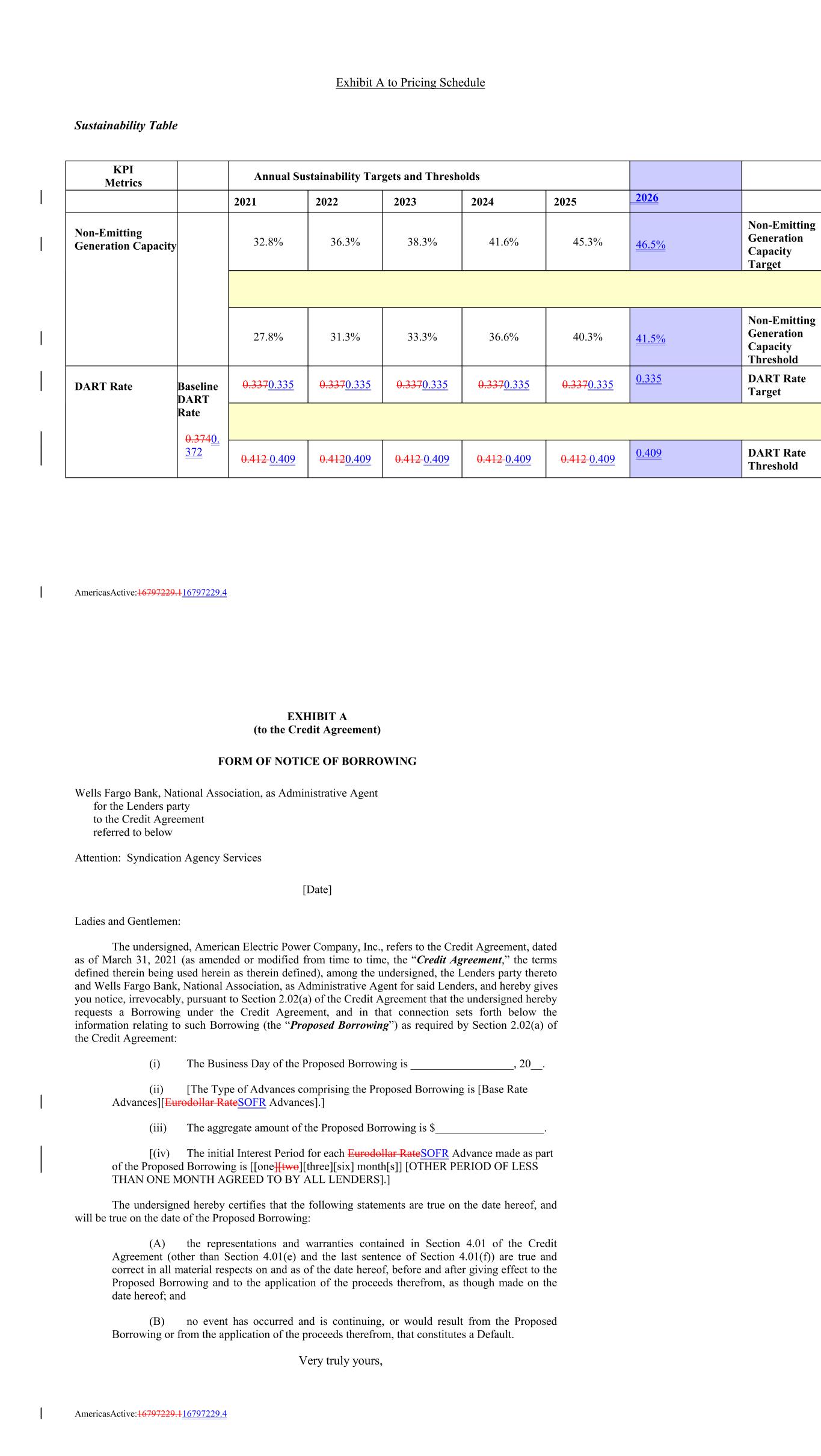 AmericasActive:16797229.116797229.4 2026 KPI Metrics 27.8% 31.3% 33.3% 36.6% 40.3% Non-Emitting Generation Capacity 41.5% Non-Emitting Generation Capacity Threshold DART Rate 32.8% Baseline DART Rate 0.3740. 372 0.3370.335 36.3% 0.3370.335 Exhibit A to Pricing Schedule Sustainability Table 0.3370.335 38.3% 0.3370.335 2021 0.3370.335 41.6% 0.335 Annual Sustainability Targets and Thresholds DART Rate Target 45.3% 2022 46.5% Non-Emitting Generation Capacity Target 2023 0.412 0.409 0.4120.409 2024 0.412 0.409 0.412 0.409 0.412 0.409 0.409 2025 DART Rate Threshold EXHIBIT A (to the Credit Agreement) FORM OF NOTICE OF BORROWING Wells Fargo Bank, National Association, as Administrative Agent for the Lenders party to the Credit Agreement referred to below Attention: Syndication Agency Services [Date] Ladies and Gentlemen: The undersigned, American Electric Power Company, Inc., refers to the Credit Agreement, dated as of March 31, 2021 (as amended or modified from time to time, the “Credit Agreement,” the terms defined therein being used herein as therein defined), among the undersigned, the Lenders party thereto and Wells Fargo Bank, National Association, as Administrative Agent for said Lenders, and hereby gives you notice, irrevocably, pursuant to Section 2.02(a) of the Credit Agreement that the undersigned hereby requests a Borrowing under the Credit Agreement, and in that connection sets forth below the information relating to such Borrowing (the “Proposed Borrowing”) as required by Section 2.02(a) of the Credit Agreement: (i) The Business Day of the Proposed Borrowing is __________________, 20__. (ii) [The Type of Advances comprising the Proposed Borrowing is [Base Rate Advances][Eurodollar RateSOFR Advances].] (iii) The aggregate amount of the Proposed Borrowing is $___________________. [(iv) The initial Interest Period for each Eurodollar RateSOFR Advance made as part of the Proposed Borrowing is [[one][two][three][six] month[s]] [OTHER PERIOD OF LESS THAN ONE MONTH AGREED TO BY ALL LENDERS].] The undersigned hereby certifies that the following statements are true on the date hereof, and will be true on the date of the Proposed Borrowing: (A) the representations and warranties contained in Section 4.01 of the Credit Agreement (other than Section 4.01(e) and the last sentence of Section 4.01(f)) are true and correct in all material respects on and as of the date hereof, before and after giving effect to the Proposed Borrowing and to the application of the proceeds therefrom, as though made on the date hereof; and (B) no event has occurred and is continuing, or would result from the Proposed Borrowing or from the application of the proceeds therefrom, that constitutes a Default. Very truly yours, AmericasActive:16797229.116797229.4