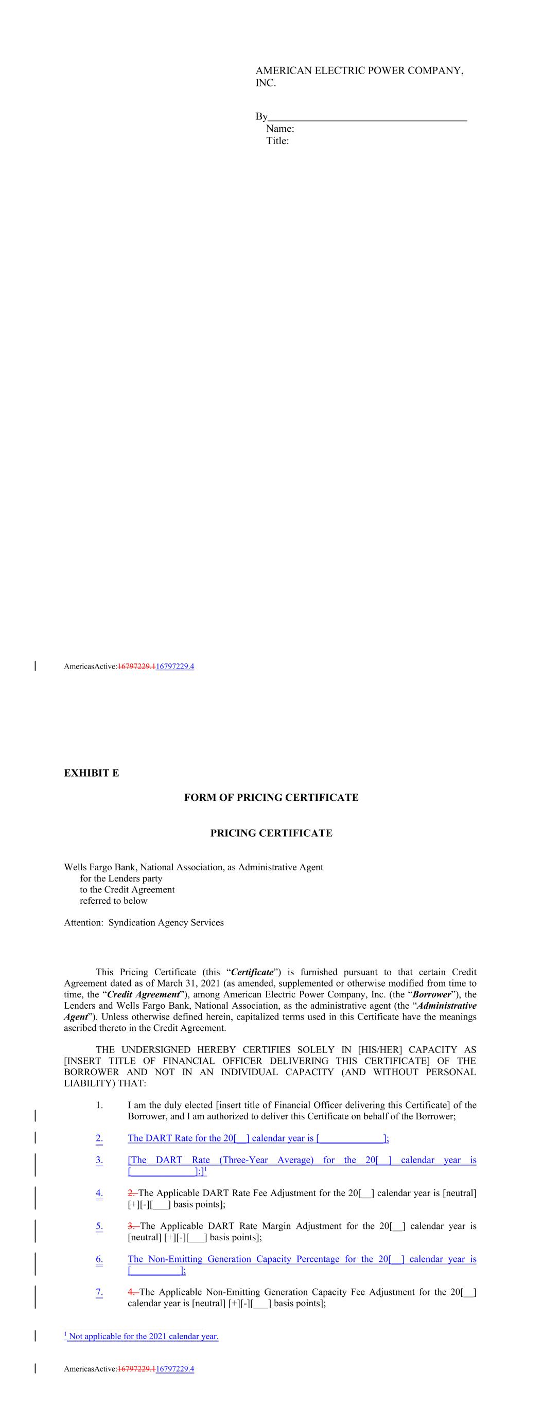 AMERICAN ELECTRIC POWER COMPANY, INC. By Name: Title: AmericasActive:16797229.116797229.4 AmericasActive:16797229.116797229.4 EXHIBIT E FORM OF PRICING CERTIFICATE PRICING CERTIFICATE Wells Fargo Bank, National Association, as Administrative Agent for the Lenders party to the Credit Agreement referred to below Attention: Syndication Agency Services This Pricing Certificate (this “Certificate”) is furnished pursuant to that certain Credit Agreement dated as of March 31, 2021 (as amended, supplemented or otherwise modified from time to time, the “Credit Agreement”), among American Electric Power Company, Inc. (the “Borrower”), the Lenders and Wells Fargo Bank, National Association, as the administrative agent (the “Administrative Agent”). Unless otherwise defined herein, capitalized terms used in this Certificate have the meanings ascribed thereto in the Credit Agreement. THE UNDERSIGNED HEREBY CERTIFIES SOLELY IN [HIS/HER] CAPACITY AS [INSERT TITLE OF FINANCIAL OFFICER DELIVERING THIS CERTIFICATE] OF THE BORROWER AND NOT IN AN INDIVIDUAL CAPACITY (AND WITHOUT PERSONAL LIABILITY) THAT: 1. I am the duly elected [insert title of Financial Officer delivering this Certificate] of the Borrower, and I am authorized to deliver this Certificate on behalf of the Borrower; 2. The DART Rate for the 20[__] calendar year is [_____________]; 3. [The DART Rate (Three-Year Average) for the 20[__] calendar year is [_____________];]1 4. 2. The Applicable DART Rate Fee Adjustment for the 20[__] calendar year is [neutral] [+][-][___] basis points]; 5. 3. The Applicable DART Rate Margin Adjustment for the 20[__] calendar year is [neutral] [+][-][___] basis points]; 6. The Non-Emitting Generation Capacity Percentage for the 20[__] calendar year is [__________]; 7. 4. The Applicable Non-Emitting Generation Capacity Fee Adjustment for the 20[__] calendar year is [neutral] [+][-][___] basis points]; 1 Not applicable for the 2021 calendar year.