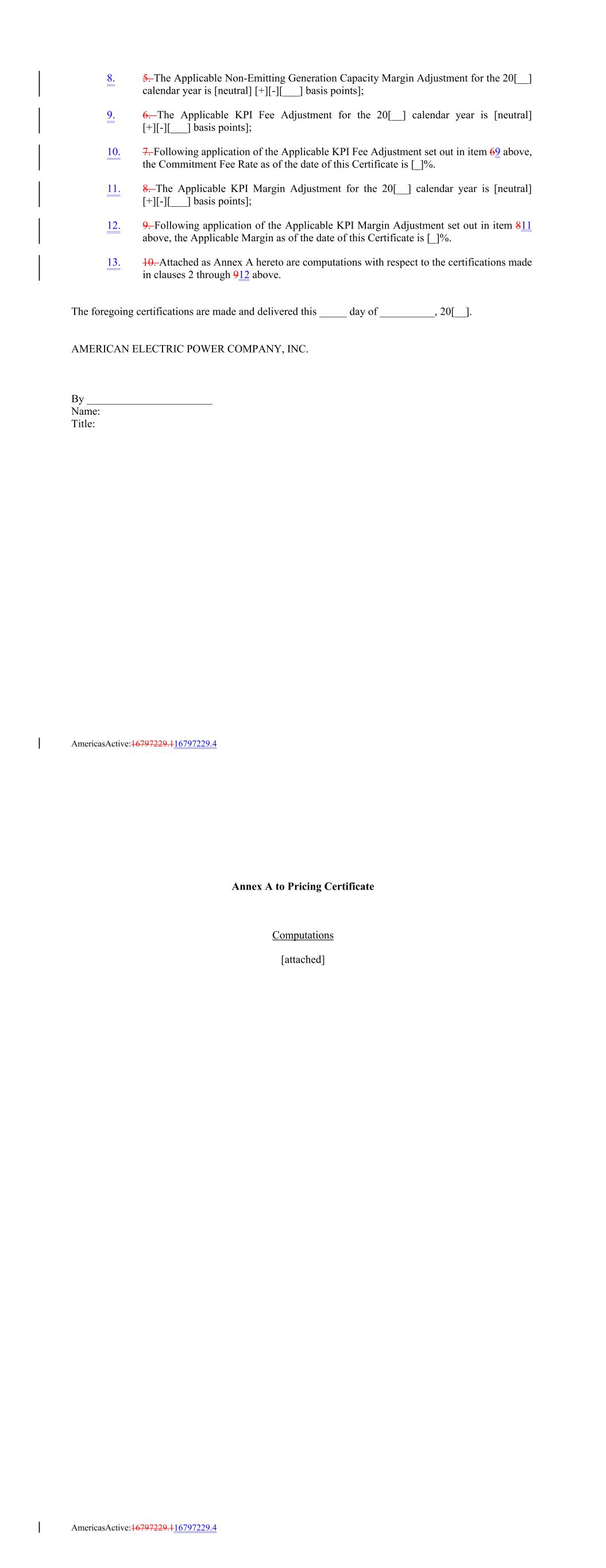 8. 5. The Applicable Non-Emitting Generation Capacity Margin Adjustment for the 20[__] calendar year is [neutral] [+][-][___] basis points]; 9. 6. The Applicable KPI Fee Adjustment for the 20[__] calendar year is [neutral] [+][-][___] basis points]; 10. 7. Following application of the Applicable KPI Fee Adjustment set out in item 69 above, the Commitment Fee Rate as of the date of this Certificate is [_]%. 11. 8. The Applicable KPI Margin Adjustment for the 20[__] calendar year is [neutral] [+][-][___] basis points]; 12. 9. Following application of the Applicable KPI Margin Adjustment set out in item 811 above, the Applicable Margin as of the date of this Certificate is [_]%. 13. 10. Attached as Annex A hereto are computations with respect to the certifications made in clauses 2 through 912 above. The foregoing certifications are made and delivered this _____ day of __________, 20[__]. AMERICAN ELECTRIC POWER COMPANY, INC. By _______________________ Name: Title: AmericasActive:16797229.116797229.4 Annex A to Pricing Certificate Computations [attached] AmericasActive:16797229.116797229.4
