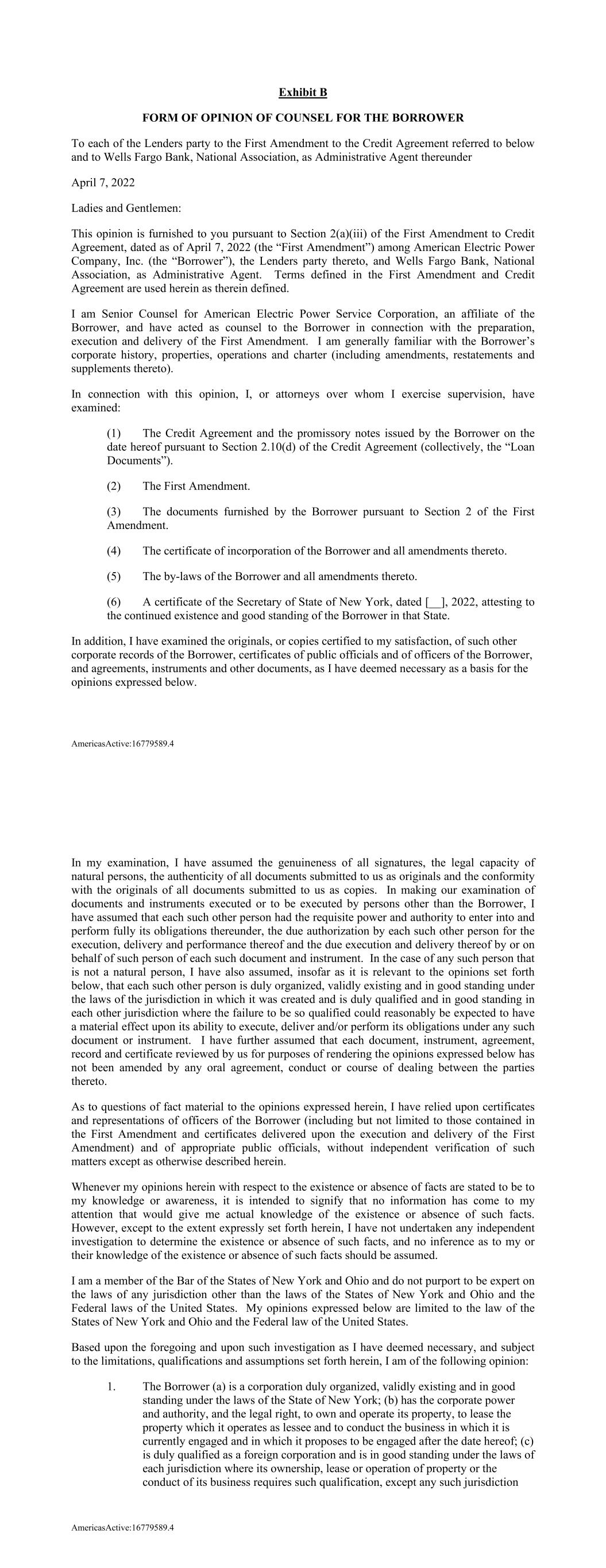 AmericasActive:16779589.4 Exhibit B FORM OF OPINION OF COUNSEL FOR THE BORROWER To each of the Lenders party to the First Amendment to the Credit Agreement referred to below and to Wells Fargo Bank, National Association, as Administrative Agent thereunder April 7, 2022 Ladies and Gentlemen: This opinion is furnished to you pursuant to Section 2(a)(iii) of the First Amendment to Credit Agreement, dated as of April 7, 2022 (the “First Amendment”) among American Electric Power Company, Inc. (the “Borrower”), the Lenders party thereto, and Wells Fargo Bank, National Association, as Administrative Agent. Terms defined in the First Amendment and Credit Agreement are used herein as therein defined. I am Senior Counsel for American Electric Power Service Corporation, an affiliate of the Borrower, and have acted as counsel to the Borrower in connection with the preparation, execution and delivery of the First Amendment. I am generally familiar with the Borrower’s corporate history, properties, operations and charter (including amendments, restatements and supplements thereto). In connection with this opinion, I, or attorneys over whom I exercise supervision, have examined: (1) The Credit Agreement and the promissory notes issued by the Borrower on the date hereof pursuant to Section 2.10(d) of the Credit Agreement (collectively, the “Loan Documents”). (2) The First Amendment. (3) The documents furnished by the Borrower pursuant to Section 2 of the First Amendment. (4) The certificate of incorporation of the Borrower and all amendments thereto. (5) The by-laws of the Borrower and all amendments thereto. (6) A certificate of the Secretary of State of New York, dated [__], 2022, attesting to the continued existence and good standing of the Borrower in that State. In addition, I have examined the originals, or copies certified to my satisfaction, of such other corporate records of the Borrower, certificates of public officials and of officers of the Borrower, and agreements, instruments and other documents, as I have deemed necessary as a basis for the opinions expressed below. AmericasActive:16779589.4 In my examination, I have assumed the genuineness of all signatures, the legal capacity of natural persons, the authenticity of all documents submitted to us as originals and the conformity with the originals of all documents submitted to us as copies. In making our examination of documents and instruments executed or to be executed by persons other than the Borrower, I have assumed that each such other person had the requisite power and authority to enter into and perform fully its obligations thereunder, the due authorization by each such other person for the execution, delivery and performance thereof and the due execution and delivery thereof by or on behalf of such person of each such document and instrument. In the case of any such person that is not a natural person, I have also assumed, insofar as it is relevant to the opinions set forth below, that each such other person is duly organized, validly existing and in good standing under the laws of the jurisdiction in which it was created and is duly qualified and in good standing in each other jurisdiction where the failure to be so qualified could reasonably be expected to have a material effect upon its ability to execute, deliver and/or perform its obligations under any such document or instrument. I have further assumed that each document, instrument, agreement, record and certificate reviewed by us for purposes of rendering the opinions expressed below has not been amended by any oral agreement, conduct or course of dealing between the parties thereto. As to questions of fact material to the opinions expressed herein, I have relied upon certificates and representations of officers of the Borrower (including but not limited to those contained in the First Amendment and certificates delivered upon the execution and delivery of the First Amendment) and of appropriate public officials, without independent verification of such matters except as otherwise described herein. Whenever my opinions herein with respect to the existence or absence of facts are stated to be to my knowledge or awareness, it is intended to signify that no information has come to my attention that would give me actual knowledge of the existence or absence of such facts. However, except to the extent expressly set forth herein, I have not undertaken any independent investigation to determine the existence or absence of such facts, and no inference as to my or their knowledge of the existence or absence of such facts should be assumed. I am a member of the Bar of the States of New York and Ohio and do not purport to be expert on the laws of any jurisdiction other than the laws of the States of New York and Ohio and the Federal laws of the United States. My opinions expressed below are limited to the law of the States of New York and Ohio and the Federal law of the United States. Based upon the foregoing and upon such investigation as I have deemed necessary, and subject to the limitations, qualifications and assumptions set forth herein, I am of the following opinion: 1. The Borrower (a) is a corporation duly organized, validly existing and in good standing under the laws of the State of New York; (b) has the corporate power and authority, and the legal right, to own and operate its property, to lease the property which it operates as lessee and to conduct the business in which it is currently engaged and in which it proposes to be engaged after the date hereof; (c) is duly qualified as a foreign corporation and is in good standing under the laws of each jurisdiction where its ownership, lease or operation of property or the conduct of its business requires such qualification, except any such jurisdiction