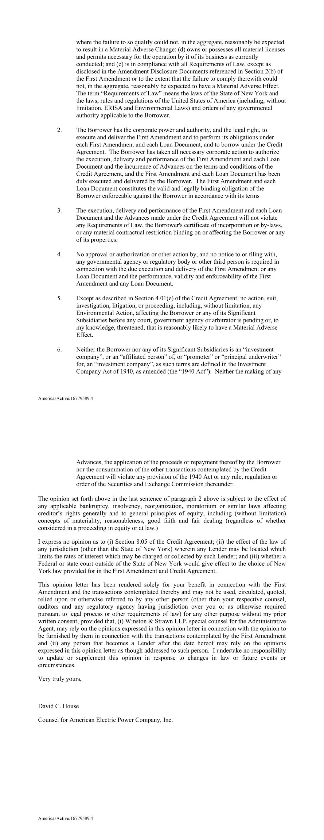 AmericasActive:16779589.4 where the failure to so qualify could not, in the aggregate, reasonably be expected to result in a Material Adverse Change; (d) owns or possesses all material licenses and permits necessary for the operation by it of its business as currently conducted; and (e) is in compliance with all Requirements of Law, except as disclosed in the Amendment Disclosure Documents referenced in Section 2(b) of the First Amendment or to the extent that the failure to comply therewith could not, in the aggregate, reasonably be expected to have a Material Adverse Effect. The term “Requirements of Law” means the laws of the State of New York and the laws, rules and regulations of the United States of America (including, without limitation, ERISA and Environmental Laws) and orders of any governmental authority applicable to the Borrower. 2. The Borrower has the corporate power and authority, and the legal right, to execute and deliver the First Amendment and to perform its obligations under each First Amendment and each Loan Document, and to borrow under the Credit Agreement. The Borrower has taken all necessary corporate action to authorize the execution, delivery and performance of the First Amendment and each Loan Document and the incurrence of Advances on the terms and conditions of the Credit Agreement, and the First Amendment and each Loan Document has been duly executed and delivered by the Borrower. The First Amendment and each Loan Document constitutes the valid and legally binding obligation of the Borrower enforceable against the Borrower in accordance with its terms 3. The execution, delivery and performance of the First Amendment and each Loan Document and the Advances made under the Credit Agreement will not violate any Requirements of Law, the Borrower's certificate of incorporation or by-laws, or any material contractual restriction binding on or affecting the Borrower or any of its properties. 4. No approval or authorization or other action by, and no notice to or filing with, any governmental agency or regulatory body or other third person is required in connection with the due execution and delivery of the First Amendment or any Loan Document and the performance, validity and enforceability of the First Amendment and any Loan Document. 5. Except as described in Section 4.01(e) of the Credit Agreement, no action, suit, investigation, litigation, or proceeding, including, without limitation, any Environmental Action, affecting the Borrower or any of its Significant Subsidiaries before any court, government agency or arbitrator is pending or, to my knowledge, threatened, that is reasonably likely to have a Material Adverse Effect. 6. Neither the Borrower nor any of its Significant Subsidiaries is an “investment company”, or an “affiliated person” of, or “promoter” or “principal underwriter” for, an “investment company”, as such terms are defined in the Investment Company Act of 1940, as amended (the “1940 Act”). Neither the making of any AmericasActive:16779589.4 Advances, the application of the proceeds or repayment thereof by the Borrower nor the consummation of the other transactions contemplated by the Credit Agreement will violate any provision of the 1940 Act or any rule, regulation or order of the Securities and Exchange Commission thereunder. The opinion set forth above in the last sentence of paragraph 2 above is subject to the effect of any applicable bankruptcy, insolvency, reorganization, moratorium or similar laws affecting creditor’s rights generally and to general principles of equity, including (without limitation) concepts of materiality, reasonableness, good faith and fair dealing (regardless of whether considered in a proceeding in equity or at law.) I express no opinion as to (i) Section 8.05 of the Credit Agreement; (ii) the effect of the law of any jurisdiction (other than the State of New York) wherein any Lender may be located which limits the rates of interest which may be charged or collected by such Lender; and (iii) whether a Federal or state court outside of the State of New York would give effect to the choice of New York law provided for in the First Amendment and Credit Agreement. This opinion letter has been rendered solely for your benefit in connection with the First Amendment and the transactions contemplated thereby and may not be used, circulated, quoted, relied upon or otherwise referred to by any other person (other than your respective counsel, auditors and any regulatory agency having jurisdiction over you or as otherwise required pursuant to legal process or other requirements of law) for any other purpose without my prior written consent; provided that, (i) Winston & Strawn LLP, special counsel for the Administrative Agent, may rely on the opinions expressed in this opinion letter in connection with the opinion to be furnished by them in connection with the transactions contemplated by the First Amendment and (ii) any person that becomes a Lender after the date hereof may rely on the opinions expressed in this opinion letter as though addressed to such person. I undertake no responsibility to update or supplement this opinion in response to changes in law or future events or circumstances. Very truly yours, David C. House Counsel for American Electric Power Company, Inc.