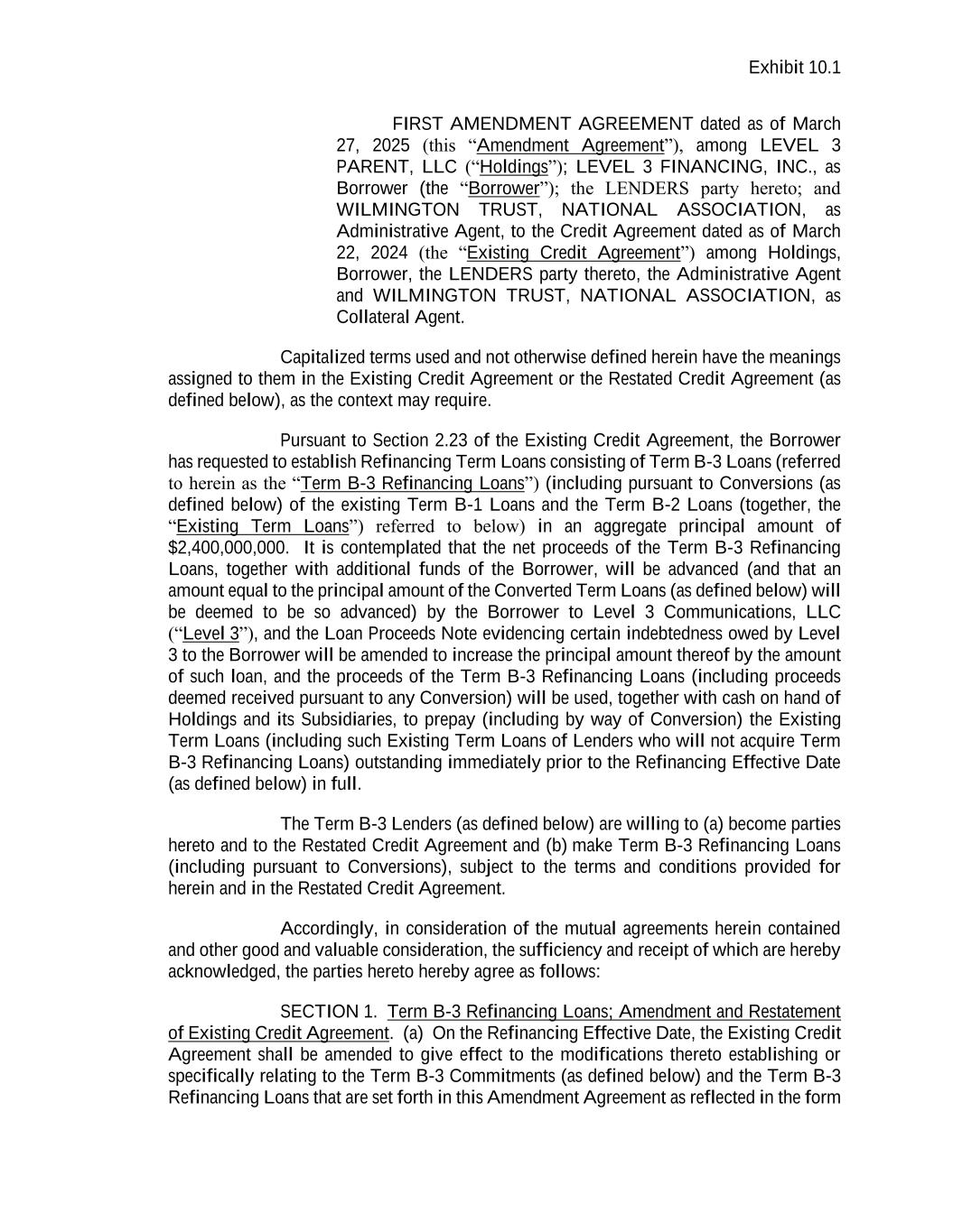Exhibit 10.1 FIRST AMENDMENT AGREEMENT dated as of March 27, 2025 (this “Amendment Agreement”), among LEVEL 3 PARENT, LLC (“Holdings”); LEVEL 3 FINANCING, INC., as Borrower (the “Borrower”); the LENDERS party hereto; and WILMINGTON TRUST, NATIONAL ASSOCIATION, as Administrative Agent, to the Credit Agreement dated as of March 22, 2024 (the “Existing Credit Agreement”) among Holdings, Borrower, the LENDERS party thereto, the Administrative Agent and WILMINGTON TRUST, NATIONAL ASSOCIATION, as Collateral Agent. Capitalized terms used and not otherwise defined herein have the meanings assigned to them in the Existing Credit Agreement or the Restated Credit Agreement (as defined below), as the context may require. Pursuant to Section 2.23 of the Existing Credit Agreement, the Borrower has requested to establish Refinancing Term Loans consisting of Term B-3 Loans (referred to herein as the “Term B-3 Refinancing Loans”) (including pursuant to Conversions (as defined below) of the existing Term B-1 Loans and the Term B-2 Loans (together, the “Existing Term Loans”) referred to below) in an aggregate principal amount of $2,400,000,000. It is contemplated that the net proceeds of the Term B-3 Refinancing Loans, together with additional funds of the Borrower, will be advanced (and that an amount equal to the principal amount of the Converted Term Loans (as defined below) will be deemed to be so advanced) by the Borrower to Level 3 Communications, LLC (“Level 3”), and the Loan Proceeds Note evidencing certain indebtedness owed by Level 3 to the Borrower will be amended to increase the principal amount thereof by the amount of such loan, and the proceeds of the Term B-3 Refinancing Loans (including proceeds deemed received pursuant to any Conversion) will be used, together with cash on hand of Holdings and its Subsidiaries, to prepay (including by way of Conversion) the Existing Term Loans (including such Existing Term Loans of Lenders who will not acquire Term B-3 Refinancing Loans) outstanding immediately prior to the Refinancing Effective Date (as defined below) in full. The Term B-3 Lenders (as defined below) are willing to (a) become parties hereto and to the Restated Credit Agreement and (b) make Term B-3 Refinancing Loans (including pursuant to Conversions), subject to the terms and conditions provided for herein and in the Restated Credit Agreement. Accordingly, in consideration of the mutual agreements herein contained and other good and valuable consideration, the sufficiency and receipt of which are hereby acknowledged, the parties hereto hereby agree as follows: SECTION 1. Term B-3 Refinancing Loans; Amendment and Restatement of Existing Credit Agreement. (a) On the Refinancing Effective Date, the Existing Credit Agreement shall be amended to give effect to the modifications thereto establishing or specifically relating to the Term B-3 Commitments (as defined below) and the Term B-3 Refinancing Loans that are set forth in this Amendment Agreement as reflected in the form
