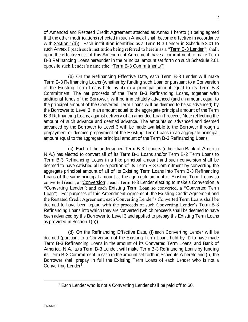 2 [[6727544]] of Amended and Restated Credit Agreement attached as Annex I hereto (it being agreed that the other modifications reflected in such Annex I shall become effective in accordance with Section 1(d)). Each institution identified as a Term B-3 Lender in Schedule 2.01 to such Annex I (each such institution being referred to herein as a “Term B-3 Lender”) shall, upon the effectiveness of this Amendment Agreement, have a commitment to make Term B-3 Refinancing Loans hereunder in the principal amount set forth on such Schedule 2.01 opposite such Lender’s name (the “Term B-3 Commitments”). (b) On the Refinancing Effective Date, each Term B-3 Lender will make Term B-3 Refinancing Loans (whether by funding such Loan or pursuant to a Conversion of the Existing Term Loans held by it) in a principal amount equal to its Term B-3 Commitment. The net proceeds of the Term B-3 Refinancing Loans, together with additional funds of the Borrower, will be immediately advanced (and an amount equal to the principal amount of the Converted Term Loans will be deemed to be so advanced) by the Borrower to Level 3 in an amount equal to the aggregate principal amount of the Term B-3 Refinancing Loans, against delivery of an amended Loan Proceeds Note reflecting the amount of such advance and deemed advance. The amounts so advanced and deemed advanced by the Borrower to Level 3 will be made available to the Borrower through a prepayment or deemed prepayment of the Existing Term Loans in an aggregate principal amount equal to the aggregate principal amount of the Term B-3 Refinancing Loans. (c) Each of the undersigned Term B-3 Lenders (other than Bank of America N.A.) has elected to convert all of its Term B-1 Loans and/or Term B-2 Term Loans to Term B-3 Refinancing Loans in a like principal amount and such conversion shall be deemed to have satisfied all or a portion of its Term B-3 Commitment by converting the aggregate principal amount of all of its Existing Term Loans into Term B-3 Refinancing Loans of the same principal amount as the aggregate amount of Existing Term Loans so converted (each, a “Conversion”; each Term B-3 Lender electing to make a Conversion, a “Converting Lender”; and each Existing Term Loan so converted, a “Converted Term Loan”). For purposes of this Amendment Agreement, the Existing Credit Agreement and the Restated Credit Agreement, each Converting Lender’s Converted Term Loans shall be deemed to have been repaid with the proceeds of such Converting Lender’s Term B-3 Refinancing Loans into which they are converted (which proceeds shall be deemed to have been advanced by the Borrower to Level 3 and applied to prepay the Existing Term Loans as provided in Section 1(b)). (d) On the Refinancing Effective Date, (i) each Converting Lender will be deemed (pursuant to a Conversion of the Existing Term Loans held by it) to have made Term B-3 Refinancing Loans in the amount of its Converted Term Loans, and Bank of America, N.A., as a Term B-3 Lender, will make Term B-3 Refinancing Loans by funding its Term B-3 Commitment in cash in the amount set forth in Schedule A hereto and (ii) the Borrower shall prepay in full the Existing Term Loans of each Lender who is not a Converting Lender1. 1 Each Lender who is not a Converting Lender shall be paid off to $0.