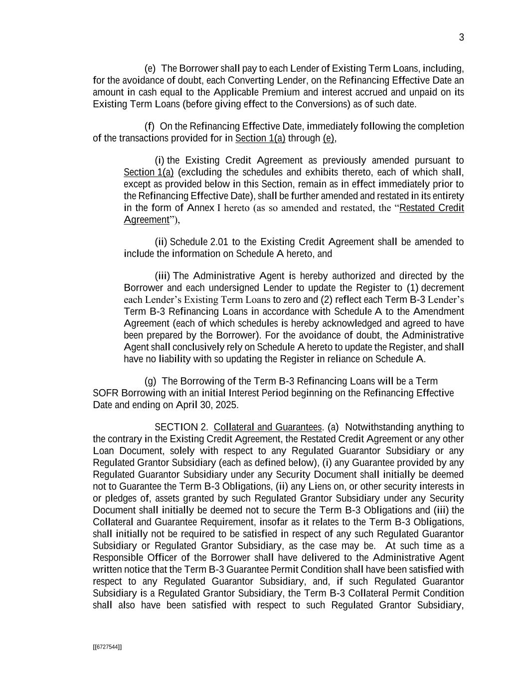 3 [[6727544]] (e) The Borrower shall pay to each Lender of Existing Term Loans, including, for the avoidance of doubt, each Converting Lender, on the Refinancing Effective Date an amount in cash equal to the Applicable Premium and interest accrued and unpaid on its Existing Term Loans (before giving effect to the Conversions) as of such date. (f) On the Refinancing Effective Date, immediately following the completion of the transactions provided for in Section 1(a) through (e), (i) the Existing Credit Agreement as previously amended pursuant to Section 1(a) (excluding the schedules and exhibits thereto, each of which shall, except as provided below in this Section, remain as in effect immediately prior to the Refinancing Effective Date), shall be further amended and restated in its entirety in the form of Annex I hereto (as so amended and restated, the “Restated Credit Agreement”), (ii) Schedule 2.01 to the Existing Credit Agreement shall be amended to include the information on Schedule A hereto, and (iii) The Administrative Agent is hereby authorized and directed by the Borrower and each undersigned Lender to update the Register to (1) decrement each Lender’s Existing Term Loans to zero and (2) reflect each Term B-3 Lender’s Term B-3 Refinancing Loans in accordance with Schedule A to the Amendment Agreement (each of which schedules is hereby acknowledged and agreed to have been prepared by the Borrower). For the avoidance of doubt, the Administrative Agent shall conclusively rely on Schedule A hereto to update the Register, and shall have no liability with so updating the Register in reliance on Schedule A. (g) The Borrowing of the Term B-3 Refinancing Loans will be a Term SOFR Borrowing with an initial Interest Period beginning on the Refinancing Effective Date and ending on April 30, 2025. SECTION 2. Collateral and Guarantees. (a) Notwithstanding anything to the contrary in the Existing Credit Agreement, the Restated Credit Agreement or any other Loan Document, solely with respect to any Regulated Guarantor Subsidiary or any Regulated Grantor Subsidiary (each as defined below), (i) any Guarantee provided by any Regulated Guarantor Subsidiary under any Security Document shall initially be deemed not to Guarantee the Term B-3 Obligations, (ii) any Liens on, or other security interests in or pledges of, assets granted by such Regulated Grantor Subsidiary under any Security Document shall initially be deemed not to secure the Term B-3 Obligations and (iii) the Collateral and Guarantee Requirement, insofar as it relates to the Term B-3 Obligations, shall initially not be required to be satisfied in respect of any such Regulated Guarantor Subsidiary or Regulated Grantor Subsidiary, as the case may be. At such time as a Responsible Officer of the Borrower shall have delivered to the Administrative Agent written notice that the Term B-3 Guarantee Permit Condition shall have been satisfied with respect to any Regulated Guarantor Subsidiary, and, if such Regulated Guarantor Subsidiary is a Regulated Grantor Subsidiary, the Term B-3 Collateral Permit Condition shall also have been satisfied with respect to such Regulated Grantor Subsidiary,