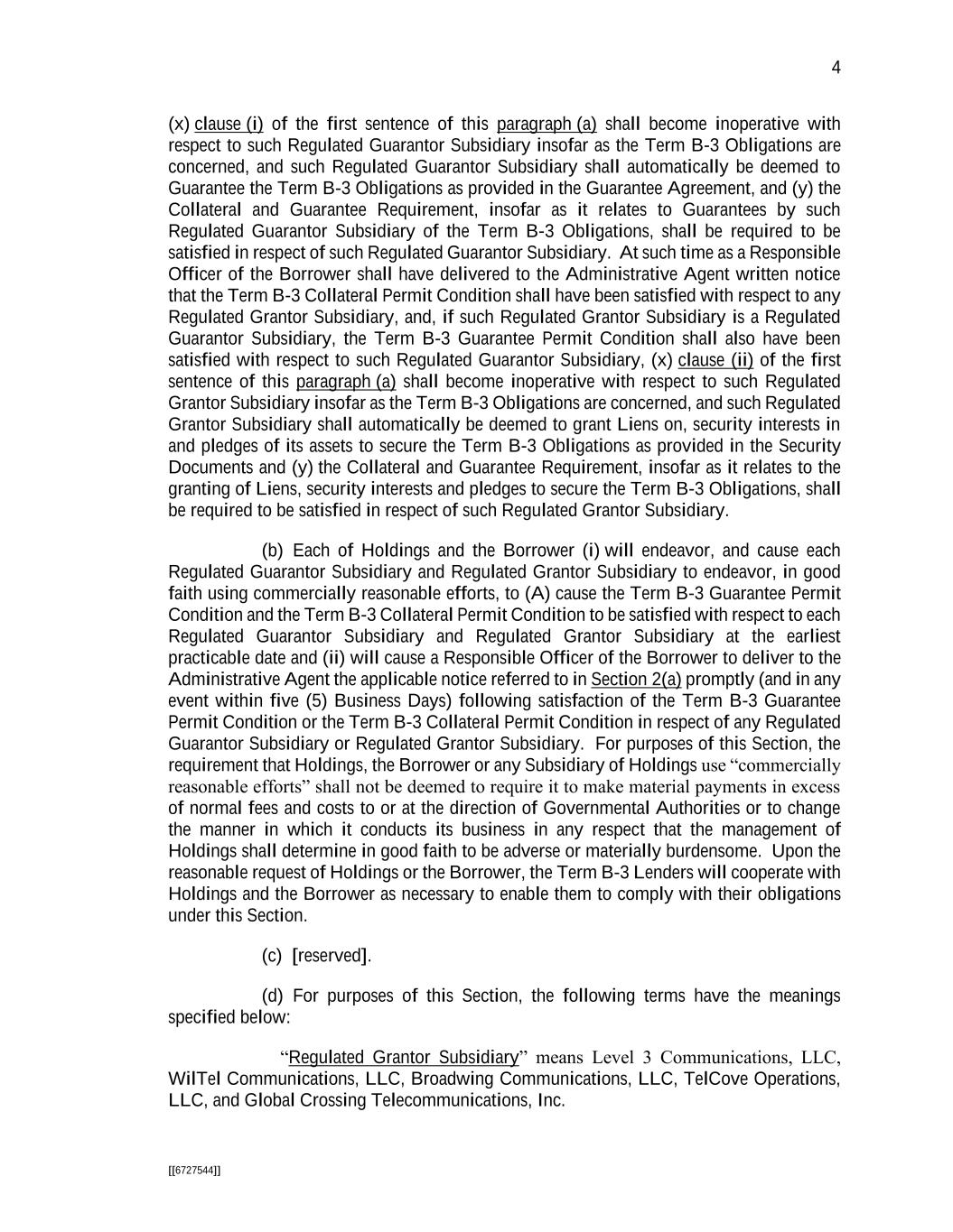 4 [[6727544]] (x) clause (i) of the first sentence of this paragraph (a) shall become inoperative with respect to such Regulated Guarantor Subsidiary insofar as the Term B-3 Obligations are concerned, and such Regulated Guarantor Subsidiary shall automatically be deemed to Guarantee the Term B-3 Obligations as provided in the Guarantee Agreement, and (y) the Collateral and Guarantee Requirement, insofar as it relates to Guarantees by such Regulated Guarantor Subsidiary of the Term B-3 Obligations, shall be required to be satisfied in respect of such Regulated Guarantor Subsidiary. At such time as a Responsible Officer of the Borrower shall have delivered to the Administrative Agent written notice that the Term B-3 Collateral Permit Condition shall have been satisfied with respect to any Regulated Grantor Subsidiary, and, if such Regulated Grantor Subsidiary is a Regulated Guarantor Subsidiary, the Term B-3 Guarantee Permit Condition shall also have been satisfied with respect to such Regulated Guarantor Subsidiary, (x) clause (ii) of the first sentence of this paragraph (a) shall become inoperative with respect to such Regulated Grantor Subsidiary insofar as the Term B-3 Obligations are concerned, and such Regulated Grantor Subsidiary shall automatically be deemed to grant Liens on, security interests in and pledges of its assets to secure the Term B-3 Obligations as provided in the Security Documents and (y) the Collateral and Guarantee Requirement, insofar as it relates to the granting of Liens, security interests and pledges to secure the Term B-3 Obligations, shall be required to be satisfied in respect of such Regulated Grantor Subsidiary. (b) Each of Holdings and the Borrower (i) will endeavor, and cause each Regulated Guarantor Subsidiary and Regulated Grantor Subsidiary to endeavor, in good faith using commercially reasonable efforts, to (A) cause the Term B-3 Guarantee Permit Condition and the Term B-3 Collateral Permit Condition to be satisfied with respect to each Regulated Guarantor Subsidiary and Regulated Grantor Subsidiary at the earliest practicable date and (ii) will cause a Responsible Officer of the Borrower to deliver to the Administrative Agent the applicable notice referred to in Section 2(a) promptly (and in any event within five (5) Business Days) following satisfaction of the Term B-3 Guarantee Permit Condition or the Term B-3 Collateral Permit Condition in respect of any Regulated Guarantor Subsidiary or Regulated Grantor Subsidiary. For purposes of this Section, the requirement that Holdings, the Borrower or any Subsidiary of Holdings use “commercially reasonable efforts” shall not be deemed to require it to make material payments in excess of normal fees and costs to or at the direction of Governmental Authorities or to change the manner in which it conducts its business in any respect that the management of Holdings shall determine in good faith to be adverse or materially burdensome. Upon the reasonable request of Holdings or the Borrower, the Term B-3 Lenders will cooperate with Holdings and the Borrower as necessary to enable them to comply with their obligations under this Section. (c) [reserved]. (d) For purposes of this Section, the following terms have the meanings specified below: “Regulated Grantor Subsidiary” means Level 3 Communications, LLC, WilTel Communications, LLC, Broadwing Communications, LLC, TelCove Operations, LLC, and Global Crossing Telecommunications, Inc.