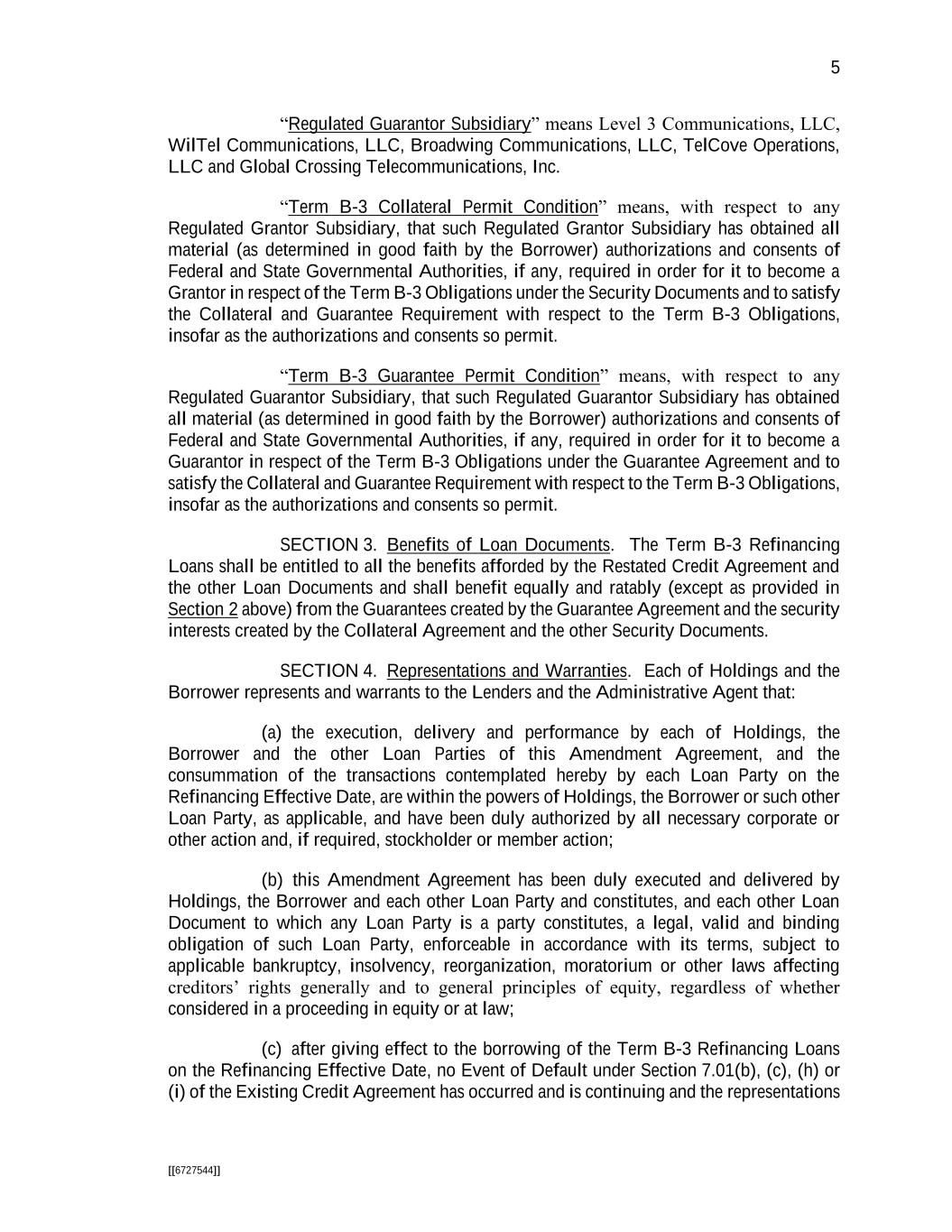 5 [[6727544]] “Regulated Guarantor Subsidiary” means Level 3 Communications, LLC, WilTel Communications, LLC, Broadwing Communications, LLC, TelCove Operations, LLC and Global Crossing Telecommunications, Inc. “Term B-3 Collateral Permit Condition” means, with respect to any Regulated Grantor Subsidiary, that such Regulated Grantor Subsidiary has obtained all material (as determined in good faith by the Borrower) authorizations and consents of Federal and State Governmental Authorities, if any, required in order for it to become a Grantor in respect of the Term B-3 Obligations under the Security Documents and to satisfy the Collateral and Guarantee Requirement with respect to the Term B-3 Obligations, insofar as the authorizations and consents so permit. “Term B-3 Guarantee Permit Condition” means, with respect to any Regulated Guarantor Subsidiary, that such Regulated Guarantor Subsidiary has obtained all material (as determined in good faith by the Borrower) authorizations and consents of Federal and State Governmental Authorities, if any, required in order for it to become a Guarantor in respect of the Term B-3 Obligations under the Guarantee Agreement and to satisfy the Collateral and Guarantee Requirement with respect to the Term B-3 Obligations, insofar as the authorizations and consents so permit. SECTION 3. Benefits of Loan Documents. The Term B-3 Refinancing Loans shall be entitled to all the benefits afforded by the Restated Credit Agreement and the other Loan Documents and shall benefit equally and ratably (except as provided in Section 2 above) from the Guarantees created by the Guarantee Agreement and the security interests created by the Collateral Agreement and the other Security Documents. SECTION 4. Representations and Warranties. Each of Holdings and the Borrower represents and warrants to the Lenders and the Administrative Agent that: (a) the execution, delivery and performance by each of Holdings, the Borrower and the other Loan Parties of this Amendment Agreement, and the consummation of the transactions contemplated hereby by each Loan Party on the Refinancing Effective Date, are within the powers of Holdings, the Borrower or such other Loan Party, as applicable, and have been duly authorized by all necessary corporate or other action and, if required, stockholder or member action; (b) this Amendment Agreement has been duly executed and delivered by Holdings, the Borrower and each other Loan Party and constitutes, and each other Loan Document to which any Loan Party is a party constitutes, a legal, valid and binding obligation of such Loan Party, enforceable in accordance with its terms, subject to applicable bankruptcy, insolvency, reorganization, moratorium or other laws affecting creditors’ rights generally and to general principles of equity, regardless of whether considered in a proceeding in equity or at law; (c) after giving effect to the borrowing of the Term B-3 Refinancing Loans on the Refinancing Effective Date, no Event of Default under Section 7.01(b), (c), (h) or (i) of the Existing Credit Agreement has occurred and is continuing and the representations