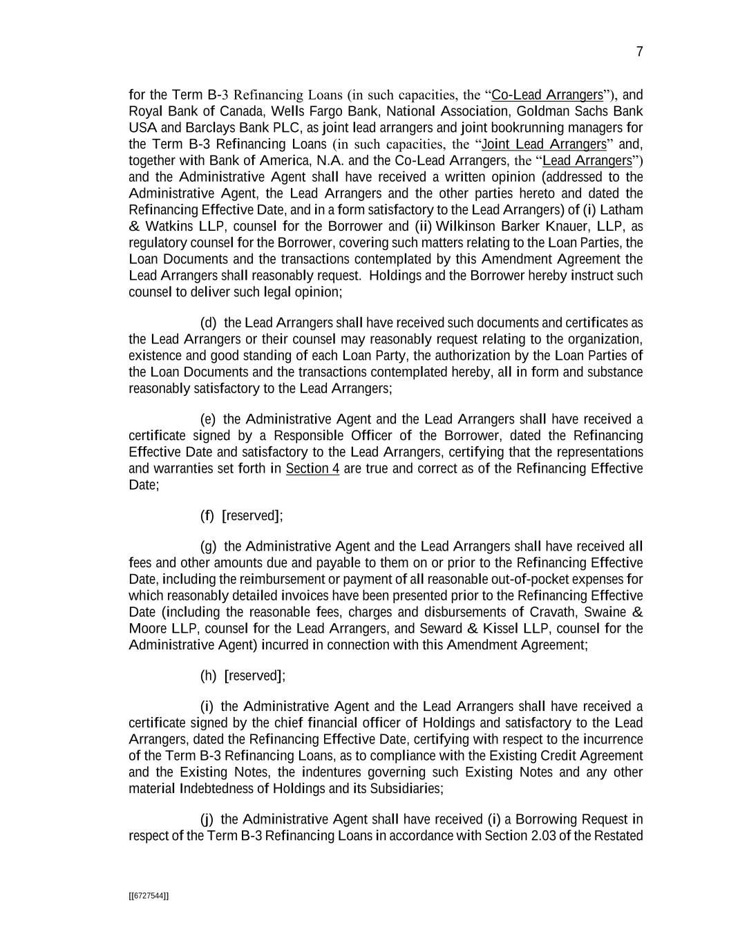 7 [[6727544]] for the Term B-3 Refinancing Loans (in such capacities, the “Co-Lead Arrangers”), and Royal Bank of Canada, Wells Fargo Bank, National Association, Goldman Sachs Bank USA and Barclays Bank PLC, as joint lead arrangers and joint bookrunning managers for the Term B-3 Refinancing Loans (in such capacities, the “Joint Lead Arrangers” and, together with Bank of America, N.A. and the Co-Lead Arrangers, the “Lead Arrangers”) and the Administrative Agent shall have received a written opinion (addressed to the Administrative Agent, the Lead Arrangers and the other parties hereto and dated the Refinancing Effective Date, and in a form satisfactory to the Lead Arrangers) of (i) Latham & Watkins LLP, counsel for the Borrower and (ii) Wilkinson Barker Knauer, LLP, as regulatory counsel for the Borrower, covering such matters relating to the Loan Parties, the Loan Documents and the transactions contemplated by this Amendment Agreement the Lead Arrangers shall reasonably request. Holdings and the Borrower hereby instruct such counsel to deliver such legal opinion; (d) the Lead Arrangers shall have received such documents and certificates as the Lead Arrangers or their counsel may reasonably request relating to the organization, existence and good standing of each Loan Party, the authorization by the Loan Parties of the Loan Documents and the transactions contemplated hereby, all in form and substance reasonably satisfactory to the Lead Arrangers; (e) the Administrative Agent and the Lead Arrangers shall have received a certificate signed by a Responsible Officer of the Borrower, dated the Refinancing Effective Date and satisfactory to the Lead Arrangers, certifying that the representations and warranties set forth in Section 4 are true and correct as of the Refinancing Effective Date; (f) [reserved]; (g) the Administrative Agent and the Lead Arrangers shall have received all fees and other amounts due and payable to them on or prior to the Refinancing Effective Date, including the reimbursement or payment of all reasonable out-of-pocket expenses for which reasonably detailed invoices have been presented prior to the Refinancing Effective Date (including the reasonable fees, charges and disbursements of Cravath, Swaine & Moore LLP, counsel for the Lead Arrangers, and Seward & Kissel LLP, counsel for the Administrative Agent) incurred in connection with this Amendment Agreement; (h) [reserved]; (i) the Administrative Agent and the Lead Arrangers shall have received a certificate signed by the chief financial officer of Holdings and satisfactory to the Lead Arrangers, dated the Refinancing Effective Date, certifying with respect to the incurrence of the Term B-3 Refinancing Loans, as to compliance with the Existing Credit Agreement and the Existing Notes, the indentures governing such Existing Notes and any other material Indebtedness of Holdings and its Subsidiaries; (j) the Administrative Agent shall have received (i) a Borrowing Request in respect of the Term B-3 Refinancing Loans in accordance with Section 2.03 of the Restated