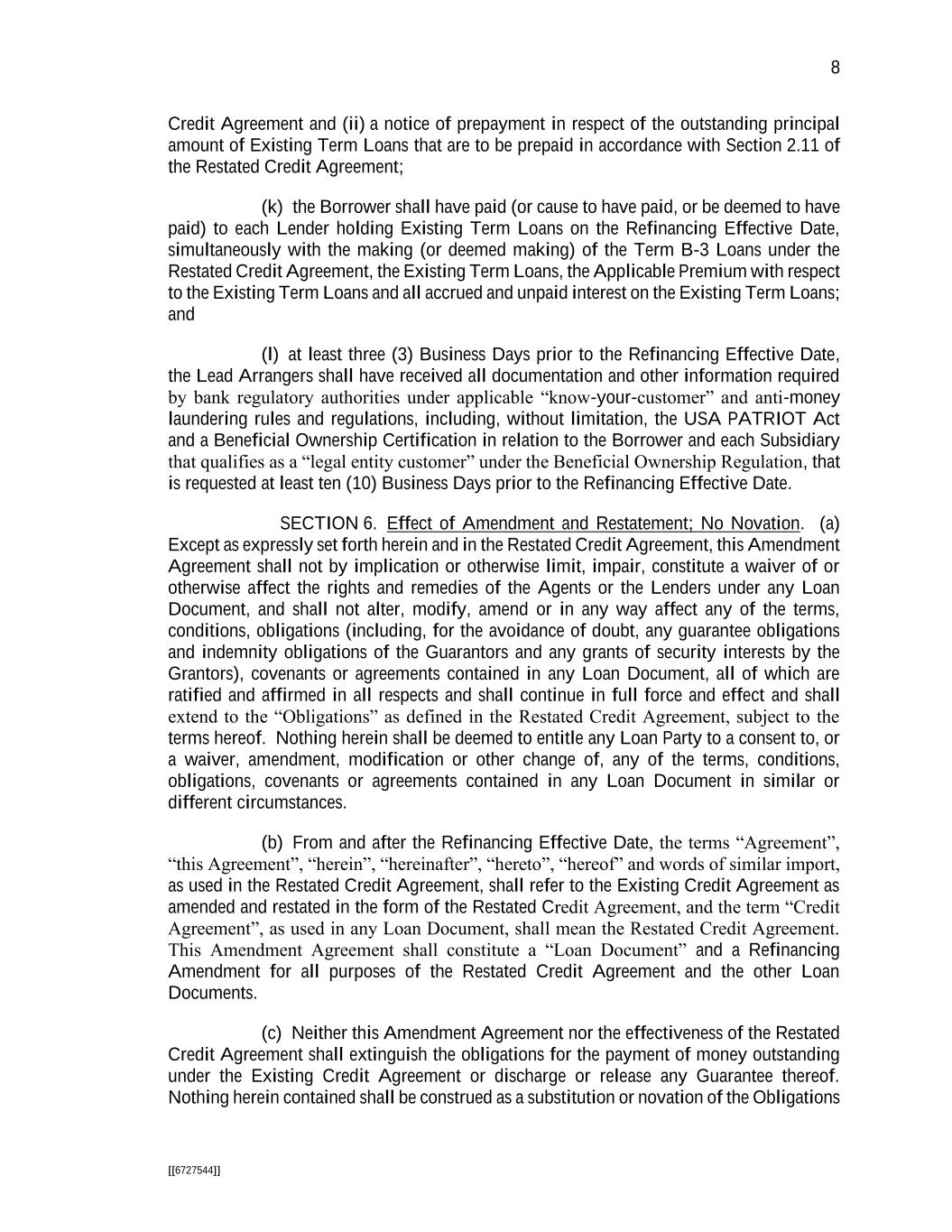 8 [[6727544]] Credit Agreement and (ii) a notice of prepayment in respect of the outstanding principal amount of Existing Term Loans that are to be prepaid in accordance with Section 2.11 of the Restated Credit Agreement; (k) the Borrower shall have paid (or cause to have paid, or be deemed to have paid) to each Lender holding Existing Term Loans on the Refinancing Effective Date, simultaneously with the making (or deemed making) of the Term B-3 Loans under the Restated Credit Agreement, the Existing Term Loans, the Applicable Premium with respect to the Existing Term Loans and all accrued and unpaid interest on the Existing Term Loans; and (l) at least three (3) Business Days prior to the Refinancing Effective Date, the Lead Arrangers shall have received all documentation and other information required by bank regulatory authorities under applicable “know-your-customer” and anti-money laundering rules and regulations, including, without limitation, the USA PATRIOT Act and a Beneficial Ownership Certification in relation to the Borrower and each Subsidiary that qualifies as a “legal entity customer” under the Beneficial Ownership Regulation, that is requested at least ten (10) Business Days prior to the Refinancing Effective Date. SECTION 6. Effect of Amendment and Restatement; No Novation. (a) Except as expressly set forth herein and in the Restated Credit Agreement, this Amendment Agreement shall not by implication or otherwise limit, impair, constitute a waiver of or otherwise affect the rights and remedies of the Agents or the Lenders under any Loan Document, and shall not alter, modify, amend or in any way affect any of the terms, conditions, obligations (including, for the avoidance of doubt, any guarantee obligations and indemnity obligations of the Guarantors and any grants of security interests by the Grantors), covenants or agreements contained in any Loan Document, all of which are ratified and affirmed in all respects and shall continue in full force and effect and shall extend to the “Obligations” as defined in the Restated Credit Agreement, subject to the terms hereof. Nothing herein shall be deemed to entitle any Loan Party to a consent to, or a waiver, amendment, modification or other change of, any of the terms, conditions, obligations, covenants or agreements contained in any Loan Document in similar or different circumstances. (b) From and after the Refinancing Effective Date, the terms “Agreement”, “this Agreement”, “herein”, “hereinafter”, “hereto”, “hereof” and words of similar import, as used in the Restated Credit Agreement, shall refer to the Existing Credit Agreement as amended and restated in the form of the Restated Credit Agreement, and the term “Credit Agreement”, as used in any Loan Document, shall mean the Restated Credit Agreement. This Amendment Agreement shall constitute a “Loan Document” and a Refinancing Amendment for all purposes of the Restated Credit Agreement and the other Loan Documents. (c) Neither this Amendment Agreement nor the effectiveness of the Restated Credit Agreement shall extinguish the obligations for the payment of money outstanding under the Existing Credit Agreement or discharge or release any Guarantee thereof. Nothing herein contained shall be construed as a substitution or novation of the Obligations