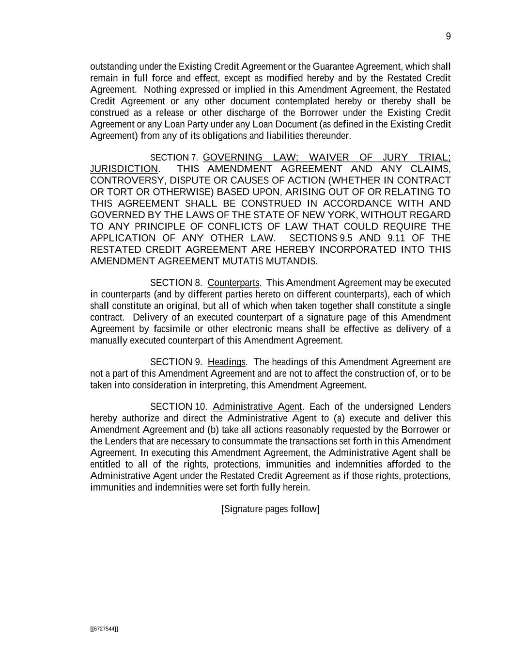 9 [[6727544]] outstanding under the Existing Credit Agreement or the Guarantee Agreement, which shall remain in full force and effect, except as modified hereby and by the Restated Credit Agreement. Nothing expressed or implied in this Amendment Agreement, the Restated Credit Agreement or any other document contemplated hereby or thereby shall be construed as a release or other discharge of the Borrower under the Existing Credit Agreement or any Loan Party under any Loan Document (as defined in the Existing Credit Agreement) from any of its obligations and liabilities thereunder. SECTION 7. GOVERNING LAW; WAIVER OF JURY TRIAL; JURISDICTION. THIS AMENDMENT AGREEMENT AND ANY CLAIMS, CONTROVERSY, DISPUTE OR CAUSES OF ACTION (WHETHER IN CONTRACT OR TORT OR OTHERWISE) BASED UPON, ARISING OUT OF OR RELATING TO THIS AGREEMENT SHALL BE CONSTRUED IN ACCORDANCE WITH AND GOVERNED BY THE LAWS OF THE STATE OF NEW YORK, WITHOUT REGARD TO ANY PRINCIPLE OF CONFLICTS OF LAW THAT COULD REQUIRE THE APPLICATION OF ANY OTHER LAW. SECTIONS 9.5 AND 9.11 OF THE RESTATED CREDIT AGREEMENT ARE HEREBY INCORPORATED INTO THIS AMENDMENT AGREEMENT MUTATIS MUTANDIS. SECTION 8. Counterparts. This Amendment Agreement may be executed in counterparts (and by different parties hereto on different counterparts), each of which shall constitute an original, but all of which when taken together shall constitute a single contract. Delivery of an executed counterpart of a signature page of this Amendment Agreement by facsimile or other electronic means shall be effective as delivery of a manually executed counterpart of this Amendment Agreement. SECTION 9. Headings. The headings of this Amendment Agreement are not a part of this Amendment Agreement and are not to affect the construction of, or to be taken into consideration in interpreting, this Amendment Agreement. SECTION 10. Administrative Agent. Each of the undersigned Lenders hereby authorize and direct the Administrative Agent to (a) execute and deliver this Amendment Agreement and (b) take all actions reasonably requested by the Borrower or the Lenders that are necessary to consummate the transactions set forth in this Amendment Agreement. In executing this Amendment Agreement, the Administrative Agent shall be entitled to all of the rights, protections, immunities and indemnities afforded to the Administrative Agent under the Restated Credit Agreement as if those rights, protections, immunities and indemnities were set forth fully herein. [Signature pages follow]