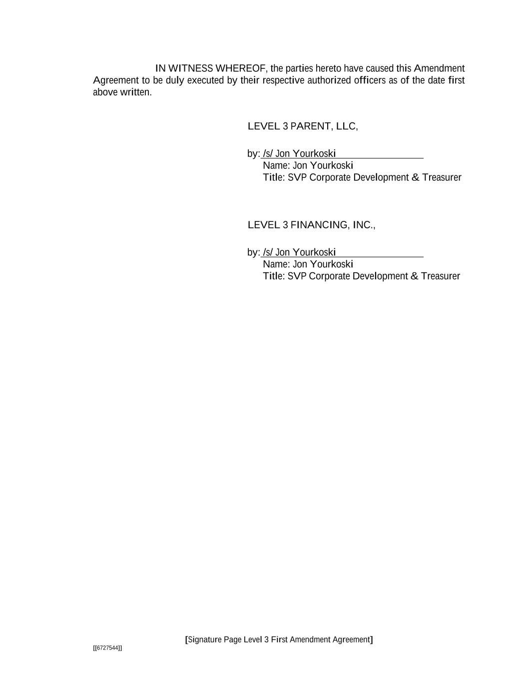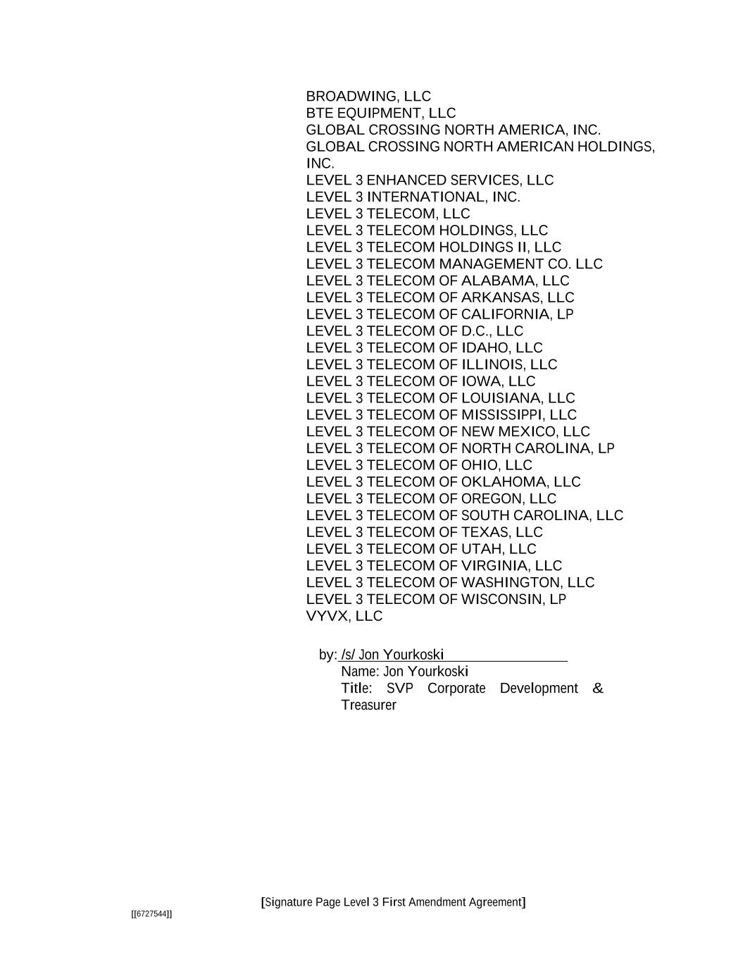 [Signature Page Level 3 First Amendment Agreement] [[6727544]] BROADWING, LLC BTE EQUIPMENT, LLC GLOBAL CROSSING NORTH AMERICA, INC. GLOBAL CROSSING NORTH AMERICAN HOLDINGS, INC. LEVEL 3 ENHANCED SERVICES, LLC LEVEL 3 INTERNATIONAL, INC. LEVEL 3 TELECOM, LLC LEVEL 3 TELECOM HOLDINGS, LLC LEVEL 3 TELECOM HOLDINGS II, LLC LEVEL 3 TELECOM MANAGEMENT CO. LLC LEVEL 3 TELECOM OF ALABAMA, LLC LEVEL 3 TELECOM OF ARKANSAS, LLC LEVEL 3 TELECOM OF CALIFORNIA, LP LEVEL 3 TELECOM OF D.C., LLC LEVEL 3 TELECOM OF IDAHO, LLC LEVEL 3 TELECOM OF ILLINOIS, LLC LEVEL 3 TELECOM OF IOWA, LLC LEVEL 3 TELECOM OF LOUISIANA, LLC LEVEL 3 TELECOM OF MISSISSIPPI, LLC LEVEL 3 TELECOM OF NEW MEXICO, LLC LEVEL 3 TELECOM OF NORTH CAROLINA, LP LEVEL 3 TELECOM OF OHIO, LLC LEVEL 3 TELECOM OF OKLAHOMA, LLC LEVEL 3 TELECOM OF OREGON, LLC LEVEL 3 TELECOM OF SOUTH CAROLINA, LLC LEVEL 3 TELECOM OF TEXAS, LLC LEVEL 3 TELECOM OF UTAH, LLC LEVEL 3 TELECOM OF VIRGINIA, LLC LEVEL 3 TELECOM OF WASHINGTON, LLC LEVEL 3 TELECOM OF WISCONSIN, LP VYVX, LLC by: /s/ Jon Yourkoski Name: Jon Yourkoski Title: SVP Corporate Development & Treasurer