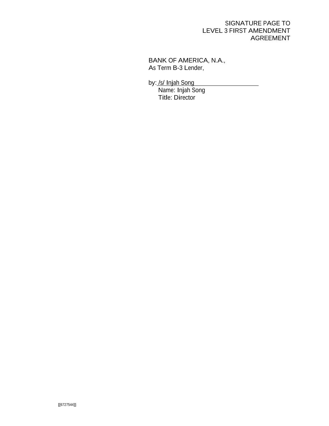 SIGNATURE PAGE TO LEVEL 3 FIRST AMENDMENT AGREEMENT [[6727544]] BANK OF AMERICA, N.A., As Term B-3 Lender, by: /s/ Injah Song Name: Injah Song Title: Director