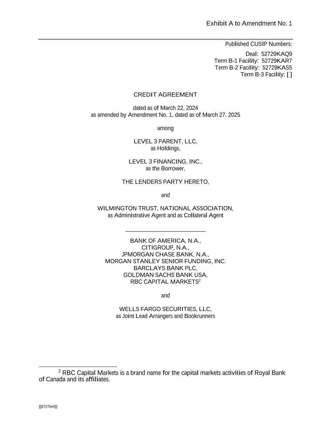 Exhibit A to Amendment No. 1 [[6727544]] Published CUSIP Numbers: Deal: 52729KAQ9 Term B-1 Facility: 52729KAR7 Term B-2 Facility: 52729KAS5 Term B-3 Facility: [ ] CREDIT AGREEMENT dated as of March 22, 2024 as amended by Amendment No. 1, dated as of March 27, 2025 among LEVEL 3 PARENT, LLC, as Holdings, LEVEL 3 FINANCING, INC., as the Borrower, THE LENDERS PARTY HERETO, and WILMINGTON TRUST, NATIONAL ASSOCIATION, as Administrative Agent and as Collateral Agent ___________________________ BANK OF AMERICA, N.A., CITIGROUP, N.A., JPMORGAN CHASE BANK, N.A., MORGAN STANLEY SENIOR FUNDING, INC. BARCLAYS BANK PLC, GOLDMAN SACHS BANK USA, RBC CAPITAL MARKETS2 and WELLS FARGO SECURITIES, LLC, as Joint Lead Arrangers and Bookrunners 2 RBC Capital Markets is a brand name for the capital markets activities of Royal Bank of Canada and its affiliates.