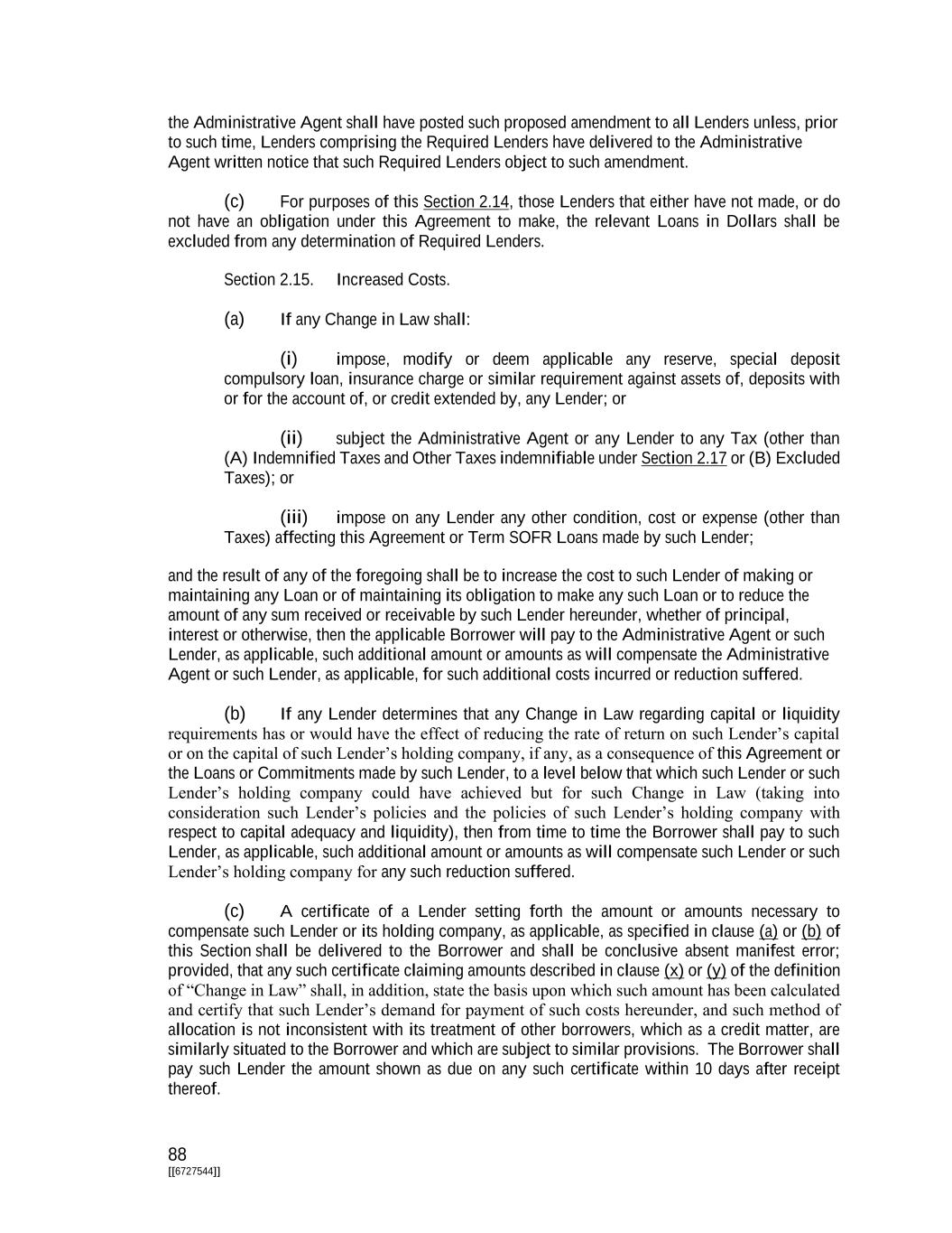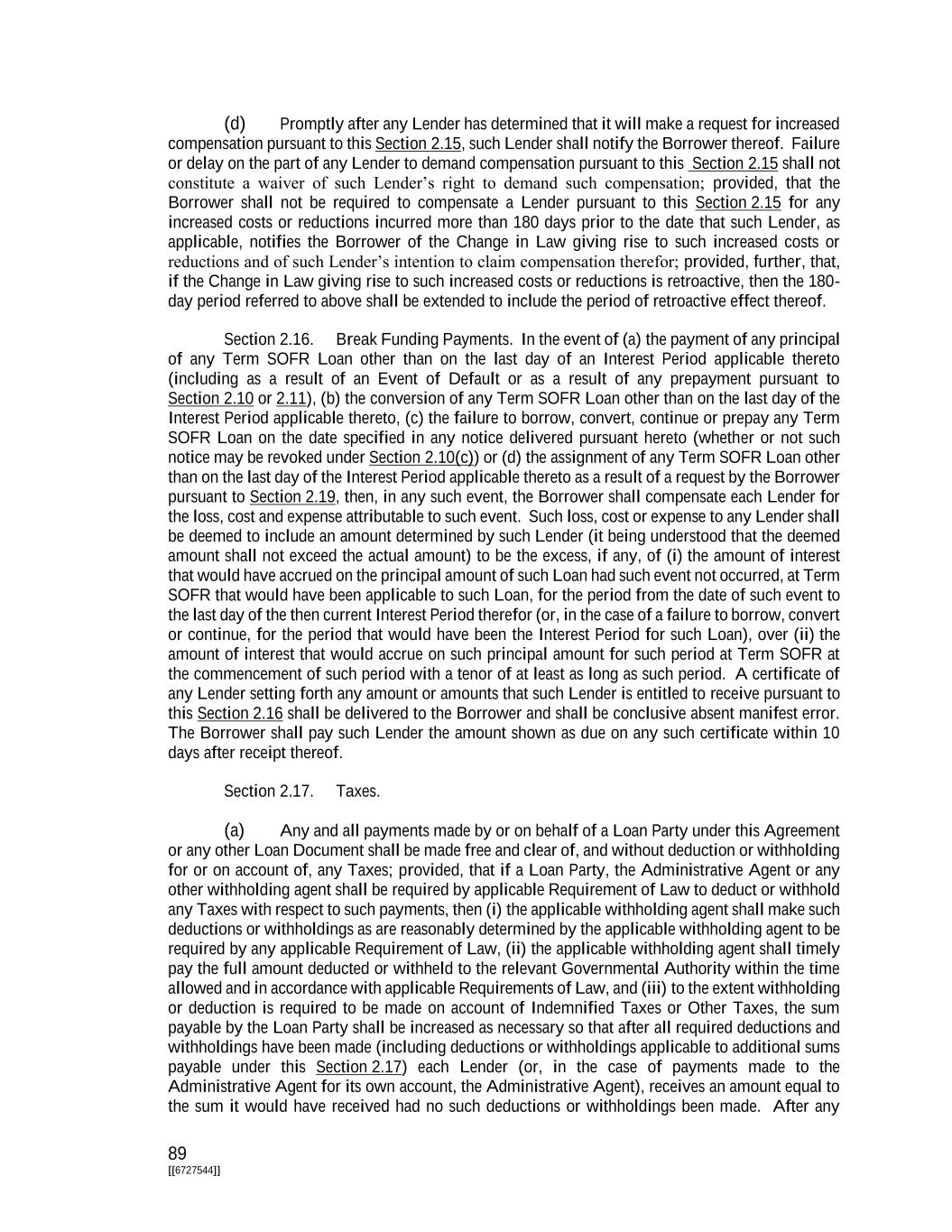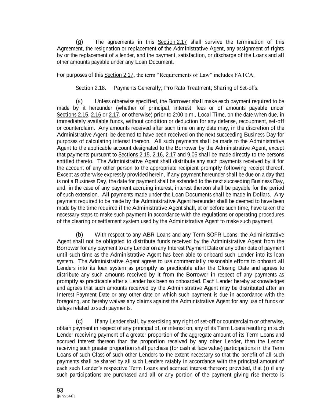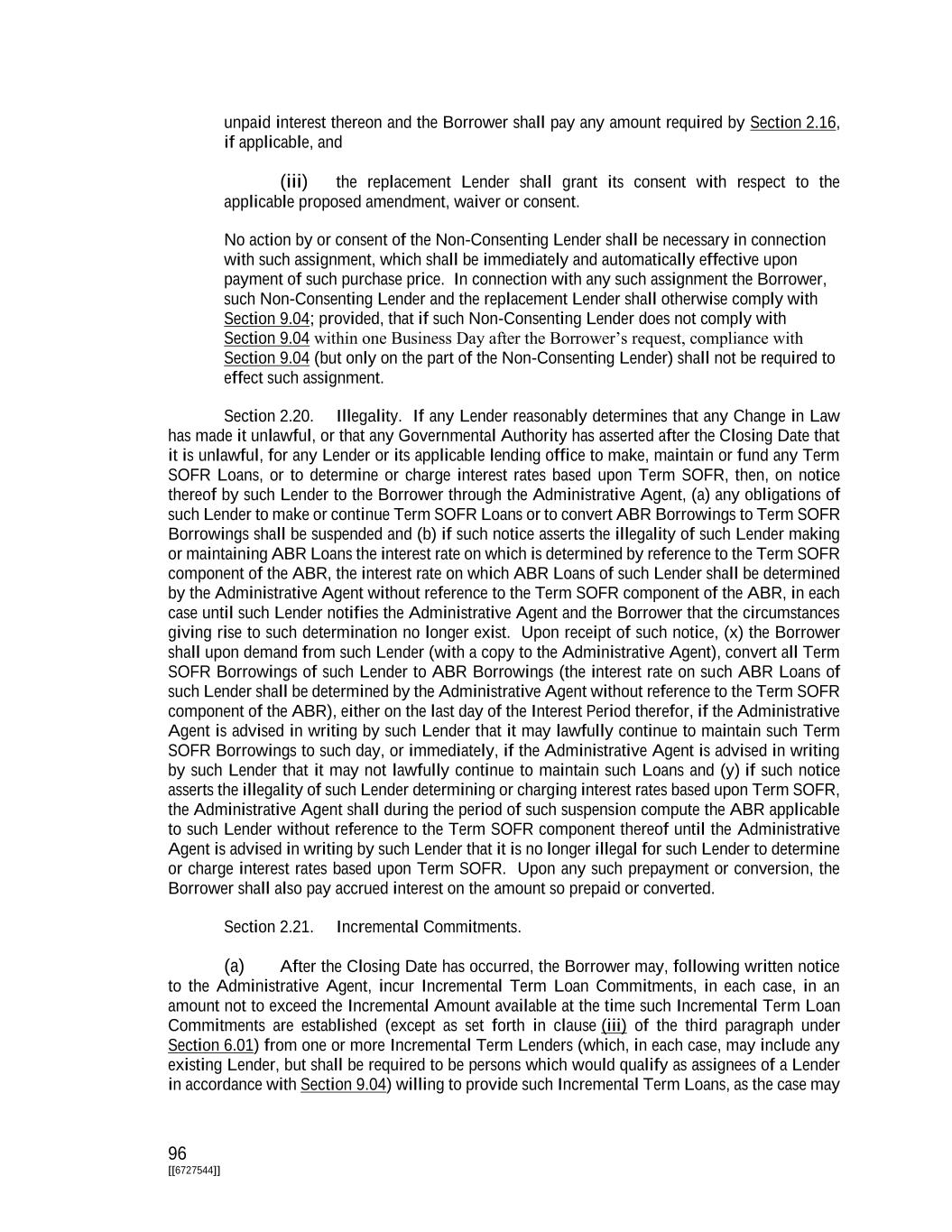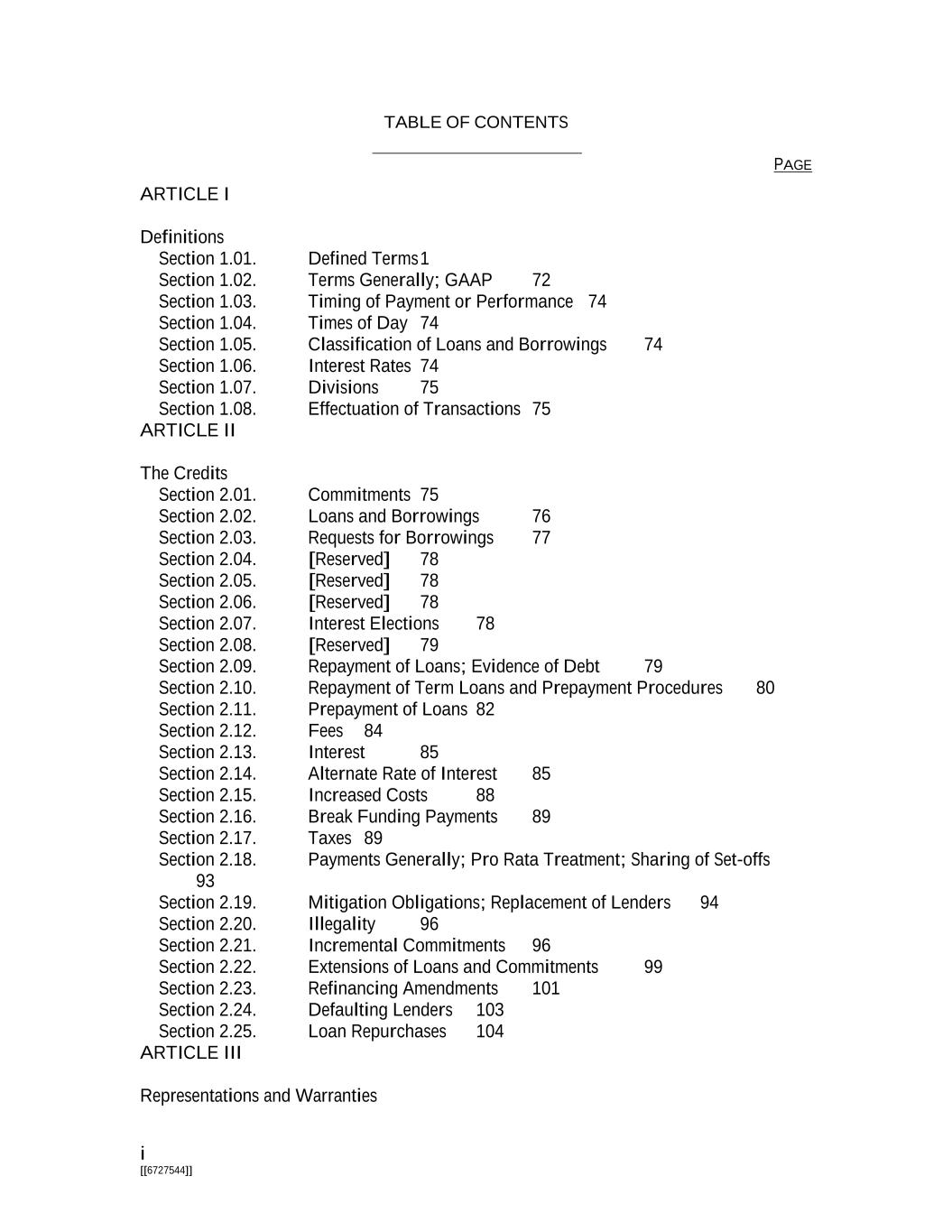 i [[6727544]] TABLE OF CONTENTS PAGE ARTICLE I Definitions Section 1.01. Defined Terms 1 Section 1.02. Terms Generally; GAAP 72 Section 1.03. Timing of Payment or Performance 74 Section 1.04. Times of Day 74 Section 1.05. Classification of Loans and Borrowings 74 Section 1.06. Interest Rates 74 Section 1.07. Divisions 75 Section 1.08. Effectuation of Transactions 75 ARTICLE II The Credits Section 2.01. Commitments 75 Section 2.02. Loans and Borrowings 76 Section 2.03. Requests for Borrowings 77 Section 2.04. [Reserved] 78 Section 2.05. [Reserved] 78 Section 2.06. [Reserved] 78 Section 2.07. Interest Elections 78 Section 2.08. [Reserved] 79 Section 2.09. Repayment of Loans; Evidence of Debt 79 Section 2.10. Repayment of Term Loans and Prepayment Procedures 80 Section 2.11. Prepayment of Loans 82 Section 2.12. Fees 84 Section 2.13. Interest 85 Section 2.14. Alternate Rate of Interest 85 Section 2.15. Increased Costs 88 Section 2.16. Break Funding Payments 89 Section 2.17. Taxes 89 Section 2.18. Payments Generally; Pro Rata Treatment; Sharing of Set-offs 93 Section 2.19. Mitigation Obligations; Replacement of Lenders 94 Section 2.20. Illegality 96 Section 2.21. Incremental Commitments 96 Section 2.22. Extensions of Loans and Commitments 99 Section 2.23. Refinancing Amendments 101 Section 2.24. Defaulting Lenders 103 Section 2.25. Loan Repurchases 104 ARTICLE III Representations and Warranties