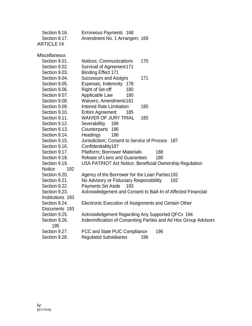 iv [[6727544]] Section 8.16. Erroneous Payments 168 Section 8.17. Amendment No. 1 Arrangers 169 ARTICLE IX Miscellaneous Section 9.01. Notices; Communications 170 Section 9.02. Survival of Agreement 171 Section 9.03. Binding Effect 171 Section 9.04. Successors and Assigns 171 Section 9.05. Expenses; Indemnity 178 Section 9.06. Right of Set-off 180 Section 9.07. Applicable Law 180 Section 9.08. Waivers; Amendments 181 Section 9.09. Interest Rate Limitation 185 Section 9.10. Entire Agreement 185 Section 9.11. WAIVER OF JURY TRIAL 185 Section 9.12. Severability 186 Section 9.13. Counterparts 186 Section 9.14. Headings 186 Section 9.15. Jurisdiction; Consent to Service of Process 187 Section 9.16. Confidentiality187 Section 9.17. Platform; Borrower Materials 188 Section 9.18. Release of Liens and Guarantees 188 Section 9.19. USA PATRIOT Act Notice; Beneficial Ownership Regulation Notice 192 Section 9.20. Agency of the Borrower for the Loan Parties 192 Section 9.21. No Advisory or Fiduciary Responsibility 192 Section 9.22. Payments Set Aside 193 Section 9.23. Acknowledgement and Consent to Bail-In of Affected Financial Institutions 193 Section 9.24. Electronic Execution of Assignments and Certain Other Documents 193 Section 9.25. Acknowledgement Regarding Any Supported QFCs 194 Section 9.26. Indemnification of Consenting Parties and Ad Hoc Group Advisors 195 Section 9.27. FCC and State PUC Compliance 196 Section 9.28. Regulated Subsidiaries 196