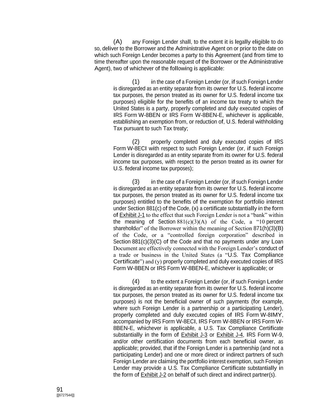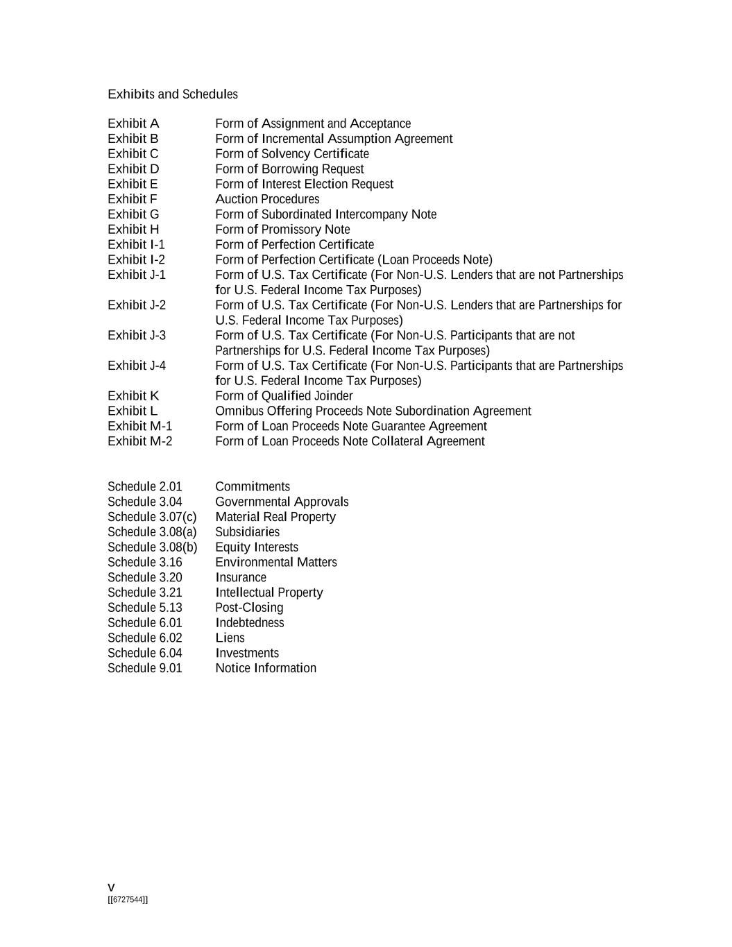 v [[6727544]] Exhibits and Schedules Exhibit A Form of Assignment and Acceptance Exhibit B Form of Incremental Assumption Agreement Exhibit C Form of Solvency Certificate Exhibit D Form of Borrowing Request Exhibit E Form of Interest Election Request Exhibit F Auction Procedures Exhibit G Form of Subordinated Intercompany Note Exhibit H Form of Promissory Note Exhibit I-1 Form of Perfection Certificate Exhibit I-2 Form of Perfection Certificate (Loan Proceeds Note) Exhibit J-1 Form of U.S. Tax Certificate (For Non-U.S. Lenders that are not Partnerships for U.S. Federal Income Tax Purposes) Exhibit J-2 Form of U.S. Tax Certificate (For Non-U.S. Lenders that are Partnerships for U.S. Federal Income Tax Purposes) Exhibit J-3 Form of U.S. Tax Certificate (For Non-U.S. Participants that are not Partnerships for U.S. Federal Income Tax Purposes) Exhibit J-4 Form of U.S. Tax Certificate (For Non-U.S. Participants that are Partnerships for U.S. Federal Income Tax Purposes) Exhibit K Form of Qualified Joinder Exhibit L Omnibus Offering Proceeds Note Subordination Agreement Exhibit M-1 Form of Loan Proceeds Note Guarantee Agreement Exhibit M-2 Form of Loan Proceeds Note Collateral Agreement Schedule 2.01 Commitments Schedule 3.04 Governmental Approvals Schedule 3.07(c) Material Real Property Schedule 3.08(a) Subsidiaries Schedule 3.08(b) Equity Interests Schedule 3.16 Environmental Matters Schedule 3.20 Insurance Schedule 3.21 Intellectual Property Schedule 5.13 Post-Closing Schedule 6.01 Indebtedness Schedule 6.02 Liens Schedule 6.04 Investments Schedule 9.01 Notice Information
