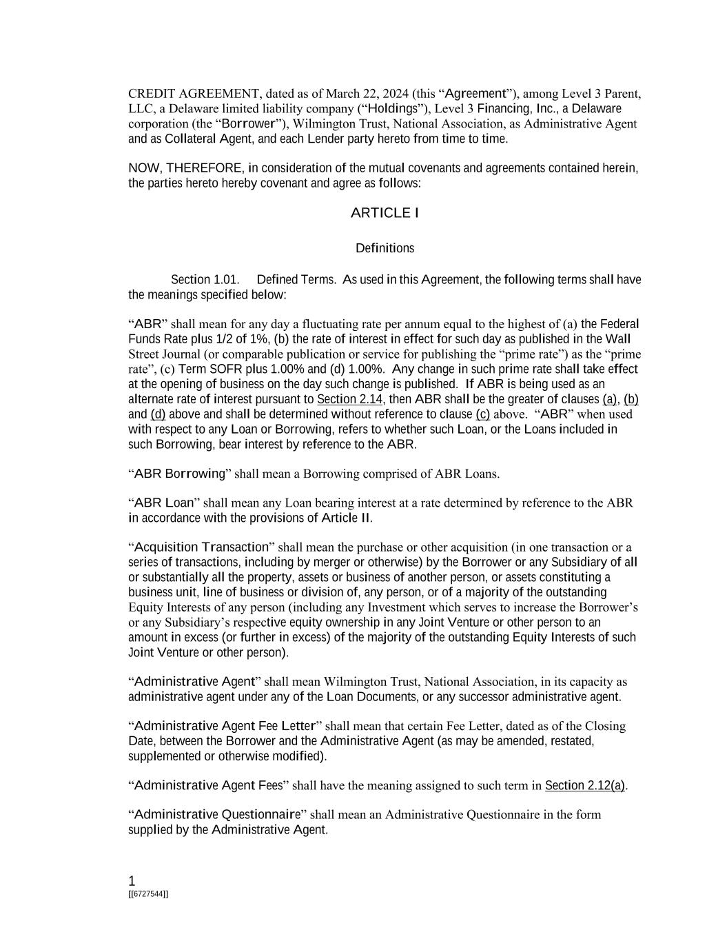 1 [[6727544]] CREDIT AGREEMENT, dated as of March 22, 2024 (this “Agreement”), among Level 3 Parent, LLC, a Delaware limited liability company (“Holdings”), Level 3 Financing, Inc., a Delaware corporation (the “Borrower”), Wilmington Trust, National Association, as Administrative Agent and as Collateral Agent, and each Lender party hereto from time to time. NOW, THEREFORE, in consideration of the mutual covenants and agreements contained herein, the parties hereto hereby covenant and agree as follows: ARTICLE I Definitions Section 1.01. Defined Terms. As used in this Agreement, the following terms shall have the meanings specified below: “ABR” shall mean for any day a fluctuating rate per annum equal to the highest of (a) the Federal Funds Rate plus 1/2 of 1%, (b) the rate of interest in effect for such day as published in the Wall Street Journal (or comparable publication or service for publishing the “prime rate”) as the “prime rate”, (c) Term SOFR plus 1.00% and (d) 1.00%. Any change in such prime rate shall take effect at the opening of business on the day such change is published. If ABR is being used as an alternate rate of interest pursuant to Section 2.14, then ABR shall be the greater of clauses (a), (b) and (d) above and shall be determined without reference to clause (c) above. “ABR” when used with respect to any Loan or Borrowing, refers to whether such Loan, or the Loans included in such Borrowing, bear interest by reference to the ABR. “ABR Borrowing” shall mean a Borrowing comprised of ABR Loans. “ABR Loan” shall mean any Loan bearing interest at a rate determined by reference to the ABR in accordance with the provisions of Article II. “Acquisition Transaction” shall mean the purchase or other acquisition (in one transaction or a series of transactions, including by merger or otherwise) by the Borrower or any Subsidiary of all or substantially all the property, assets or business of another person, or assets constituting a business unit, line of business or division of, any person, or of a majority of the outstanding Equity Interests of any person (including any Investment which serves to increase the Borrower’s or any Subsidiary’s respective equity ownership in any Joint Venture or other person to an amount in excess (or further in excess) of the majority of the outstanding Equity Interests of such Joint Venture or other person). “Administrative Agent” shall mean Wilmington Trust, National Association, in its capacity as administrative agent under any of the Loan Documents, or any successor administrative agent. “Administrative Agent Fee Letter” shall mean that certain Fee Letter, dated as of the Closing Date, between the Borrower and the Administrative Agent (as may be amended, restated, supplemented or otherwise modified). “Administrative Agent Fees” shall have the meaning assigned to such term in Section 2.12(a). “Administrative Questionnaire” shall mean an Administrative Questionnaire in the form supplied by the Administrative Agent.