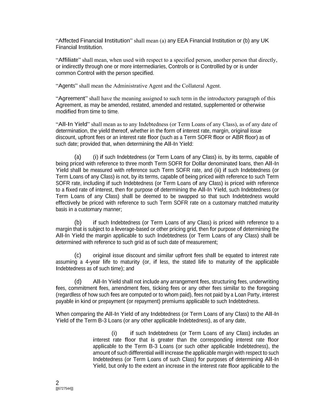 2 [[6727544]] “Affected Financial Institution” shall mean (a) any EEA Financial Institution or (b) any UK Financial Institution. “Affiliate” shall mean, when used with respect to a specified person, another person that directly, or indirectly through one or more intermediaries, Controls or is Controlled by or is under common Control with the person specified. “Agents” shall mean the Administrative Agent and the Collateral Agent. “Agreement” shall have the meaning assigned to such term in the introductory paragraph of this Agreement, as may be amended, restated, amended and restated, supplemented or otherwise modified from time to time. “All-In Yield” shall mean as to any Indebtedness (or Term Loans of any Class), as of any date of determination, the yield thereof, whether in the form of interest rate, margin, original issue discount, upfront fees or an interest rate floor (such as a Term SOFR floor or ABR floor) as of such date; provided that, when determining the All-In Yield: (a) (i) if such Indebtedness (or Term Loans of any Class) is, by its terms, capable of being priced with reference to three month Term SOFR for Dollar denominated loans, then All-In Yield shall be measured with reference such Term SOFR rate, and (ii) if such Indebtedness (or Term Loans of any Class) is not, by its terms, capable of being priced with reference to such Term SOFR rate, including if such Indebtedness (or Term Loans of any Class) is priced with reference to a fixed rate of interest, then for purpose of determining the All-In Yield, such Indebtedness (or Term Loans of any Class) shall be deemed to be swapped so that such Indebtedness would effectively be priced with reference to such Term SOFR rate on a customary matched maturity basis in a customary manner; (b) if such Indebtedness (or Term Loans of any Class) is priced with reference to a margin that is subject to a leverage-based or other pricing grid, then for purpose of determining the All-In Yield the margin applicable to such Indebtedness (or Term Loans of any Class) shall be determined with reference to such grid as of such date of measurement; (c) original issue discount and similar upfront fees shall be equated to interest rate assuming a 4-year life to maturity (or, if less, the stated life to maturity of the applicable Indebtedness as of such time); and (d) All-In Yield shall not include any arrangement fees, structuring fees, underwriting fees, commitment fees, amendment fees, ticking fees or any other fees similar to the foregoing (regardless of how such fees are computed or to whom paid), fees not paid by a Loan Party, interest payable in kind or prepayment (or repayment) premiums applicable to such Indebtedness. When comparing the All-In Yield of any Indebtedness (or Term Loans of any Class) to the All-In Yield of the Term B-3 Loans (or any other applicable Indebtedness), as of any date, (i) if such Indebtedness (or Term Loans of any Class) includes an interest rate floor that is greater than the corresponding interest rate floor applicable to the Term B-3 Loans (or such other applicable Indebtedness), the amount of such differential will increase the applicable margin with respect to such Indebtedness (or Term Loans of such Class) for purposes of determining All-In Yield, but only to the extent an increase in the interest rate floor applicable to the