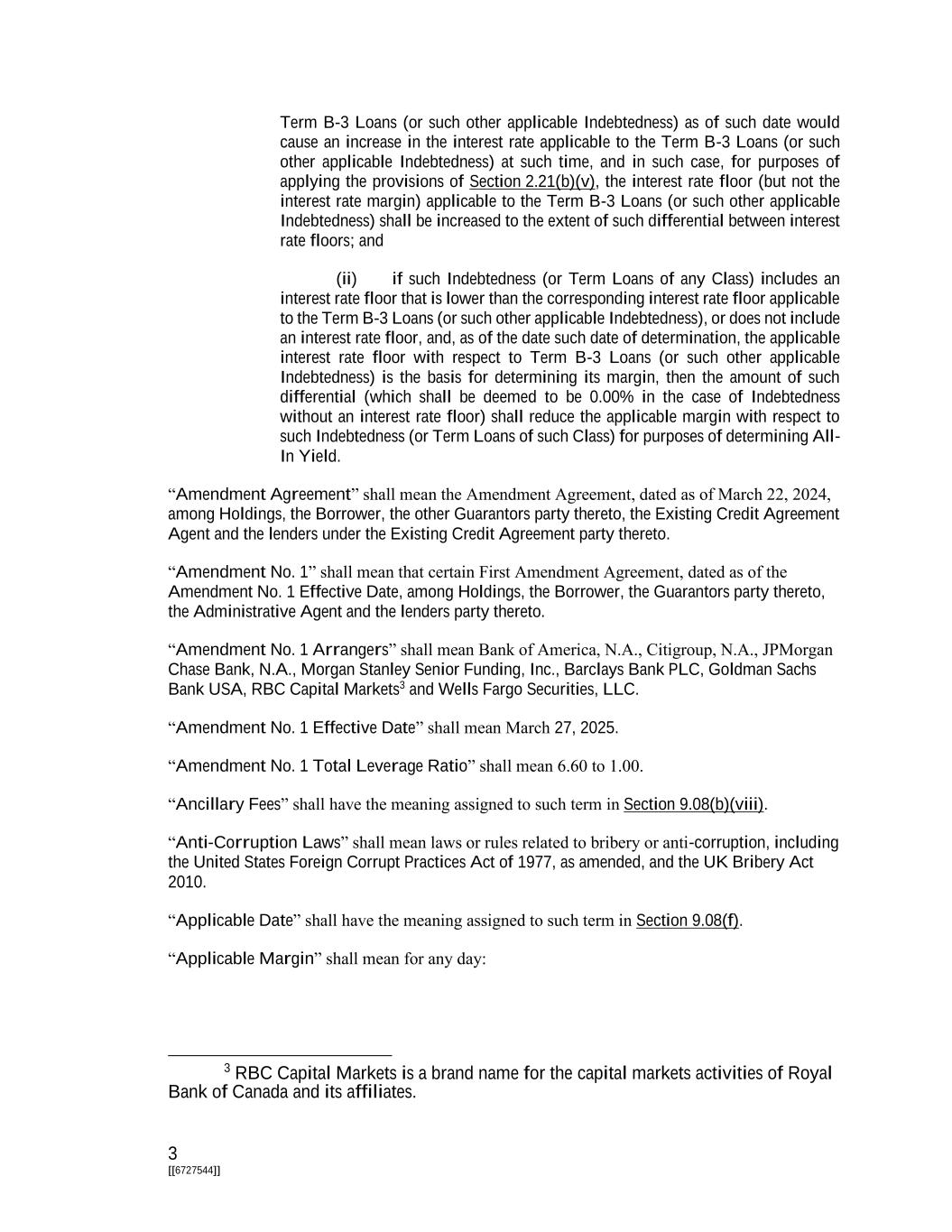 3 [[6727544]] Term B-3 Loans (or such other applicable Indebtedness) as of such date would cause an increase in the interest rate applicable to the Term B-3 Loans (or such other applicable Indebtedness) at such time, and in such case, for purposes of applying the provisions of Section 2.21(b)(v), the interest rate floor (but not the interest rate margin) applicable to the Term B-3 Loans (or such other applicable Indebtedness) shall be increased to the extent of such differential between interest rate floors; and (ii) if such Indebtedness (or Term Loans of any Class) includes an interest rate floor that is lower than the corresponding interest rate floor applicable to the Term B-3 Loans (or such other applicable Indebtedness), or does not include an interest rate floor, and, as of the date such date of determination, the applicable interest rate floor with respect to Term B-3 Loans (or such other applicable Indebtedness) is the basis for determining its margin, then the amount of such differential (which shall be deemed to be 0.00% in the case of Indebtedness without an interest rate floor) shall reduce the applicable margin with respect to such Indebtedness (or Term Loans of such Class) for purposes of determining All- In Yield. “Amendment Agreement” shall mean the Amendment Agreement, dated as of March 22, 2024, among Holdings, the Borrower, the other Guarantors party thereto, the Existing Credit Agreement Agent and the lenders under the Existing Credit Agreement party thereto. “Amendment No. 1” shall mean that certain First Amendment Agreement, dated as of the Amendment No. 1 Effective Date, among Holdings, the Borrower, the Guarantors party thereto, the Administrative Agent and the lenders party thereto. “Amendment No. 1 Arrangers” shall mean Bank of America, N.A., Citigroup, N.A., JPMorgan Chase Bank, N.A., Morgan Stanley Senior Funding, Inc., Barclays Bank PLC, Goldman Sachs Bank USA, RBC Capital Markets3 and Wells Fargo Securities, LLC. “Amendment No. 1 Effective Date” shall mean March 27, 2025. “Amendment No. 1 Total Leverage Ratio” shall mean 6.60 to 1.00. “Ancillary Fees” shall have the meaning assigned to such term in Section 9.08(b)(viii). “Anti-Corruption Laws” shall mean laws or rules related to bribery or anti-corruption, including the United States Foreign Corrupt Practices Act of 1977, as amended, and the UK Bribery Act 2010. “Applicable Date” shall have the meaning assigned to such term in Section 9.08(f). “Applicable Margin” shall mean for any day: 3 RBC Capital Markets is a brand name for the capital markets activities of Royal Bank of Canada and its affiliates.