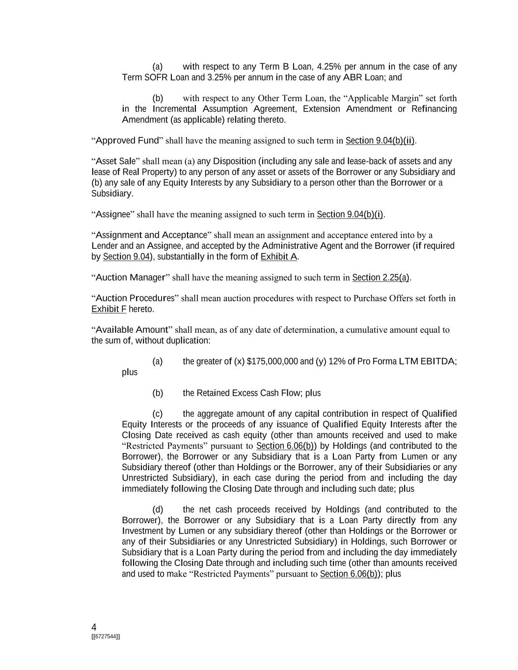 4 [[6727544]] (a) with respect to any Term B Loan, 4.25% per annum in the case of any Term SOFR Loan and 3.25% per annum in the case of any ABR Loan; and (b) with respect to any Other Term Loan, the “Applicable Margin” set forth in the Incremental Assumption Agreement, Extension Amendment or Refinancing Amendment (as applicable) relating thereto. “Approved Fund” shall have the meaning assigned to such term in Section 9.04(b)(ii). “Asset Sale” shall mean (a) any Disposition (including any sale and lease-back of assets and any lease of Real Property) to any person of any asset or assets of the Borrower or any Subsidiary and (b) any sale of any Equity Interests by any Subsidiary to a person other than the Borrower or a Subsidiary. “Assignee” shall have the meaning assigned to such term in Section 9.04(b)(i). “Assignment and Acceptance” shall mean an assignment and acceptance entered into by a Lender and an Assignee, and accepted by the Administrative Agent and the Borrower (if required by Section 9.04), substantially in the form of Exhibit A. “Auction Manager” shall have the meaning assigned to such term in Section 2.25(a). “Auction Procedures” shall mean auction procedures with respect to Purchase Offers set forth in Exhibit F hereto. “Available Amount” shall mean, as of any date of determination, a cumulative amount equal to the sum of, without duplication: (a) the greater of (x) $175,000,000 and (y) 12% of Pro Forma LTM EBITDA; plus (b) the Retained Excess Cash Flow; plus (c) the aggregate amount of any capital contribution in respect of Qualified Equity Interests or the proceeds of any issuance of Qualified Equity Interests after the Closing Date received as cash equity (other than amounts received and used to make “Restricted Payments” pursuant to Section 6.06(b)) by Holdings (and contributed to the Borrower), the Borrower or any Subsidiary that is a Loan Party from Lumen or any Subsidiary thereof (other than Holdings or the Borrower, any of their Subsidiaries or any Unrestricted Subsidiary), in each case during the period from and including the day immediately following the Closing Date through and including such date; plus (d) the net cash proceeds received by Holdings (and contributed to the Borrower), the Borrower or any Subsidiary that is a Loan Party directly from any Investment by Lumen or any subsidiary thereof (other than Holdings or the Borrower or any of their Subsidiaries or any Unrestricted Subsidiary) in Holdings, such Borrower or Subsidiary that is a Loan Party during the period from and including the day immediately following the Closing Date through and including such time (other than amounts received and used to make “Restricted Payments” pursuant to Section 6.06(b)); plus