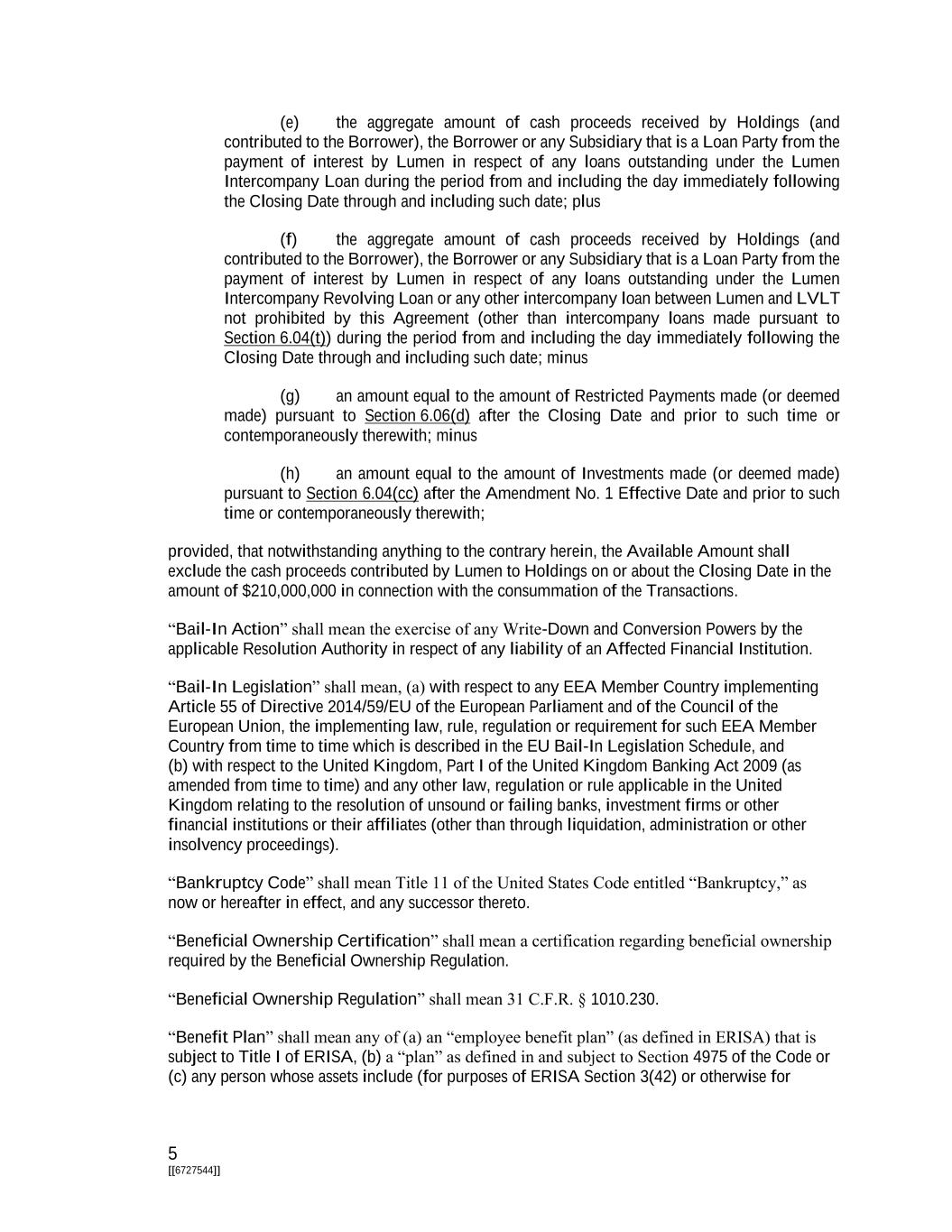 5 [[6727544]] (e) the aggregate amount of cash proceeds received by Holdings (and contributed to the Borrower), the Borrower or any Subsidiary that is a Loan Party from the payment of interest by Lumen in respect of any loans outstanding under the Lumen Intercompany Loan during the period from and including the day immediately following the Closing Date through and including such date; plus (f) the aggregate amount of cash proceeds received by Holdings (and contributed to the Borrower), the Borrower or any Subsidiary that is a Loan Party from the payment of interest by Lumen in respect of any loans outstanding under the Lumen Intercompany Revolving Loan or any other intercompany loan between Lumen and LVLT not prohibited by this Agreement (other than intercompany loans made pursuant to Section 6.04(t)) during the period from and including the day immediately following the Closing Date through and including such date; minus (g) an amount equal to the amount of Restricted Payments made (or deemed made) pursuant to Section 6.06(d) after the Closing Date and prior to such time or contemporaneously therewith; minus (h) an amount equal to the amount of Investments made (or deemed made) pursuant to Section 6.04(cc) after the Amendment No. 1 Effective Date and prior to such time or contemporaneously therewith; provided, that notwithstanding anything to the contrary herein, the Available Amount shall exclude the cash proceeds contributed by Lumen to Holdings on or about the Closing Date in the amount of $210,000,000 in connection with the consummation of the Transactions. “Bail-In Action” shall mean the exercise of any Write-Down and Conversion Powers by the applicable Resolution Authority in respect of any liability of an Affected Financial Institution. “Bail-In Legislation” shall mean, (a) with respect to any EEA Member Country implementing Article 55 of Directive 2014/59/EU of the European Parliament and of the Council of the European Union, the implementing law, rule, regulation or requirement for such EEA Member Country from time to time which is described in the EU Bail-In Legislation Schedule, and (b) with respect to the United Kingdom, Part I of the United Kingdom Banking Act 2009 (as amended from time to time) and any other law, regulation or rule applicable in the United Kingdom relating to the resolution of unsound or failing banks, investment firms or other financial institutions or their affiliates (other than through liquidation, administration or other insolvency proceedings). “Bankruptcy Code” shall mean Title 11 of the United States Code entitled “Bankruptcy,” as now or hereafter in effect, and any successor thereto. “Beneficial Ownership Certification” shall mean a certification regarding beneficial ownership required by the Beneficial Ownership Regulation. “Beneficial Ownership Regulation” shall mean 31 C.F.R. § 1010.230. “Benefit Plan” shall mean any of (a) an “employee benefit plan” (as defined in ERISA) that is subject to Title I of ERISA, (b) a “plan” as defined in and subject to Section 4975 of the Code or (c) any person whose assets include (for purposes of ERISA Section 3(42) or otherwise for