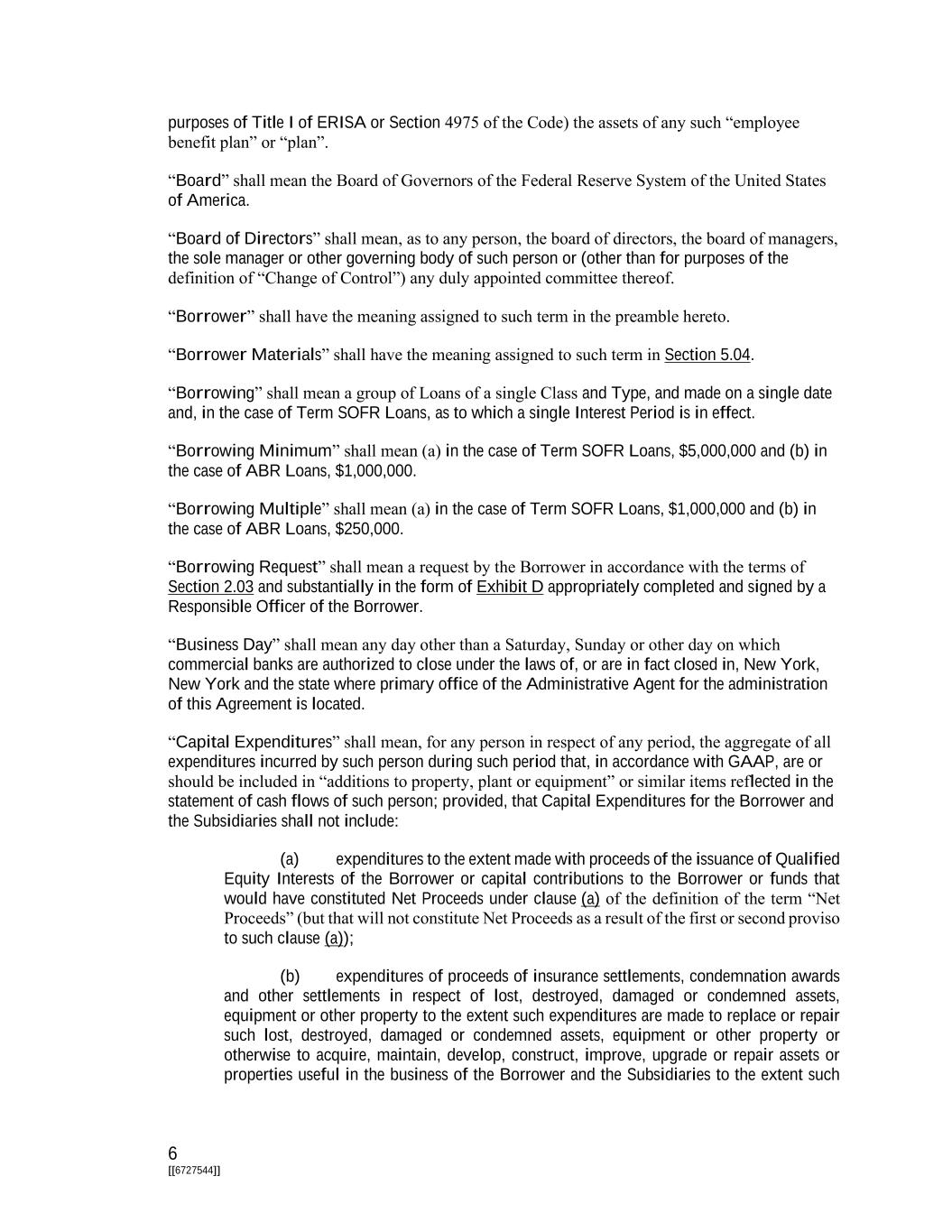 6 [[6727544]] purposes of Title I of ERISA or Section 4975 of the Code) the assets of any such “employee benefit plan” or “plan”. “Board” shall mean the Board of Governors of the Federal Reserve System of the United States of America. “Board of Directors” shall mean, as to any person, the board of directors, the board of managers, the sole manager or other governing body of such person or (other than for purposes of the definition of “Change of Control”) any duly appointed committee thereof. “Borrower” shall have the meaning assigned to such term in the preamble hereto. “Borrower Materials” shall have the meaning assigned to such term in Section 5.04. “Borrowing” shall mean a group of Loans of a single Class and Type, and made on a single date and, in the case of Term SOFR Loans, as to which a single Interest Period is in effect. “Borrowing Minimum” shall mean (a) in the case of Term SOFR Loans, $5,000,000 and (b) in the case of ABR Loans, $1,000,000. “Borrowing Multiple” shall mean (a) in the case of Term SOFR Loans, $1,000,000 and (b) in the case of ABR Loans, $250,000. “Borrowing Request” shall mean a request by the Borrower in accordance with the terms of Section 2.03 and substantially in the form of Exhibit D appropriately completed and signed by a Responsible Officer of the Borrower. “Business Day” shall mean any day other than a Saturday, Sunday or other day on which commercial banks are authorized to close under the laws of, or are in fact closed in, New York, New York and the state where primary office of the Administrative Agent for the administration of this Agreement is located. “Capital Expenditures” shall mean, for any person in respect of any period, the aggregate of all expenditures incurred by such person during such period that, in accordance with GAAP, are or should be included in “additions to property, plant or equipment” or similar items reflected in the statement of cash flows of such person; provided, that Capital Expenditures for the Borrower and the Subsidiaries shall not include: (a) expenditures to the extent made with proceeds of the issuance of Qualified Equity Interests of the Borrower or capital contributions to the Borrower or funds that would have constituted Net Proceeds under clause (a) of the definition of the term “Net Proceeds” (but that will not constitute Net Proceeds as a result of the first or second proviso to such clause (a)); (b) expenditures of proceeds of insurance settlements, condemnation awards and other settlements in respect of lost, destroyed, damaged or condemned assets, equipment or other property to the extent such expenditures are made to replace or repair such lost, destroyed, damaged or condemned assets, equipment or other property or otherwise to acquire, maintain, develop, construct, improve, upgrade or repair assets or properties useful in the business of the Borrower and the Subsidiaries to the extent such