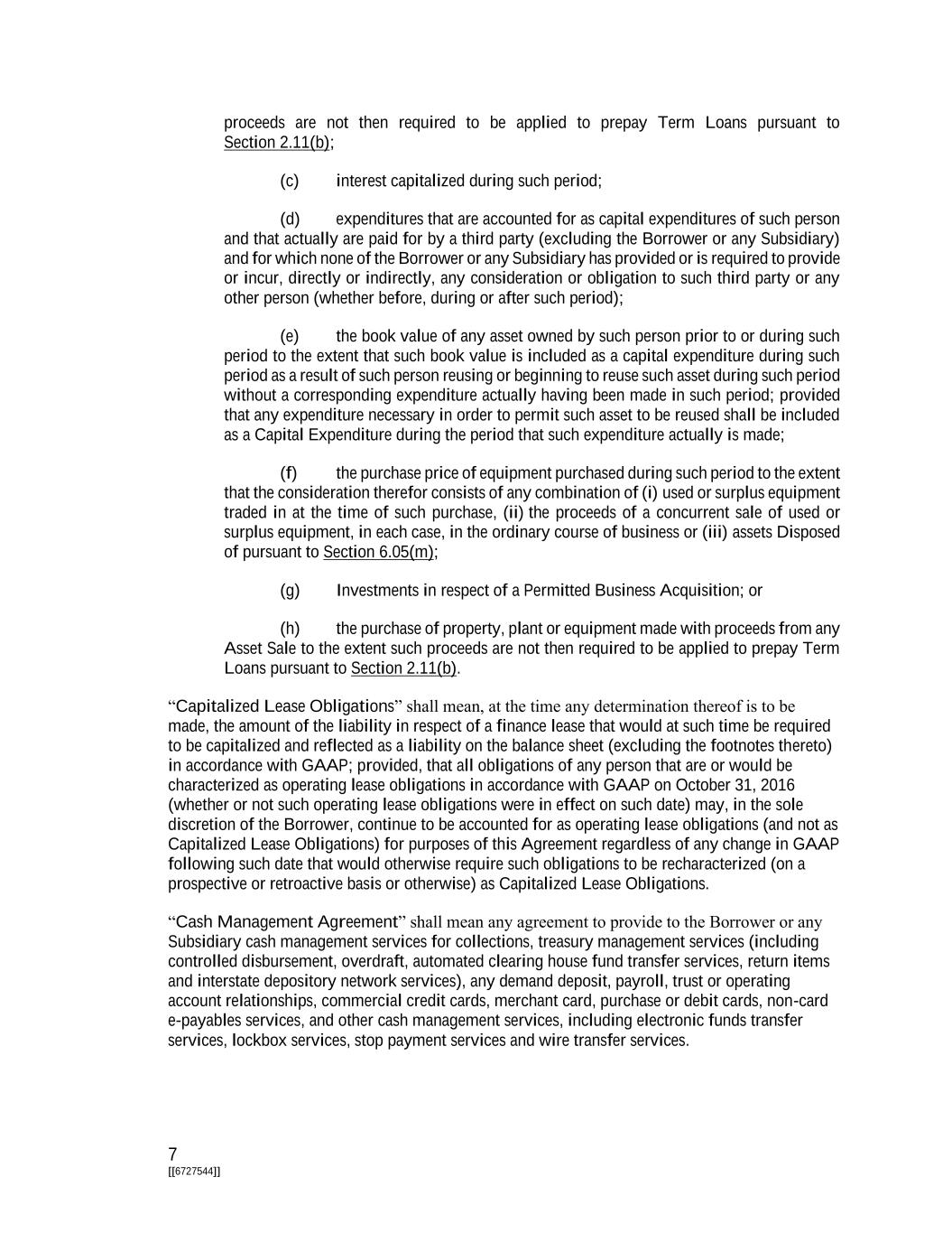 7 [[6727544]] proceeds are not then required to be applied to prepay Term Loans pursuant to Section 2.11(b); (c) interest capitalized during such period; (d) expenditures that are accounted for as capital expenditures of such person and that actually are paid for by a third party (excluding the Borrower or any Subsidiary) and for which none of the Borrower or any Subsidiary has provided or is required to provide or incur, directly or indirectly, any consideration or obligation to such third party or any other person (whether before, during or after such period); (e) the book value of any asset owned by such person prior to or during such period to the extent that such book value is included as a capital expenditure during such period as a result of such person reusing or beginning to reuse such asset during such period without a corresponding expenditure actually having been made in such period; provided that any expenditure necessary in order to permit such asset to be reused shall be included as a Capital Expenditure during the period that such expenditure actually is made; (f) the purchase price of equipment purchased during such period to the extent that the consideration therefor consists of any combination of (i) used or surplus equipment traded in at the time of such purchase, (ii) the proceeds of a concurrent sale of used or surplus equipment, in each case, in the ordinary course of business or (iii) assets Disposed of pursuant to Section 6.05(m); (g) Investments in respect of a Permitted Business Acquisition; or (h) the purchase of property, plant or equipment made with proceeds from any Asset Sale to the extent such proceeds are not then required to be applied to prepay Term Loans pursuant to Section 2.11(b). “Capitalized Lease Obligations” shall mean, at the time any determination thereof is to be made, the amount of the liability in respect of a finance lease that would at such time be required to be capitalized and reflected as a liability on the balance sheet (excluding the footnotes thereto) in accordance with GAAP; provided, that all obligations of any person that are or would be characterized as operating lease obligations in accordance with GAAP on October 31, 2016 (whether or not such operating lease obligations were in effect on such date) may, in the sole discretion of the Borrower, continue to be accounted for as operating lease obligations (and not as Capitalized Lease Obligations) for purposes of this Agreement regardless of any change in GAAP following such date that would otherwise require such obligations to be recharacterized (on a prospective or retroactive basis or otherwise) as Capitalized Lease Obligations. “Cash Management Agreement” shall mean any agreement to provide to the Borrower or any Subsidiary cash management services for collections, treasury management services (including controlled disbursement, overdraft, automated clearing house fund transfer services, return items and interstate depository network services), any demand deposit, payroll, trust or operating account relationships, commercial credit cards, merchant card, purchase or debit cards, non-card e-payables services, and other cash management services, including electronic funds transfer services, lockbox services, stop payment services and wire transfer services.