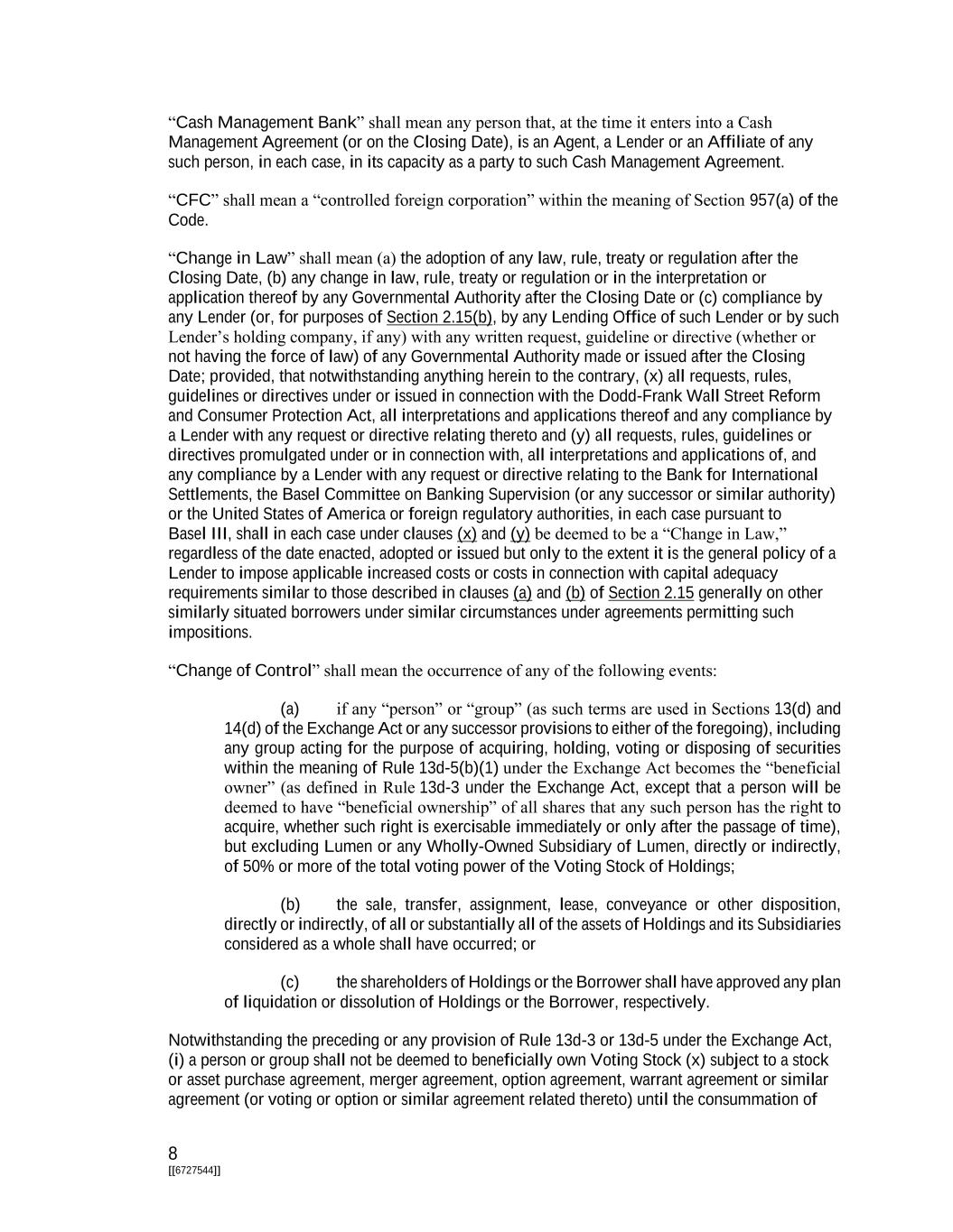 8 [[6727544]] “Cash Management Bank” shall mean any person that, at the time it enters into a Cash Management Agreement (or on the Closing Date), is an Agent, a Lender or an Affiliate of any such person, in each case, in its capacity as a party to such Cash Management Agreement. “CFC” shall mean a “controlled foreign corporation” within the meaning of Section 957(a) of the Code. “Change in Law” shall mean (a) the adoption of any law, rule, treaty or regulation after the Closing Date, (b) any change in law, rule, treaty or regulation or in the interpretation or application thereof by any Governmental Authority after the Closing Date or (c) compliance by any Lender (or, for purposes of Section 2.15(b), by any Lending Office of such Lender or by such Lender’s holding company, if any) with any written request, guideline or directive (whether or not having the force of law) of any Governmental Authority made or issued after the Closing Date; provided, that notwithstanding anything herein to the contrary, (x) all requests, rules, guidelines or directives under or issued in connection with the Dodd-Frank Wall Street Reform and Consumer Protection Act, all interpretations and applications thereof and any compliance by a Lender with any request or directive relating thereto and (y) all requests, rules, guidelines or directives promulgated under or in connection with, all interpretations and applications of, and any compliance by a Lender with any request or directive relating to the Bank for International Settlements, the Basel Committee on Banking Supervision (or any successor or similar authority) or the United States of America or foreign regulatory authorities, in each case pursuant to Basel III, shall in each case under clauses (x) and (y) be deemed to be a “Change in Law,” regardless of the date enacted, adopted or issued but only to the extent it is the general policy of a Lender to impose applicable increased costs or costs in connection with capital adequacy requirements similar to those described in clauses (a) and (b) of Section 2.15 generally on other similarly situated borrowers under similar circumstances under agreements permitting such impositions. “Change of Control” shall mean the occurrence of any of the following events: (a) if any “person” or “group” (as such terms are used in Sections 13(d) and 14(d) of the Exchange Act or any successor provisions to either of the foregoing), including any group acting for the purpose of acquiring, holding, voting or disposing of securities within the meaning of Rule 13d-5(b)(1) under the Exchange Act becomes the “beneficial owner” (as defined in Rule 13d-3 under the Exchange Act, except that a person will be deemed to have “beneficial ownership” of all shares that any such person has the right to acquire, whether such right is exercisable immediately or only after the passage of time), but excluding Lumen or any Wholly-Owned Subsidiary of Lumen, directly or indirectly, of 50% or more of the total voting power of the Voting Stock of Holdings; (b) the sale, transfer, assignment, lease, conveyance or other disposition, directly or indirectly, of all or substantially all of the assets of Holdings and its Subsidiaries considered as a whole shall have occurred; or (c) the shareholders of Holdings or the Borrower shall have approved any plan of liquidation or dissolution of Holdings or the Borrower, respectively. Notwithstanding the preceding or any provision of Rule 13d-3 or 13d-5 under the Exchange Act, (i) a person or group shall not be deemed to beneficially own Voting Stock (x) subject to a stock or asset purchase agreement, merger agreement, option agreement, warrant agreement or similar agreement (or voting or option or similar agreement related thereto) until the consummation of