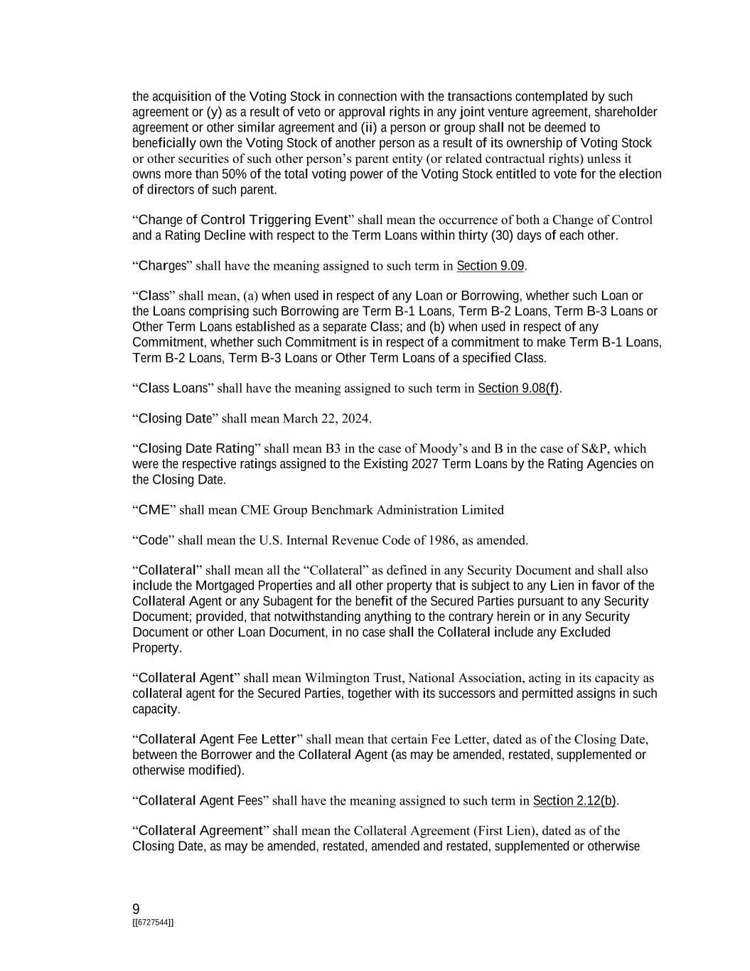 9 [[6727544]] the acquisition of the Voting Stock in connection with the transactions contemplated by such agreement or (y) as a result of veto or approval rights in any joint venture agreement, shareholder agreement or other similar agreement and (ii) a person or group shall not be deemed to beneficially own the Voting Stock of another person as a result of its ownership of Voting Stock or other securities of such other person’s parent entity (or related contractual rights) unless it owns more than 50% of the total voting power of the Voting Stock entitled to vote for the election of directors of such parent. “Change of Control Triggering Event” shall mean the occurrence of both a Change of Control and a Rating Decline with respect to the Term Loans within thirty (30) days of each other. “Charges” shall have the meaning assigned to such term in Section 9.09. “Class” shall mean, (a) when used in respect of any Loan or Borrowing, whether such Loan or the Loans comprising such Borrowing are Term B-1 Loans, Term B-2 Loans, Term B-3 Loans or Other Term Loans established as a separate Class; and (b) when used in respect of any Commitment, whether such Commitment is in respect of a commitment to make Term B-1 Loans, Term B-2 Loans, Term B-3 Loans or Other Term Loans of a specified Class. “Class Loans” shall have the meaning assigned to such term in Section 9.08(f). “Closing Date” shall mean March 22, 2024. “Closing Date Rating” shall mean B3 in the case of Moody’s and B in the case of S&P, which were the respective ratings assigned to the Existing 2027 Term Loans by the Rating Agencies on the Closing Date. “CME” shall mean CME Group Benchmark Administration Limited “Code” shall mean the U.S. Internal Revenue Code of 1986, as amended. “Collateral” shall mean all the “Collateral” as defined in any Security Document and shall also include the Mortgaged Properties and all other property that is subject to any Lien in favor of the Collateral Agent or any Subagent for the benefit of the Secured Parties pursuant to any Security Document; provided, that notwithstanding anything to the contrary herein or in any Security Document or other Loan Document, in no case shall the Collateral include any Excluded Property. “Collateral Agent” shall mean Wilmington Trust, National Association, acting in its capacity as collateral agent for the Secured Parties, together with its successors and permitted assigns in such capacity. “Collateral Agent Fee Letter” shall mean that certain Fee Letter, dated as of the Closing Date, between the Borrower and the Collateral Agent (as may be amended, restated, supplemented or otherwise modified). “Collateral Agent Fees” shall have the meaning assigned to such term in Section 2.12(b). “Collateral Agreement” shall mean the Collateral Agreement (First Lien), dated as of the Closing Date, as may be amended, restated, amended and restated, supplemented or otherwise