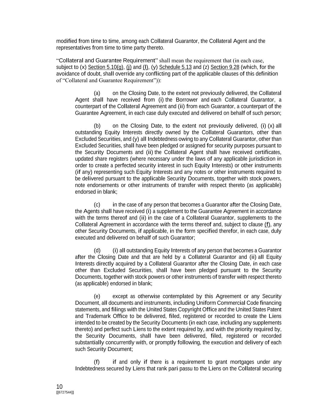 10 [[6727544]] modified from time to time, among each Collateral Guarantor, the Collateral Agent and the representatives from time to time party thereto. “Collateral and Guarantee Requirement” shall mean the requirement that (in each case, subject to (x) Section 5.10(g), (j) and (l), (y) Schedule 5.13 and (z) Section 9.28 (which, for the avoidance of doubt, shall override any conflicting part of the applicable clauses of this definition of “Collateral and Guarantee Requirement”)): (a) on the Closing Date, to the extent not previously delivered, the Collateral Agent shall have received from (i) the Borrower and each Collateral Guarantor, a counterpart of the Collateral Agreement and (ii) from each Guarantor, a counterpart of the Guarantee Agreement, in each case duly executed and delivered on behalf of such person; (b) on the Closing Date, to the extent not previously delivered, (i) (x) all outstanding Equity Interests directly owned by the Collateral Guarantors, other than Excluded Securities, and (y) all Indebtedness owing to any Collateral Guarantor, other than Excluded Securities, shall have been pledged or assigned for security purposes pursuant to the Security Documents and (ii) the Collateral Agent shall have received certificates, updated share registers (where necessary under the laws of any applicable jurisdiction in order to create a perfected security interest in such Equity Interests) or other instruments (if any) representing such Equity Interests and any notes or other instruments required to be delivered pursuant to the applicable Security Documents, together with stock powers, note endorsements or other instruments of transfer with respect thereto (as applicable) endorsed in blank; (c) in the case of any person that becomes a Guarantor after the Closing Date, the Agents shall have received (i) a supplement to the Guarantee Agreement in accordance with the terms thereof and (ii) in the case of a Collateral Guarantor, supplements to the Collateral Agreement in accordance with the terms thereof and, subject to clause (f), any other Security Documents, if applicable, in the form specified therefor, in each case, duly executed and delivered on behalf of such Guarantor; (d) (i) all outstanding Equity Interests of any person that becomes a Guarantor after the Closing Date and that are held by a Collateral Guarantor and (ii) all Equity Interests directly acquired by a Collateral Guarantor after the Closing Date, in each case other than Excluded Securities, shall have been pledged pursuant to the Security Documents, together with stock powers or other instruments of transfer with respect thereto (as applicable) endorsed in blank; (e) except as otherwise contemplated by this Agreement or any Security Document, all documents and instruments, including Uniform Commercial Code financing statements, and filings with the United States Copyright Office and the United States Patent and Trademark Office to be delivered, filed, registered or recorded to create the Liens intended to be created by the Security Documents (in each case, including any supplements thereto) and perfect such Liens to the extent required by, and with the priority required by, the Security Documents, shall have been delivered, filed, registered or recorded substantially concurrently with, or promptly following, the execution and delivery of each such Security Document; (f) if and only if there is a requirement to grant mortgages under any Indebtedness secured by Liens that rank pari passu to the Liens on the Collateral securing