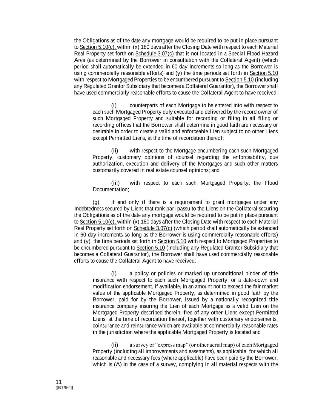 11 [[6727544]] the Obligations as of the date any mortgage would be required to be put in place pursuant to Section 5.10(c), within (x) 180 days after the Closing Date with respect to each Material Real Property set forth on Schedule 3.07(c) that is not located in a Special Flood Hazard Area (as determined by the Borrower in consultation with the Collateral Agent) (which period shall automatically be extended in 60 day increments so long as the Borrower is using commercially reasonable efforts) and (y) the time periods set forth in Section 5.10 with respect to Mortgaged Properties to be encumbered pursuant to Section 5.10 (including any Regulated Grantor Subsidiary that becomes a Collateral Guarantor), the Borrower shall have used commercially reasonable efforts to cause the Collateral Agent to have received: (i) counterparts of each Mortgage to be entered into with respect to each such Mortgaged Property duly executed and delivered by the record owner of such Mortgaged Property and suitable for recording or filing in all filing or recording offices that the Borrower shall determine in good faith are necessary or desirable in order to create a valid and enforceable Lien subject to no other Liens except Permitted Liens, at the time of recordation thereof; (ii) with respect to the Mortgage encumbering each such Mortgaged Property, customary opinions of counsel regarding the enforceability, due authorization, execution and delivery of the Mortgages and such other matters customarily covered in real estate counsel opinions; and (iii) with respect to each such Mortgaged Property, the Flood Documentation; (g) if and only if there is a requirement to grant mortgages under any Indebtedness secured by Liens that rank pari passu to the Liens on the Collateral securing the Obligations as of the date any mortgage would be required to be put in place pursuant to Section 5.10(c), within (x) 180 days after the Closing Date with respect to each Material Real Property set forth on Schedule 3.07(c) (which period shall automatically be extended in 60 day increments so long as the Borrower is using commercially reasonable efforts) and (y) the time periods set forth in Section 5.10 with respect to Mortgaged Properties to be encumbered pursuant to Section 5.10 (including any Regulated Grantor Subsidiary that becomes a Collateral Guarantor), the Borrower shall have used commercially reasonable efforts to cause the Collateral Agent to have received: (i) a policy or policies or marked up unconditional binder of title insurance with respect to each such Mortgaged Property, or a date-down and modification endorsement, if available, in an amount not to exceed the fair market value of the applicable Mortgaged Property, as determined in good faith by the Borrower, paid for by the Borrower, issued by a nationally recognized title insurance company insuring the Lien of each Mortgage as a valid Lien on the Mortgaged Property described therein, free of any other Liens except Permitted Liens, at the time of recordation thereof, together with customary endorsements, coinsurance and reinsurance which are available at commercially reasonable rates in the jurisdiction where the applicable Mortgaged Property is located and (ii) a survey or “express map” (or other aerial map) of each Mortgaged Property (including all improvements and easements), as applicable, for which all reasonable and necessary fees (where applicable) have been paid by the Borrower, which is (A) in the case of a survey, complying in all material respects with the