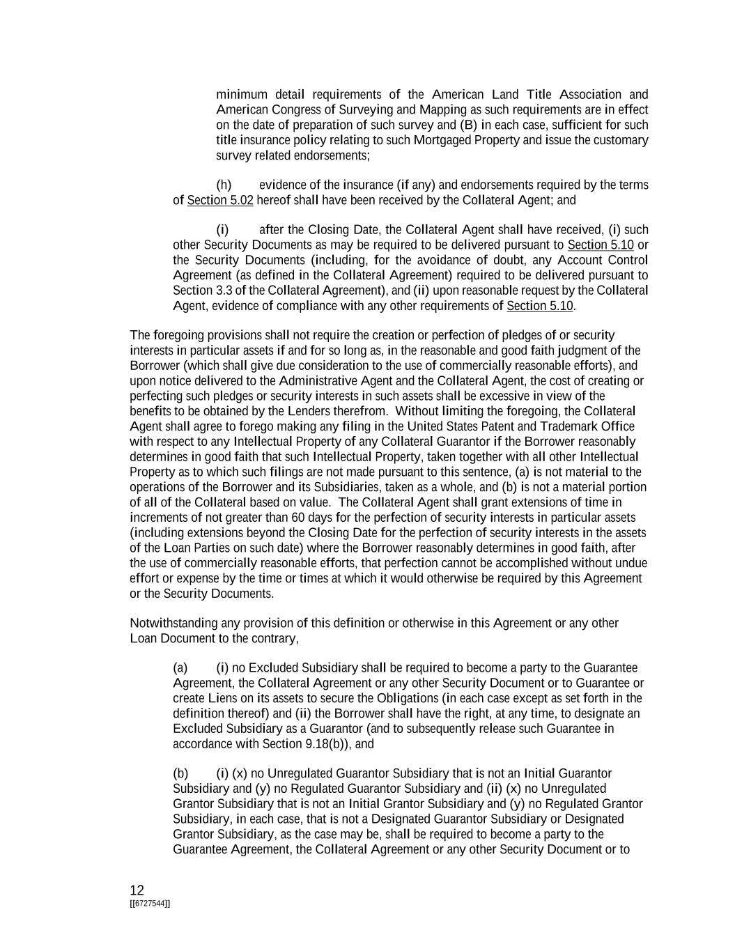 12 [[6727544]] minimum detail requirements of the American Land Title Association and American Congress of Surveying and Mapping as such requirements are in effect on the date of preparation of such survey and (B) in each case, sufficient for such title insurance policy relating to such Mortgaged Property and issue the customary survey related endorsements; (h) evidence of the insurance (if any) and endorsements required by the terms of Section 5.02 hereof shall have been received by the Collateral Agent; and (i) after the Closing Date, the Collateral Agent shall have received, (i) such other Security Documents as may be required to be delivered pursuant to Section 5.10 or the Security Documents (including, for the avoidance of doubt, any Account Control Agreement (as defined in the Collateral Agreement) required to be delivered pursuant to Section 3.3 of the Collateral Agreement), and (ii) upon reasonable request by the Collateral Agent, evidence of compliance with any other requirements of Section 5.10. The foregoing provisions shall not require the creation or perfection of pledges of or security interests in particular assets if and for so long as, in the reasonable and good faith judgment of the Borrower (which shall give due consideration to the use of commercially reasonable efforts), and upon notice delivered to the Administrative Agent and the Collateral Agent, the cost of creating or perfecting such pledges or security interests in such assets shall be excessive in view of the benefits to be obtained by the Lenders therefrom. Without limiting the foregoing, the Collateral Agent shall agree to forego making any filing in the United States Patent and Trademark Office with respect to any Intellectual Property of any Collateral Guarantor if the Borrower reasonably determines in good faith that such Intellectual Property, taken together with all other Intellectual Property as to which such filings are not made pursuant to this sentence, (a) is not material to the operations of the Borrower and its Subsidiaries, taken as a whole, and (b) is not a material portion of all of the Collateral based on value. The Collateral Agent shall grant extensions of time in increments of not greater than 60 days for the perfection of security interests in particular assets (including extensions beyond the Closing Date for the perfection of security interests in the assets of the Loan Parties on such date) where the Borrower reasonably determines in good faith, after the use of commercially reasonable efforts, that perfection cannot be accomplished without undue effort or expense by the time or times at which it would otherwise be required by this Agreement or the Security Documents. Notwithstanding any provision of this definition or otherwise in this Agreement or any other Loan Document to the contrary, (a) (i) no Excluded Subsidiary shall be required to become a party to the Guarantee Agreement, the Collateral Agreement or any other Security Document or to Guarantee or create Liens on its assets to secure the Obligations (in each case except as set forth in the definition thereof) and (ii) the Borrower shall have the right, at any time, to designate an Excluded Subsidiary as a Guarantor (and to subsequently release such Guarantee in accordance with Section 9.18(b)), and (b) (i) (x) no Unregulated Guarantor Subsidiary that is not an Initial Guarantor Subsidiary and (y) no Regulated Guarantor Subsidiary and (ii) (x) no Unregulated Grantor Subsidiary that is not an Initial Grantor Subsidiary and (y) no Regulated Grantor Subsidiary, in each case, that is not a Designated Guarantor Subsidiary or Designated Grantor Subsidiary, as the case may be, shall be required to become a party to the Guarantee Agreement, the Collateral Agreement or any other Security Document or to
