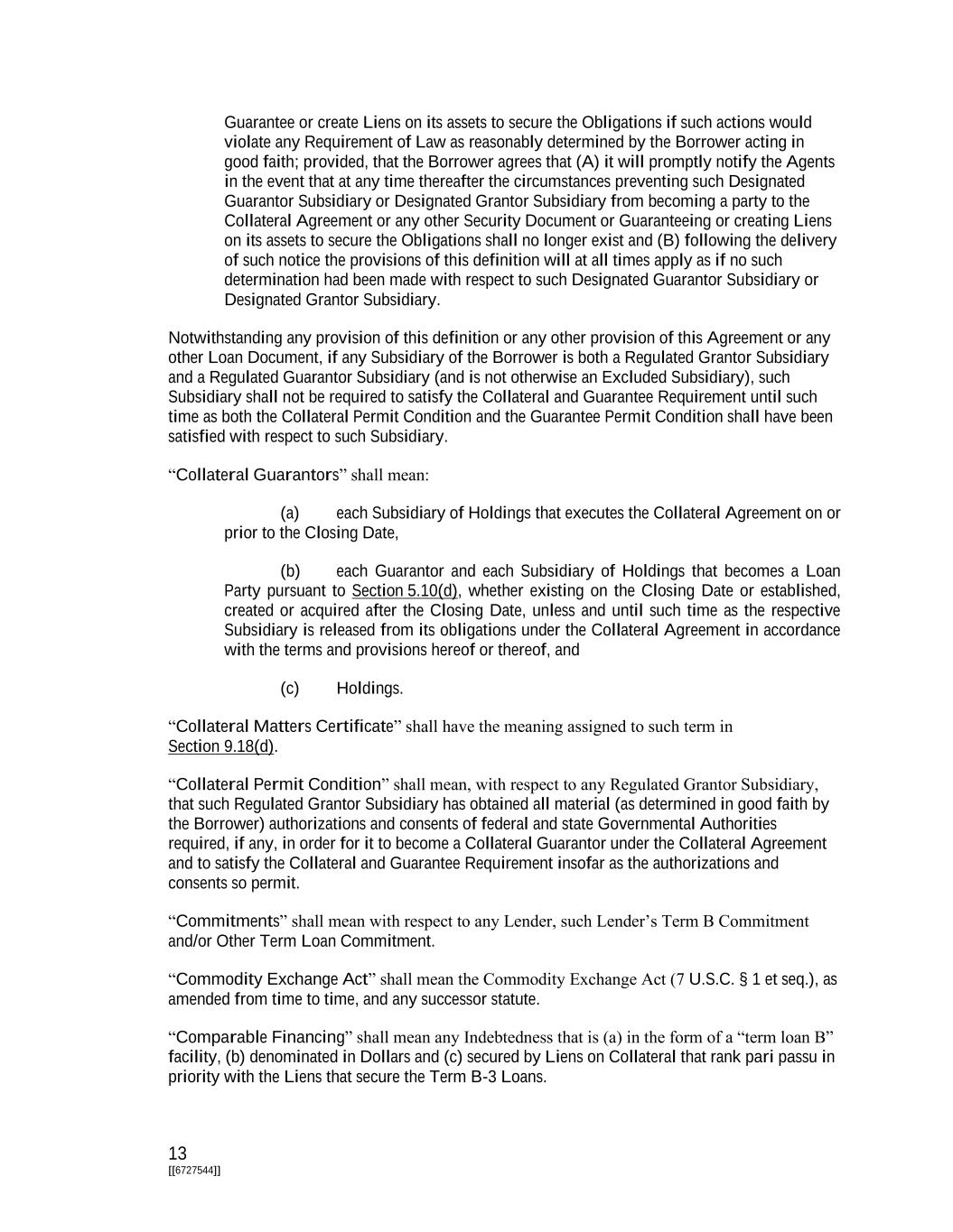 13 [[6727544]] Guarantee or create Liens on its assets to secure the Obligations if such actions would violate any Requirement of Law as reasonably determined by the Borrower acting in good faith; provided, that the Borrower agrees that (A) it will promptly notify the Agents in the event that at any time thereafter the circumstances preventing such Designated Guarantor Subsidiary or Designated Grantor Subsidiary from becoming a party to the Collateral Agreement or any other Security Document or Guaranteeing or creating Liens on its assets to secure the Obligations shall no longer exist and (B) following the delivery of such notice the provisions of this definition will at all times apply as if no such determination had been made with respect to such Designated Guarantor Subsidiary or Designated Grantor Subsidiary. Notwithstanding any provision of this definition or any other provision of this Agreement or any other Loan Document, if any Subsidiary of the Borrower is both a Regulated Grantor Subsidiary and a Regulated Guarantor Subsidiary (and is not otherwise an Excluded Subsidiary), such Subsidiary shall not be required to satisfy the Collateral and Guarantee Requirement until such time as both the Collateral Permit Condition and the Guarantee Permit Condition shall have been satisfied with respect to such Subsidiary. “Collateral Guarantors” shall mean: (a) each Subsidiary of Holdings that executes the Collateral Agreement on or prior to the Closing Date, (b) each Guarantor and each Subsidiary of Holdings that becomes a Loan Party pursuant to Section 5.10(d), whether existing on the Closing Date or established, created or acquired after the Closing Date, unless and until such time as the respective Subsidiary is released from its obligations under the Collateral Agreement in accordance with the terms and provisions hereof or thereof, and (c) Holdings. “Collateral Matters Certificate” shall have the meaning assigned to such term in Section 9.18(d). “Collateral Permit Condition” shall mean, with respect to any Regulated Grantor Subsidiary, that such Regulated Grantor Subsidiary has obtained all material (as determined in good faith by the Borrower) authorizations and consents of federal and state Governmental Authorities required, if any, in order for it to become a Collateral Guarantor under the Collateral Agreement and to satisfy the Collateral and Guarantee Requirement insofar as the authorizations and consents so permit. “Commitments” shall mean with respect to any Lender, such Lender’s Term B Commitment and/or Other Term Loan Commitment. “Commodity Exchange Act” shall mean the Commodity Exchange Act (7 U.S.C. § 1 et seq.), as amended from time to time, and any successor statute. “Comparable Financing” shall mean any Indebtedness that is (a) in the form of a “term loan B” facility, (b) denominated in Dollars and (c) secured by Liens on Collateral that rank pari passu in priority with the Liens that secure the Term B-3 Loans.