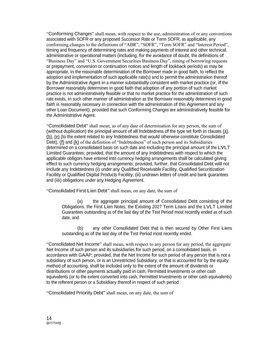 14 [[6727544]] “Conforming Changes” shall mean, with respect to the use, administration of or any conventions associated with SOFR or any proposed Successor Rate or Term SOFR, as applicable, any conforming changes to the definitions of “ABR”, “SOFR”, “Term SOFR” and “Interest Period”, timing and frequency of determining rates and making payments of interest and other technical, administrative or operational matters (including, for the avoidance of doubt, the definitions of “Business Day” and “U.S. Government Securities Business Day”, timing of borrowing requests or prepayment, conversion or continuation notices and length of lookback periods) as may be appropriate, in the reasonable determination of the Borrower made in good faith, to reflect the adoption and implementation of such applicable rate(s) and to permit the administration thereof by the Administrative Agent in a manner substantially consistent with market practice (or, if the Borrower reasonably determines in good faith that adoption of any portion of such market practice is not administratively feasible or that no market practice for the administration of such rate exists, in such other manner of administration as the Borrower reasonably determines in good faith is reasonably necessary in connection with the administration of this Agreement and any other Loan Document); provided that such Conforming Changes are administratively feasible for the Administrative Agent. “Consolidated Debt” shall mean, as of any date of determination for any person, the sum of (without duplication) the principal amount of all Indebtedness of the type set forth in clauses (a), (b), (e) (to the extent related to any Indebtedness that would otherwise constitute Consolidated Debt), (f) and (k) of the definition of “Indebtedness” of such person and its Subsidiaries determined on a consolidated basis on such date and including the principal amount of the LVLT Limited Guarantees; provided, that the amount of any Indebtedness with respect to which the applicable obligors have entered into currency hedging arrangements shall be calculated giving effect to such currency hedging arrangements; provided, further, that Consolidated Debt will not include any Indebtedness (i) under any Qualified Receivable Facility, Qualified Securitization Facility or Qualified Digital Products Facility, (ii) undrawn letters of credit and bank guarantees and (iii) obligations under any Hedging Agreement. “Consolidated First Lien Debt” shall mean, on any date, the sum of (a) the aggregate principal amount of Consolidated Debt consisting of the Obligations, the First Lien Notes, the Existing 2027 Term Loans and the LVLT Limited Guarantees outstanding as of the last day of the Test Period most recently ended as of such date, and (b) any other Consolidated Debt that is then secured by Other First Liens outstanding as of the last day of the Test Period most recently ended. “Consolidated Net Income” shall mean, with respect to any person for any period, the aggregate Net Income of such person and its subsidiaries for such period, on a consolidated basis, in accordance with GAAP; provided, that the Net Income for such period of any person that is not a subsidiary of such person, or is an Unrestricted Subsidiary, or that is accounted for by the equity method of accounting, shall be included only to the extent of the amount of dividends or distributions or other payments actually paid in cash, Permitted Investments or other cash equivalents (or to the extent converted into cash, Permitted Investments or other cash equivalents) to the referent person or a Subsidiary thereof in respect of such period. “Consolidated Priority Debt” shall mean, on any date, the sum of