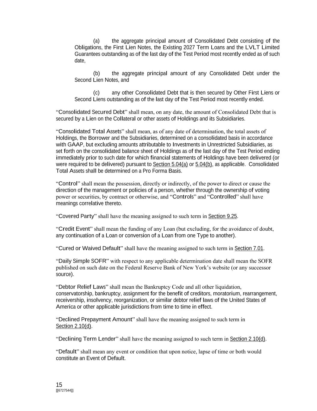 15 [[6727544]] (a) the aggregate principal amount of Consolidated Debt consisting of the Obligations, the First Lien Notes, the Existing 2027 Term Loans and the LVLT Limited Guarantees outstanding as of the last day of the Test Period most recently ended as of such date, (b) the aggregate principal amount of any Consolidated Debt under the Second Lien Notes, and (c) any other Consolidated Debt that is then secured by Other First Liens or Second Liens outstanding as of the last day of the Test Period most recently ended. “Consolidated Secured Debt” shall mean, on any date, the amount of Consolidated Debt that is secured by a Lien on the Collateral or other assets of Holdings and its Subsidiaries. “Consolidated Total Assets” shall mean, as of any date of determination, the total assets of Holdings, the Borrower and the Subsidiaries, determined on a consolidated basis in accordance with GAAP, but excluding amounts attributable to Investments in Unrestricted Subsidiaries, as set forth on the consolidated balance sheet of Holdings as of the last day of the Test Period ending immediately prior to such date for which financial statements of Holdings have been delivered (or were required to be delivered) pursuant to Section 5.04(a) or 5.04(b), as applicable. Consolidated Total Assets shall be determined on a Pro Forma Basis. “Control” shall mean the possession, directly or indirectly, of the power to direct or cause the direction of the management or policies of a person, whether through the ownership of voting power or securities, by contract or otherwise, and “Controls” and “Controlled” shall have meanings correlative thereto. “Covered Party” shall have the meaning assigned to such term in Section 9.25. “Credit Event” shall mean the funding of any Loan (but excluding, for the avoidance of doubt, any continuation of a Loan or conversion of a Loan from one Type to another). “Cured or Waived Default” shall have the meaning assigned to such term in Section 7.01. “Daily Simple SOFR” with respect to any applicable determination date shall mean the SOFR published on such date on the Federal Reserve Bank of New York’s website (or any successor source). “Debtor Relief Laws” shall mean the Bankruptcy Code and all other liquidation, conservatorship, bankruptcy, assignment for the benefit of creditors, moratorium, rearrangement, receivership, insolvency, reorganization, or similar debtor relief laws of the United States of America or other applicable jurisdictions from time to time in effect. “Declined Prepayment Amount” shall have the meaning assigned to such term in Section 2.10(d). “Declining Term Lender” shall have the meaning assigned to such term in Section 2.10(d). “Default” shall mean any event or condition that upon notice, lapse of time or both would constitute an Event of Default.