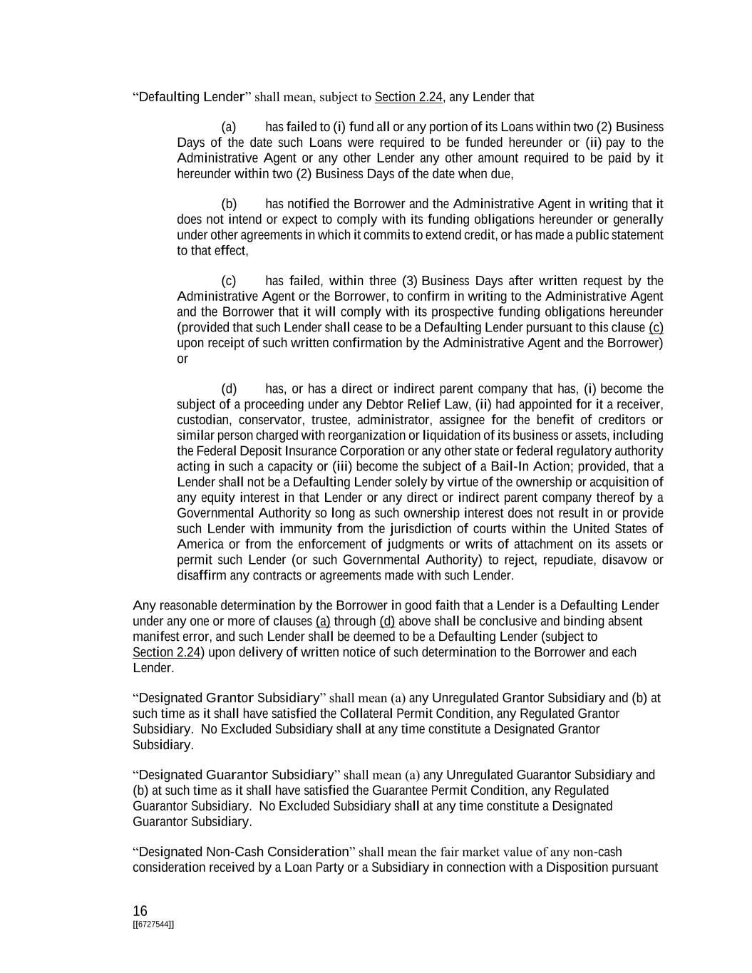 16 [[6727544]] “Defaulting Lender” shall mean, subject to Section 2.24, any Lender that (a) has failed to (i) fund all or any portion of its Loans within two (2) Business Days of the date such Loans were required to be funded hereunder or (ii) pay to the Administrative Agent or any other Lender any other amount required to be paid by it hereunder within two (2) Business Days of the date when due, (b) has notified the Borrower and the Administrative Agent in writing that it does not intend or expect to comply with its funding obligations hereunder or generally under other agreements in which it commits to extend credit, or has made a public statement to that effect, (c) has failed, within three (3) Business Days after written request by the Administrative Agent or the Borrower, to confirm in writing to the Administrative Agent and the Borrower that it will comply with its prospective funding obligations hereunder (provided that such Lender shall cease to be a Defaulting Lender pursuant to this clause (c) upon receipt of such written confirmation by the Administrative Agent and the Borrower) or (d) has, or has a direct or indirect parent company that has, (i) become the subject of a proceeding under any Debtor Relief Law, (ii) had appointed for it a receiver, custodian, conservator, trustee, administrator, assignee for the benefit of creditors or similar person charged with reorganization or liquidation of its business or assets, including the Federal Deposit Insurance Corporation or any other state or federal regulatory authority acting in such a capacity or (iii) become the subject of a Bail-In Action; provided, that a Lender shall not be a Defaulting Lender solely by virtue of the ownership or acquisition of any equity interest in that Lender or any direct or indirect parent company thereof by a Governmental Authority so long as such ownership interest does not result in or provide such Lender with immunity from the jurisdiction of courts within the United States of America or from the enforcement of judgments or writs of attachment on its assets or permit such Lender (or such Governmental Authority) to reject, repudiate, disavow or disaffirm any contracts or agreements made with such Lender. Any reasonable determination by the Borrower in good faith that a Lender is a Defaulting Lender under any one or more of clauses (a) through (d) above shall be conclusive and binding absent manifest error, and such Lender shall be deemed to be a Defaulting Lender (subject to Section 2.24) upon delivery of written notice of such determination to the Borrower and each Lender. “Designated Grantor Subsidiary” shall mean (a) any Unregulated Grantor Subsidiary and (b) at such time as it shall have satisfied the Collateral Permit Condition, any Regulated Grantor Subsidiary. No Excluded Subsidiary shall at any time constitute a Designated Grantor Subsidiary. “Designated Guarantor Subsidiary” shall mean (a) any Unregulated Guarantor Subsidiary and (b) at such time as it shall have satisfied the Guarantee Permit Condition, any Regulated Guarantor Subsidiary. No Excluded Subsidiary shall at any time constitute a Designated Guarantor Subsidiary. “Designated Non-Cash Consideration” shall mean the fair market value of any non-cash consideration received by a Loan Party or a Subsidiary in connection with a Disposition pursuant