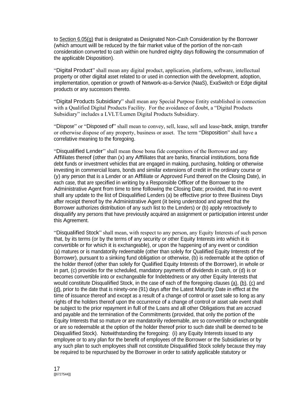 17 [[6727544]] to Section 6.05(g) that is designated as Designated Non-Cash Consideration by the Borrower (which amount will be reduced by the fair market value of the portion of the non-cash consideration converted to cash within one hundred eighty days following the consummation of the applicable Disposition). “Digital Product” shall mean any digital product, application, platform, software, intellectual property or other digital asset related to or used in connection with the development, adoption, implementation, operation or growth of Network-as-a-Service (NaaS), ExaSwitch or Edge digital products or any successors thereto. “Digital Products Subsidiary” shall mean any Special Purpose Entity established in connection with a Qualified Digital Products Facility. For the avoidance of doubt, a “Digital Products Subsidiary” includes a LVLT/Lumen Digital Products Subsidiary. “Dispose” or “Disposed of” shall mean to convey, sell, lease, sell and lease-back, assign, transfer or otherwise dispose of any property, business or asset. The term “Disposition” shall have a correlative meaning to the foregoing. “Disqualified Lender” shall mean those bona fide competitors of the Borrower and any Affiliates thereof (other than (x) any Affiliates that are banks, financial institutions, bona fide debt funds or investment vehicles that are engaged in making, purchasing, holding or otherwise investing in commercial loans, bonds and similar extensions of credit in the ordinary course or (y) any person that is a Lender or an Affiliate or Approved Fund thereof on the Closing Date), in each case, that are specified in writing by a Responsible Officer of the Borrower to the Administrative Agent from time to time following the Closing Date; provided, that in no event shall any update to the list of Disqualified Lenders (a) be effective prior to three Business Days after receipt thereof by the Administrative Agent (it being understood and agreed that the Borrower authorizes distribution of any such list to the Lenders) or (b) apply retroactively to disqualify any persons that have previously acquired an assignment or participation interest under this Agreement. “Disqualified Stock” shall mean, with respect to any person, any Equity Interests of such person that, by its terms (or by the terms of any security or other Equity Interests into which it is convertible or for which it is exchangeable), or upon the happening of any event or condition (a) matures or is mandatorily redeemable (other than solely for Qualified Equity Interests of the Borrower), pursuant to a sinking fund obligation or otherwise, (b) is redeemable at the option of the holder thereof (other than solely for Qualified Equity Interests of the Borrower), in whole or in part, (c) provides for the scheduled, mandatory payments of dividends in cash, or (d) is or becomes convertible into or exchangeable for Indebtedness or any other Equity Interests that would constitute Disqualified Stock, in the case of each of the foregoing clauses (a), (b), (c) and (d), prior to the date that is ninety-one (91) days after the Latest Maturity Date in effect at the time of issuance thereof and except as a result of a change of control or asset sale so long as any rights of the holders thereof upon the occurrence of a change of control or asset sale event shall be subject to the prior repayment in full of the Loans and all other Obligations that are accrued and payable and the termination of the Commitments (provided, that only the portion of the Equity Interests that so mature or are mandatorily redeemable, are so convertible or exchangeable or are so redeemable at the option of the holder thereof prior to such date shall be deemed to be Disqualified Stock). Notwithstanding the foregoing: (i) any Equity Interests issued to any employee or to any plan for the benefit of employees of the Borrower or the Subsidiaries or by any such plan to such employees shall not constitute Disqualified Stock solely because they may be required to be repurchased by the Borrower in order to satisfy applicable statutory or