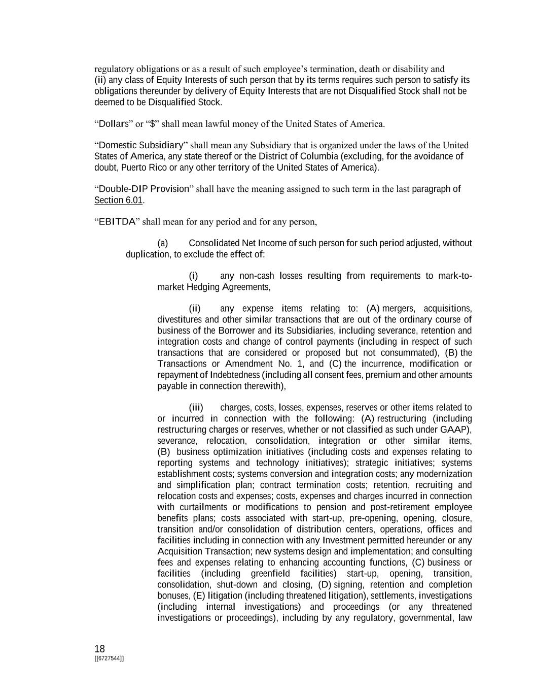 18 [[6727544]] regulatory obligations or as a result of such employee’s termination, death or disability and (ii) any class of Equity Interests of such person that by its terms requires such person to satisfy its obligations thereunder by delivery of Equity Interests that are not Disqualified Stock shall not be deemed to be Disqualified Stock. “Dollars” or “$” shall mean lawful money of the United States of America. “Domestic Subsidiary” shall mean any Subsidiary that is organized under the laws of the United States of America, any state thereof or the District of Columbia (excluding, for the avoidance of doubt, Puerto Rico or any other territory of the United States of America). “Double-DIP Provision” shall have the meaning assigned to such term in the last paragraph of Section 6.01. “EBITDA” shall mean for any period and for any person, (a) Consolidated Net Income of such person for such period adjusted, without duplication, to exclude the effect of: (i) any non-cash losses resulting from requirements to mark-to- market Hedging Agreements, (ii) any expense items relating to: (A) mergers, acquisitions, divestitures and other similar transactions that are out of the ordinary course of business of the Borrower and its Subsidiaries, including severance, retention and integration costs and change of control payments (including in respect of such transactions that are considered or proposed but not consummated), (B) the Transactions or Amendment No. 1, and (C) the incurrence, modification or repayment of Indebtedness (including all consent fees, premium and other amounts payable in connection therewith), (iii) charges, costs, losses, expenses, reserves or other items related to or incurred in connection with the following: (A) restructuring (including restructuring charges or reserves, whether or not classified as such under GAAP), severance, relocation, consolidation, integration or other similar items, (B) business optimization initiatives (including costs and expenses relating to reporting systems and technology initiatives); strategic initiatives; systems establishment costs; systems conversion and integration costs; any modernization and simplification plan; contract termination costs; retention, recruiting and relocation costs and expenses; costs, expenses and charges incurred in connection with curtailments or modifications to pension and post-retirement employee benefits plans; costs associated with start-up, pre-opening, opening, closure, transition and/or consolidation of distribution centers, operations, offices and facilities including in connection with any Investment permitted hereunder or any Acquisition Transaction; new systems design and implementation; and consulting fees and expenses relating to enhancing accounting functions, (C) business or facilities (including greenfield facilities) start-up, opening, transition, consolidation, shut-down and closing, (D) signing, retention and completion bonuses, (E) litigation (including threatened litigation), settlements, investigations (including internal investigations) and proceedings (or any threatened investigations or proceedings), including by any regulatory, governmental, law