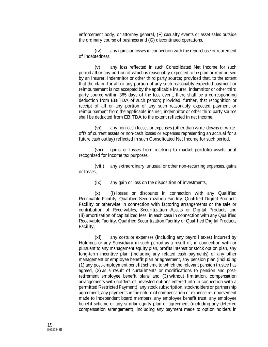 19 [[6727544]] enforcement body, or attorney general, (F) casualty events or asset sales outside the ordinary course of business and (G) discontinued operations, (iv) any gains or losses in connection with the repurchase or retirement of Indebtedness, (v) any loss reflected in such Consolidated Net Income for such period all or any portion of which is reasonably expected to be paid or reimbursed by an insurer, indemnitor or other third party source; provided that, to the extent that the claim for all or any portion of any such reasonably expected payment or reimbursement is not accepted by the applicable insurer, indemnitor or other third party source within 365 days of the loss event, there shall be a corresponding deduction from EBITDA of such person; provided, further, that recognition or receipt of all or any portion of any such reasonably expected payment or reimbursement from the applicable insurer, indemnitor or other third party source shall be deducted from EBITDA to the extent reflected in net income, (vi) any non-cash losses or expenses (other than write-downs or write- offs of current assets or non-cash losses or expenses representing an accrual for a future cash outlay) reflected in such Consolidated Net Income for such period, (vii) gains or losses from marking to market portfolio assets until recognized for income tax purposes, (viii) any extraordinary, unusual or other non-recurring expenses, gains or losses, (ix) any gain or loss on the disposition of investments, (x) (i) losses or discounts in connection with any Qualified Receivable Facility, Qualified Securitization Facility, Qualified Digital Products Facility or otherwise in connection with factoring arrangements or the sale or contribution of Receivables, Securitization Assets or Digital Products and (ii) amortization of capitalized fees, in each case in connection with any Qualified Receivable Facility, Qualified Securitization Facility or Qualified Digital Products Facility, (xi) any costs or expenses (including any payroll taxes) incurred by Holdings or any Subsidiary in such period as a result of, in connection with or pursuant to any management equity plan, profits interest or stock option plan, any long-term incentive plan (including any related cash payments) or any other management or employee benefit plan or agreement, any pension plan (including (1) any post-employment benefit scheme to which the relevant pension trustee has agreed, (2) as a result of curtailments or modifications to pension and post- retirement employee benefit plans and (3) without limitation, compensation arrangements with holders of unvested options entered into in connection with a permitted Restricted Payment), any stock subscription, stockholders or partnership agreement, any payments in the nature of compensation or expense reimbursement made to independent board members, any employee benefit trust, any employee benefit scheme or any similar equity plan or agreement (including any deferred compensation arrangement), including any payment made to option holders in