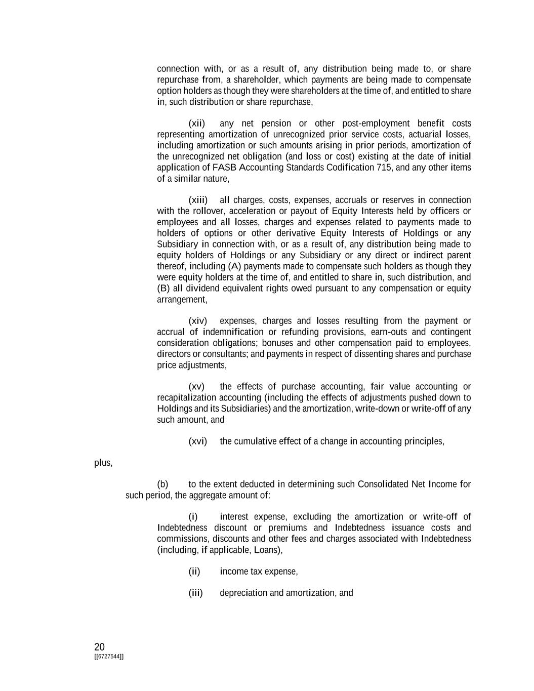 20 [[6727544]] connection with, or as a result of, any distribution being made to, or share repurchase from, a shareholder, which payments are being made to compensate option holders as though they were shareholders at the time of, and entitled to share in, such distribution or share repurchase, (xii) any net pension or other post-employment benefit costs representing amortization of unrecognized prior service costs, actuarial losses, including amortization or such amounts arising in prior periods, amortization of the unrecognized net obligation (and loss or cost) existing at the date of initial application of FASB Accounting Standards Codification 715, and any other items of a similar nature, (xiii) all charges, costs, expenses, accruals or reserves in connection with the rollover, acceleration or payout of Equity Interests held by officers or employees and all losses, charges and expenses related to payments made to holders of options or other derivative Equity Interests of Holdings or any Subsidiary in connection with, or as a result of, any distribution being made to equity holders of Holdings or any Subsidiary or any direct or indirect parent thereof, including (A) payments made to compensate such holders as though they were equity holders at the time of, and entitled to share in, such distribution, and (B) all dividend equivalent rights owed pursuant to any compensation or equity arrangement, (xiv) expenses, charges and losses resulting from the payment or accrual of indemnification or refunding provisions, earn-outs and contingent consideration obligations; bonuses and other compensation paid to employees, directors or consultants; and payments in respect of dissenting shares and purchase price adjustments, (xv) the effects of purchase accounting, fair value accounting or recapitalization accounting (including the effects of adjustments pushed down to Holdings and its Subsidiaries) and the amortization, write-down or write-off of any such amount, and (xvi) the cumulative effect of a change in accounting principles, plus, (b) to the extent deducted in determining such Consolidated Net Income for such period, the aggregate amount of: (i) interest expense, excluding the amortization or write-off of Indebtedness discount or premiums and Indebtedness issuance costs and commissions, discounts and other fees and charges associated with Indebtedness (including, if applicable, Loans), (ii) income tax expense, (iii) depreciation and amortization, and