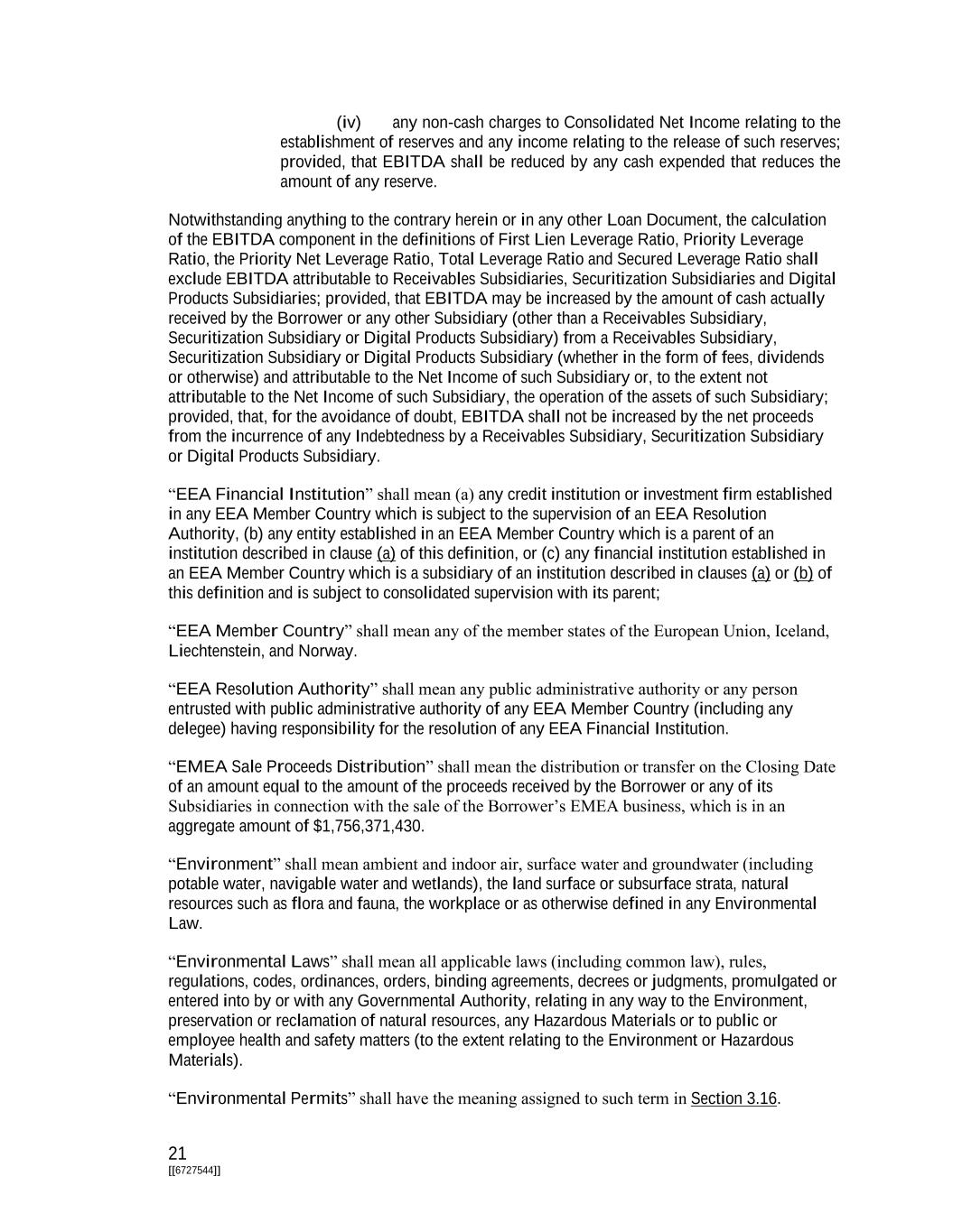 21 [[6727544]] (iv) any non-cash charges to Consolidated Net Income relating to the establishment of reserves and any income relating to the release of such reserves; provided, that EBITDA shall be reduced by any cash expended that reduces the amount of any reserve. Notwithstanding anything to the contrary herein or in any other Loan Document, the calculation of the EBITDA component in the definitions of First Lien Leverage Ratio, Priority Leverage Ratio, the Priority Net Leverage Ratio, Total Leverage Ratio and Secured Leverage Ratio shall exclude EBITDA attributable to Receivables Subsidiaries, Securitization Subsidiaries and Digital Products Subsidiaries; provided, that EBITDA may be increased by the amount of cash actually received by the Borrower or any other Subsidiary (other than a Receivables Subsidiary, Securitization Subsidiary or Digital Products Subsidiary) from a Receivables Subsidiary, Securitization Subsidiary or Digital Products Subsidiary (whether in the form of fees, dividends or otherwise) and attributable to the Net Income of such Subsidiary or, to the extent not attributable to the Net Income of such Subsidiary, the operation of the assets of such Subsidiary; provided, that, for the avoidance of doubt, EBITDA shall not be increased by the net proceeds from the incurrence of any Indebtedness by a Receivables Subsidiary, Securitization Subsidiary or Digital Products Subsidiary. “EEA Financial Institution” shall mean (a) any credit institution or investment firm established in any EEA Member Country which is subject to the supervision of an EEA Resolution Authority, (b) any entity established in an EEA Member Country which is a parent of an institution described in clause (a) of this definition, or (c) any financial institution established in an EEA Member Country which is a subsidiary of an institution described in clauses (a) or (b) of this definition and is subject to consolidated supervision with its parent; “EEA Member Country” shall mean any of the member states of the European Union, Iceland, Liechtenstein, and Norway. “EEA Resolution Authority” shall mean any public administrative authority or any person entrusted with public administrative authority of any EEA Member Country (including any delegee) having responsibility for the resolution of any EEA Financial Institution. “EMEA Sale Proceeds Distribution” shall mean the distribution or transfer on the Closing Date of an amount equal to the amount of the proceeds received by the Borrower or any of its Subsidiaries in connection with the sale of the Borrower’s EMEA business, which is in an aggregate amount of $1,756,371,430. “Environment” shall mean ambient and indoor air, surface water and groundwater (including potable water, navigable water and wetlands), the land surface or subsurface strata, natural resources such as flora and fauna, the workplace or as otherwise defined in any Environmental Law. “Environmental Laws” shall mean all applicable laws (including common law), rules, regulations, codes, ordinances, orders, binding agreements, decrees or judgments, promulgated or entered into by or with any Governmental Authority, relating in any way to the Environment, preservation or reclamation of natural resources, any Hazardous Materials or to public or employee health and safety matters (to the extent relating to the Environment or Hazardous Materials). “Environmental Permits” shall have the meaning assigned to such term in Section 3.16.