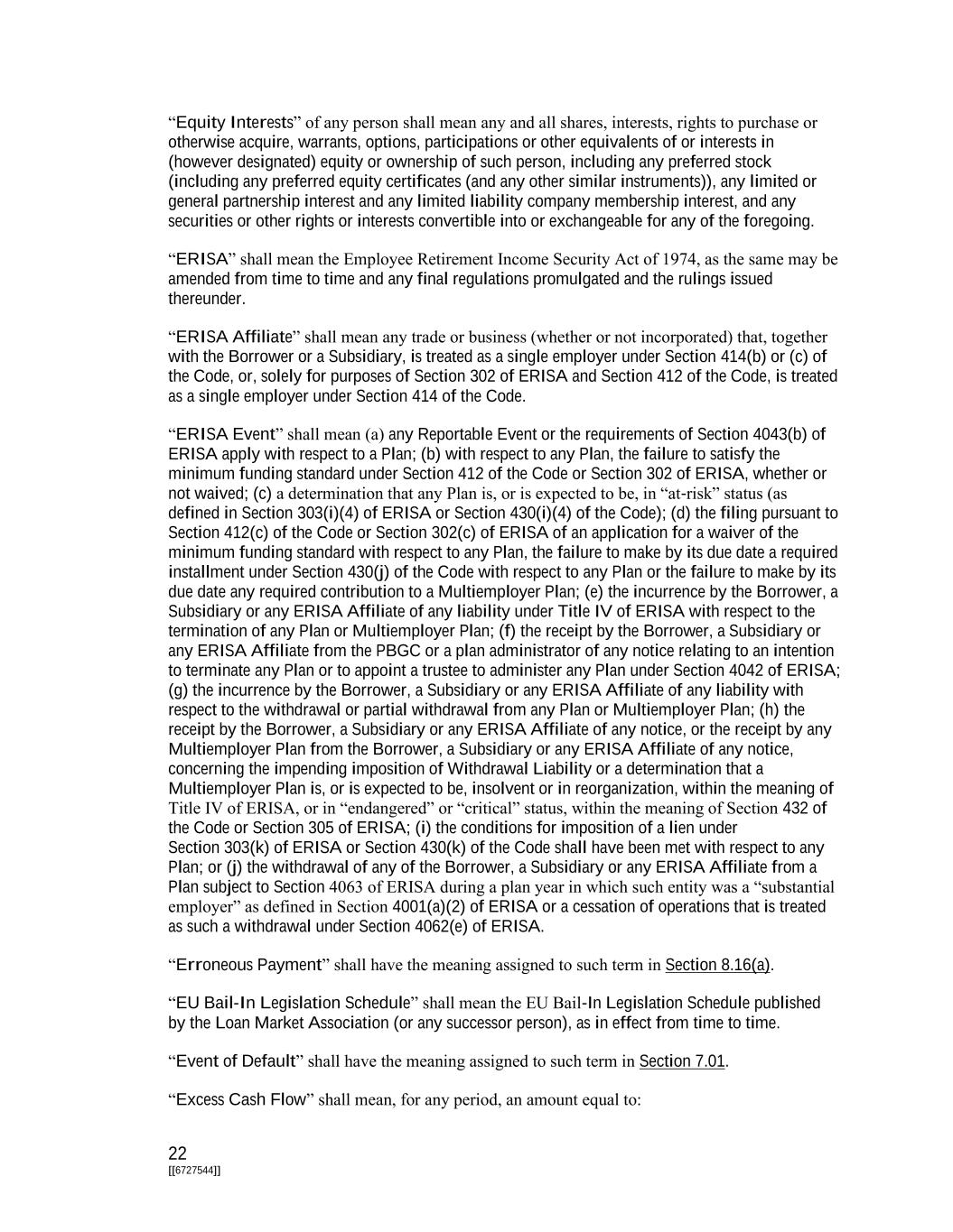 22 [[6727544]] “Equity Interests” of any person shall mean any and all shares, interests, rights to purchase or otherwise acquire, warrants, options, participations or other equivalents of or interests in (however designated) equity or ownership of such person, including any preferred stock (including any preferred equity certificates (and any other similar instruments)), any limited or general partnership interest and any limited liability company membership interest, and any securities or other rights or interests convertible into or exchangeable for any of the foregoing. “ERISA” shall mean the Employee Retirement Income Security Act of 1974, as the same may be amended from time to time and any final regulations promulgated and the rulings issued thereunder. “ERISA Affiliate” shall mean any trade or business (whether or not incorporated) that, together with the Borrower or a Subsidiary, is treated as a single employer under Section 414(b) or (c) of the Code, or, solely for purposes of Section 302 of ERISA and Section 412 of the Code, is treated as a single employer under Section 414 of the Code. “ERISA Event” shall mean (a) any Reportable Event or the requirements of Section 4043(b) of ERISA apply with respect to a Plan; (b) with respect to any Plan, the failure to satisfy the minimum funding standard under Section 412 of the Code or Section 302 of ERISA, whether or not waived; (c) a determination that any Plan is, or is expected to be, in “at-risk” status (as defined in Section 303(i)(4) of ERISA or Section 430(i)(4) of the Code); (d) the filing pursuant to Section 412(c) of the Code or Section 302(c) of ERISA of an application for a waiver of the minimum funding standard with respect to any Plan, the failure to make by its due date a required installment under Section 430(j) of the Code with respect to any Plan or the failure to make by its due date any required contribution to a Multiemployer Plan; (e) the incurrence by the Borrower, a Subsidiary or any ERISA Affiliate of any liability under Title IV of ERISA with respect to the termination of any Plan or Multiemployer Plan; (f) the receipt by the Borrower, a Subsidiary or any ERISA Affiliate from the PBGC or a plan administrator of any notice relating to an intention to terminate any Plan or to appoint a trustee to administer any Plan under Section 4042 of ERISA; (g) the incurrence by the Borrower, a Subsidiary or any ERISA Affiliate of any liability with respect to the withdrawal or partial withdrawal from any Plan or Multiemployer Plan; (h) the receipt by the Borrower, a Subsidiary or any ERISA Affiliate of any notice, or the receipt by any Multiemployer Plan from the Borrower, a Subsidiary or any ERISA Affiliate of any notice, concerning the impending imposition of Withdrawal Liability or a determination that a Multiemployer Plan is, or is expected to be, insolvent or in reorganization, within the meaning of Title IV of ERISA, or in “endangered” or “critical” status, within the meaning of Section 432 of the Code or Section 305 of ERISA; (i) the conditions for imposition of a lien under Section 303(k) of ERISA or Section 430(k) of the Code shall have been met with respect to any Plan; or (j) the withdrawal of any of the Borrower, a Subsidiary or any ERISA Affiliate from a Plan subject to Section 4063 of ERISA during a plan year in which such entity was a “substantial employer” as defined in Section 4001(a)(2) of ERISA or a cessation of operations that is treated as such a withdrawal under Section 4062(e) of ERISA. “Erroneous Payment” shall have the meaning assigned to such term in Section 8.16(a). “EU Bail-In Legislation Schedule” shall mean the EU Bail-In Legislation Schedule published by the Loan Market Association (or any successor person), as in effect from time to time. “Event of Default” shall have the meaning assigned to such term in Section 7.01. “Excess Cash Flow” shall mean, for any period, an amount equal to: